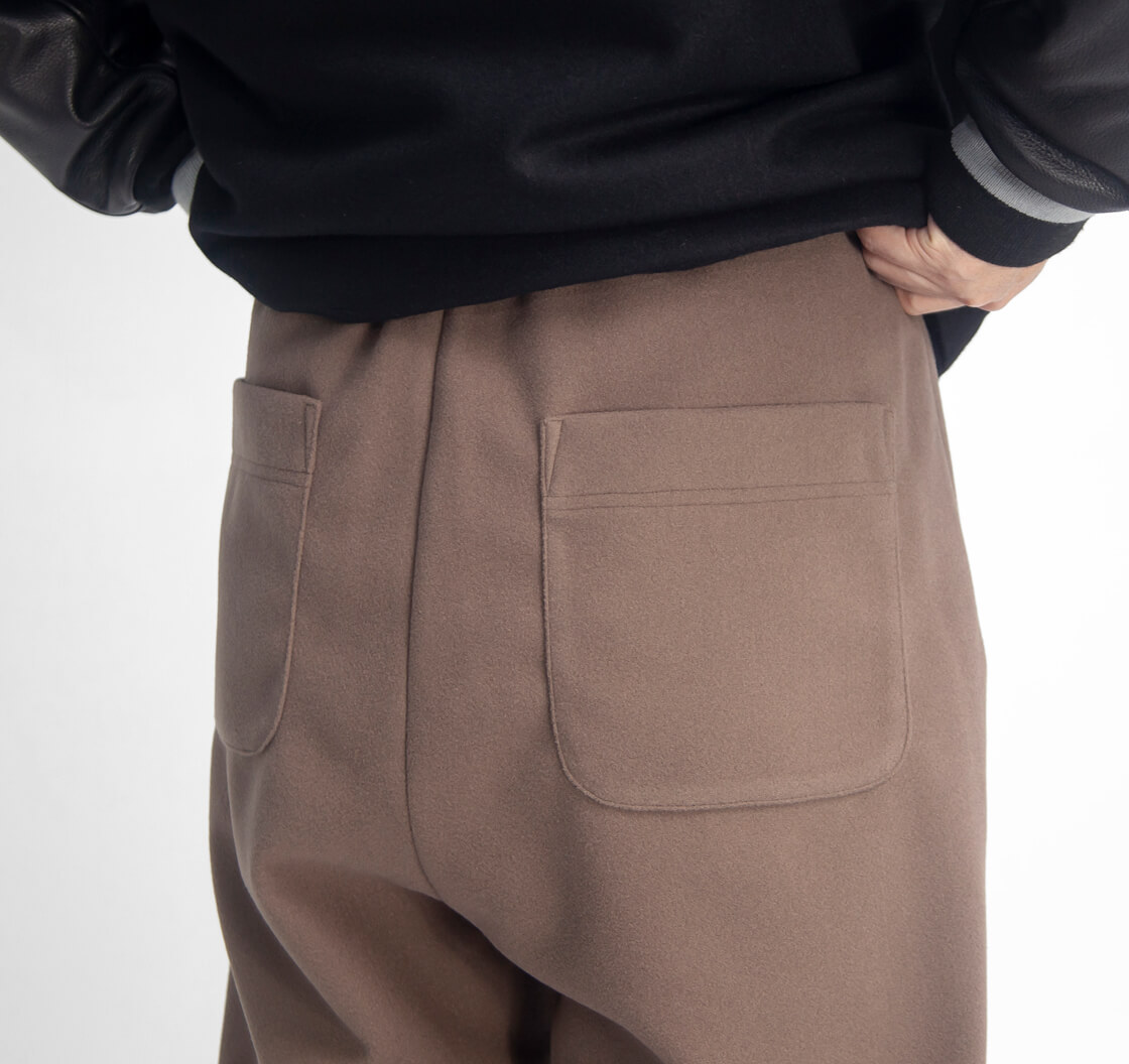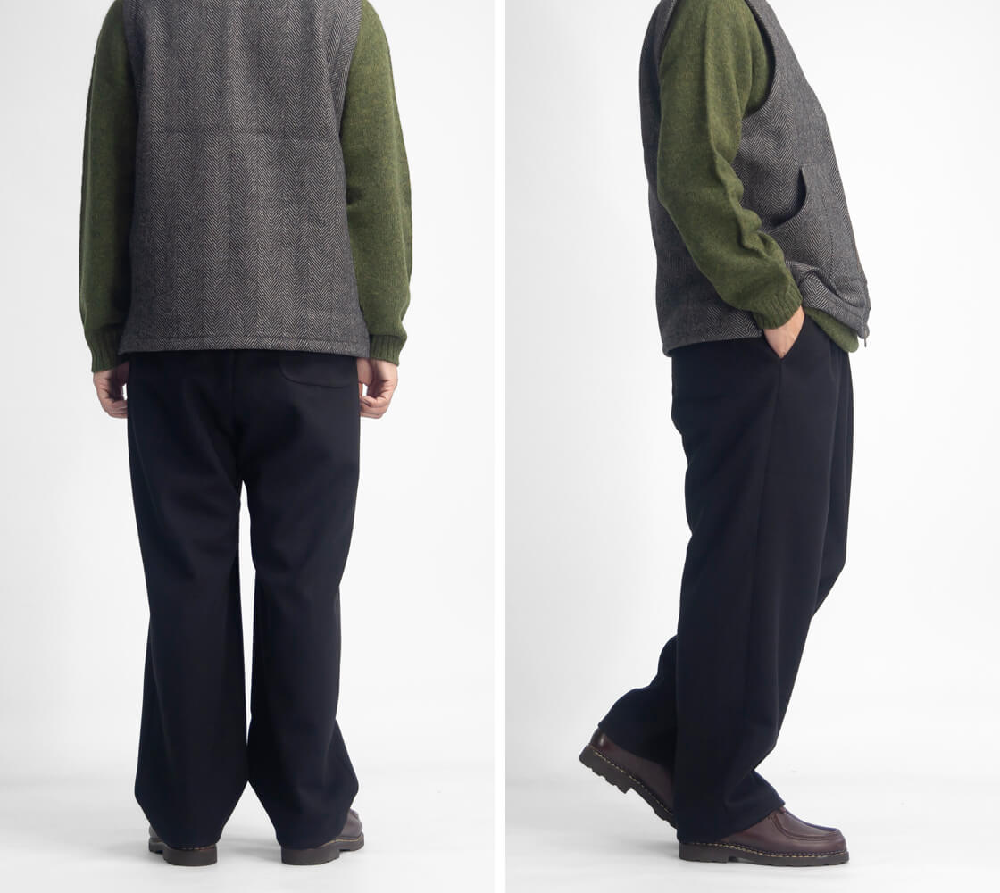 sogliaからメルトンライクな質感を持つワイドイージーパンツのご紹介。 ポリエステルながら上品な厚みで、2タックや裾のドローコードで表情の変化を楽しめる仕様。 ゆったりしたワイドシルエットは、裾を絞ればバルーンラインにも変化。 裏地を膝まで配することで防風性と滑らかな穿き心地を実現します。 素材は軽さと伸縮性、柔らかさを持つウーリッシュメルトンジャージー。 ウールのような上品さでチクチクしづらく洗濯もできる扱いやすさを両立します。 日常で品良く使え、冬の装いに奥行きを与える頼れる一本です。