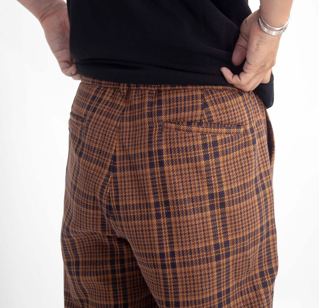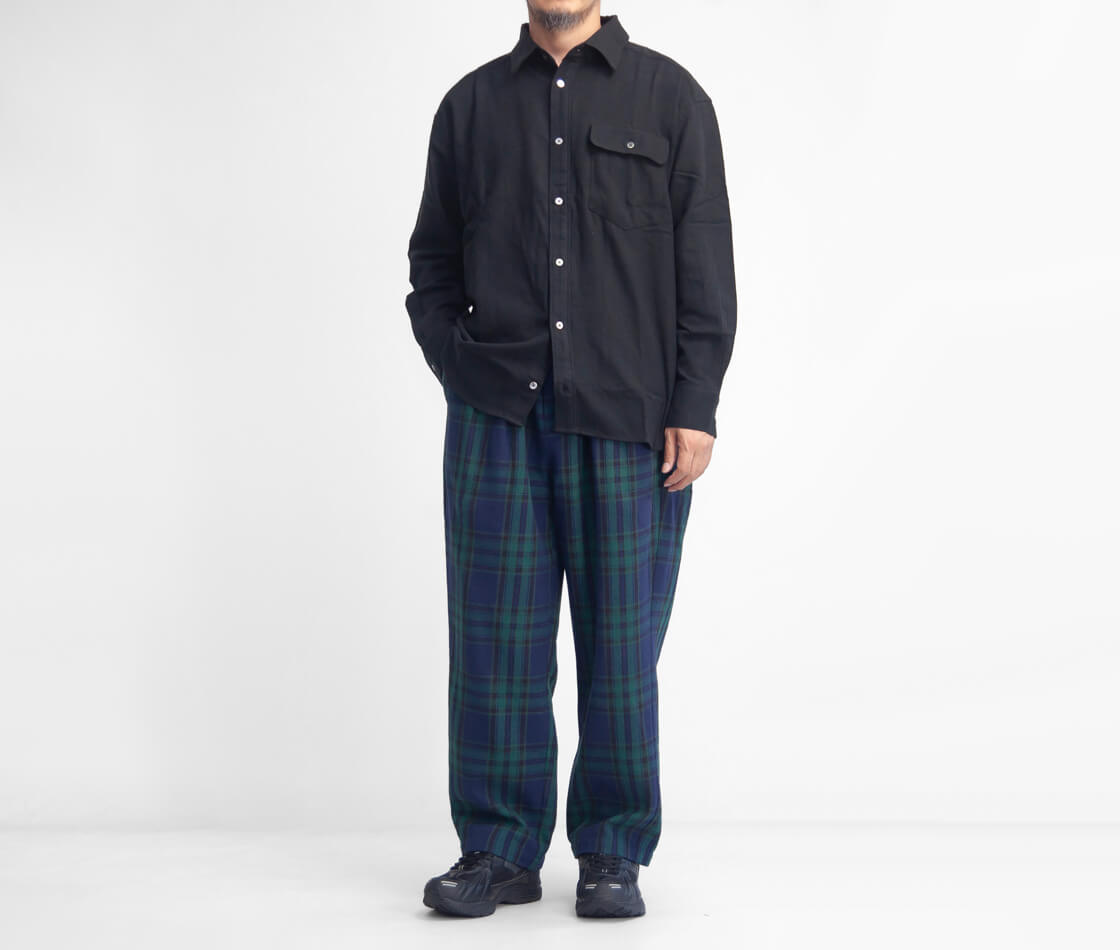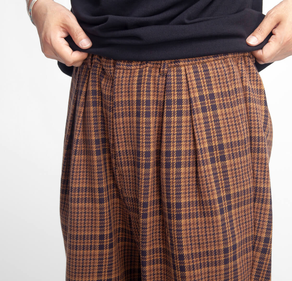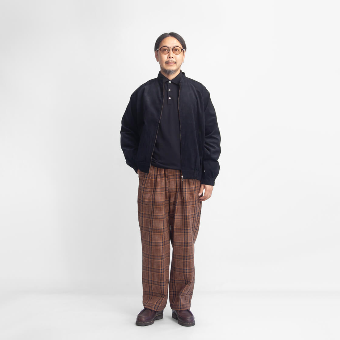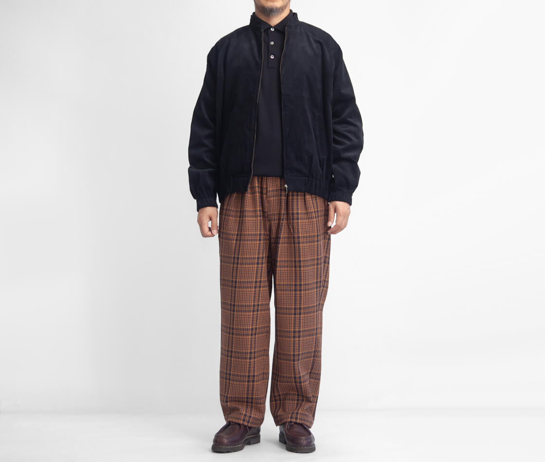 Upscape Audienceから、クラシックな英国調チェックを落とし込んだワイドイージーパンツのご紹介。 10/2コットンヘビーツイルを使用し、インド織物特有の甘めの織りによる柔らかな穿き心地を実現。 厚みのある生地ながら、くったりとした落ち感が特徴です。 ウエストはゴムとドローコードを備えたイージー仕様で、ベルトループやファスナー開きも完備。 後ろは片玉縁ポケットでスッキリとした印象に。 大柄のチェックも落ち着いた配色で派手にならず、秋冬らしい温かみのある表情を演出。 シルエットは深めの股上と2タックで腰回りにゆとりを持たせ、裾にかけて緩やかなテーパードを効かせています。 シンプルなトップスを合わせるだけで存在感を放つ一本で、スタイリングの主役になる一本です。