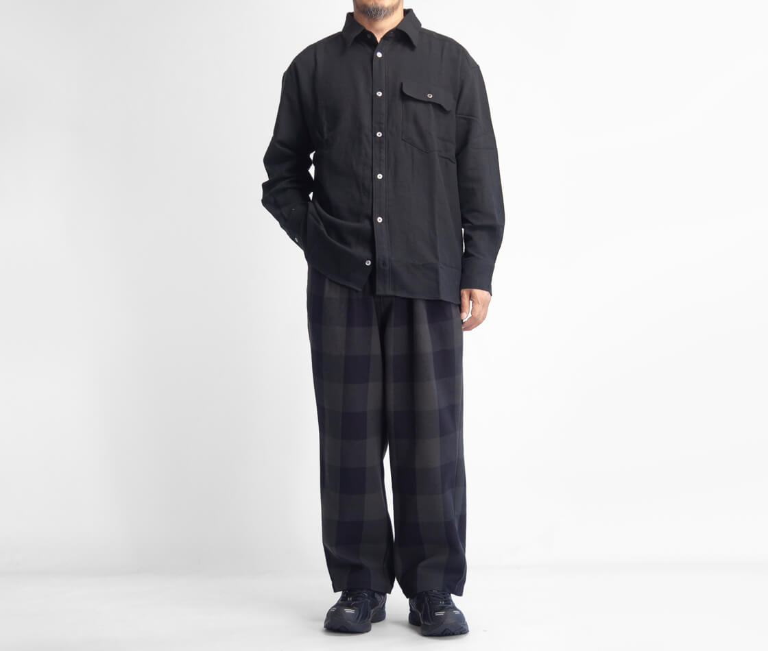 M / ウエスト78-88 / レングス69 / 股上37 / ワタリ36 / 裾幅23 モデル着用 170cm/62kgでMサイズ 素材 綿100% カラー展開 ブラックウォッチ、チャコールバッファロー、キャメルチドリ 生産国 日本 モデル着用コメント Mサイズを着用しました。僕の場合ウエストは内蔵のゴムだけでもジャストで着用出来ますがドローコードを使った方が安心感があります。股上は深めでワタリもゆったりとしているので、特にタイトな部分はなく全体的な穿き心地はリラックス感がありました。ウエストの固定位置にもよりますがレングスは気持ちクッションするぐらいの長さでいい感じに抜け感があります。Lサイズでもそこまで問題はないですが、少し野暮ったさが出てしまうので着用するならMサイズがしっくり来ますね。 スタッフ着用コメント Lサイズを着用しました。ウエストは内蔵されているゴムとドローコードでウエストに合わせてしっかりフィットさせられます。太ももやヒップ周りなど全体的にゆとりを持ったワイドな作りですが、とろみのある生地で落ち感があるので、シルエットを拾いすぎず太すぎる見た目にはなりません。レングスはウエストの固定位置にも寄りますが、ハイウエスト気味に穿いてくるぶしが隠れるぐらいの丁度いい長さです。Lサイズでもばっちりですが、ウエストに合わせたり丈感を気持ちスッキリとさせるならMサイズでも良いです。 |