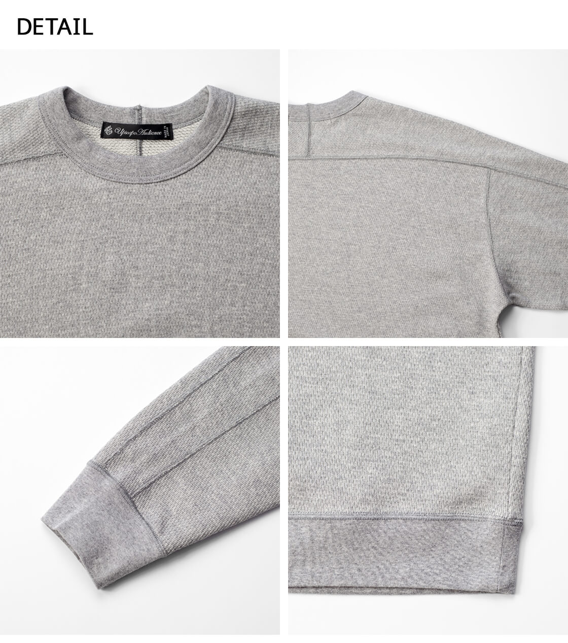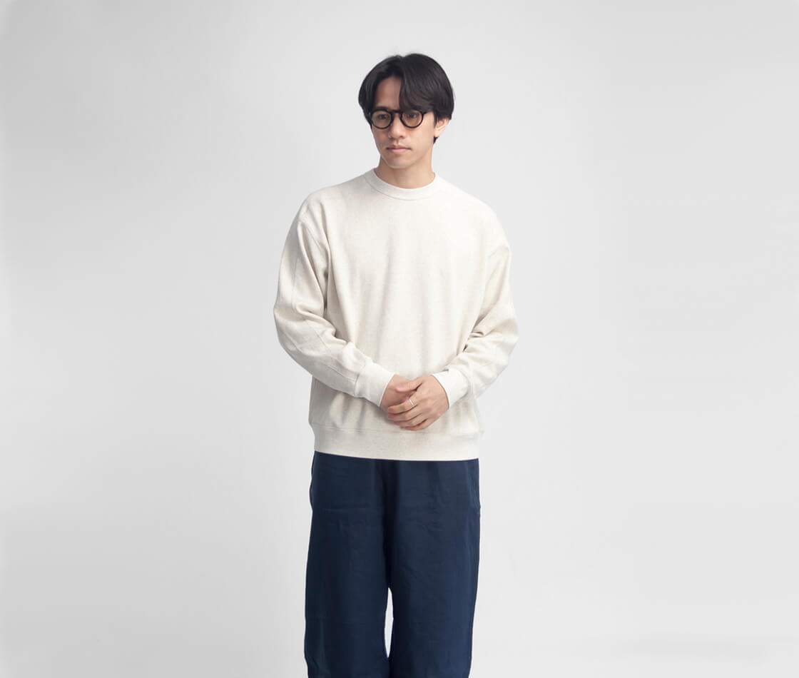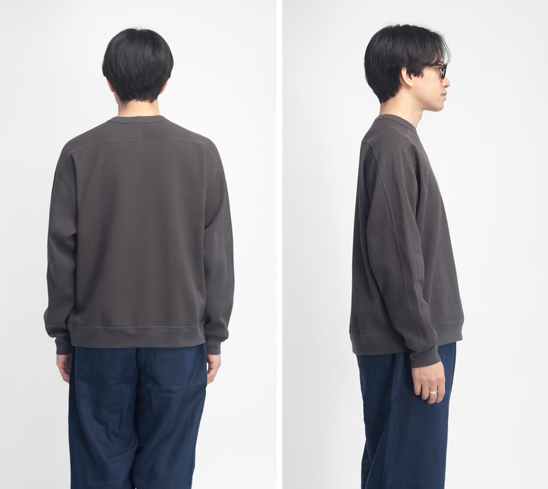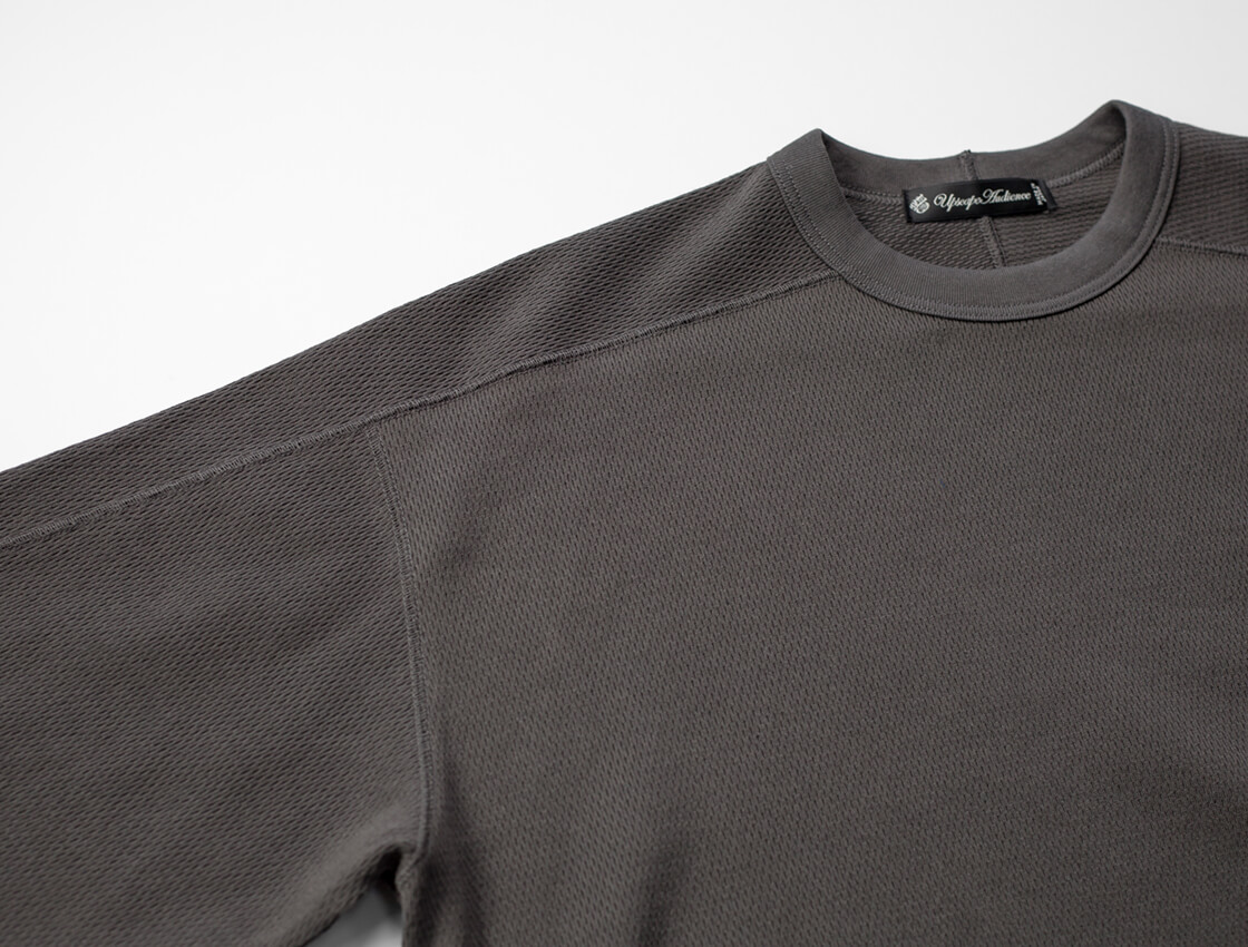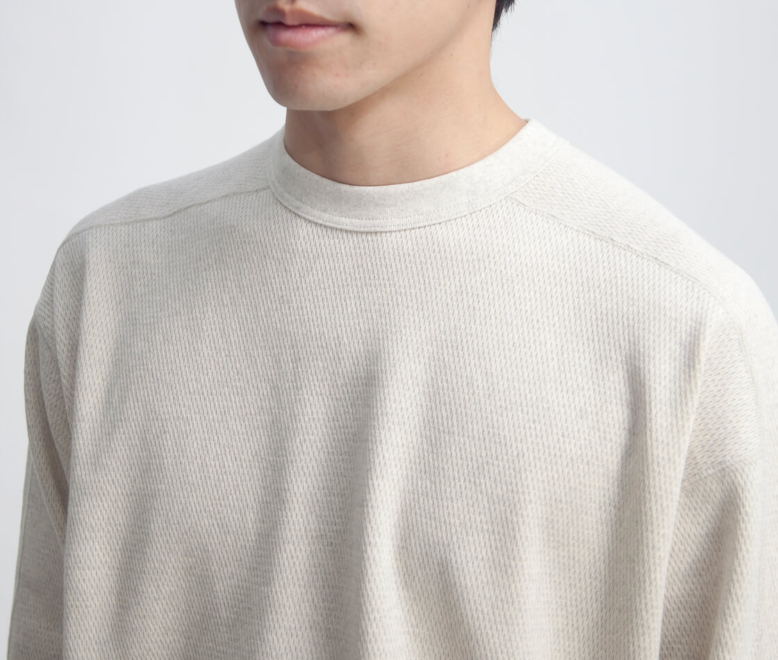 ヴィンテージ感と都会的な表情をあわせ持つ、現代的サーマル。 ヴィンテージのミリタリーを彷彿させるハニカム生地を用いた「OPEN END HONEYCOMB KNIT-SEW」。首元から肩、袖へとつながるヨークスリーブは、セットインとラグランの中間のような設計。肩が動かしやすいだけでなく、肩がはっているように見えにくく、見た目と実用性を両立しています。肩幅を気にしなくていいのも嬉しいポイントです。身幅にはゆとりを持たせ、着丈はすっきりと整えたボックスシルエット。スウェットのようなリラックス感がありながら、だらしなく見えないバランスに仕上げています。無骨な印象になりがちなサーマル生地も、リブの色味を統一することで洗練された雰囲気に。適度な厚みとハリがあるため、体のラインを拾いすぎず一枚でも安心して着用可能。ゆったりとしたシャツやアウターのインナーとしても、リブがすっきりと収まり、レイヤードスタイルにも活躍します。 ![]() ラグランとセットインの良いとこどり。肩回りが動かしやすく、すっきりともたつかない仕様。 ![]() 空気をまとうような軽やかなハニカムサーマル生地。 生地には、空紡糸(オープンエンド糸)を用いたハニカムサーマルを採用。空気の力で撚り合わせた糸は、外側は撚りが強くシャリ感があり、中心は撚りが甘く柔らかい構造。そのため、ふっくらとしたボリューム感がありながらも、肌当たりはさらっと快適です。その空紡糸をハニカム状に編み立てることで、生地内部に空気をしっかりと含ませ、見た目以上に軽やかな着心地を実現。肌との間に空気層が生まれることで保温性も備えつつ、一般的なスウェット生地よりも軽く、乾きやすく、シワになりにくいのも嬉しいですね。古くからニット産地として知られる和歌山県で編み立てられ、確かな技術に裏打ちされた安心感も魅力のひとつです。 ![]() ![]() 身長168cm、体重65kgの男性がMサイズ着用。