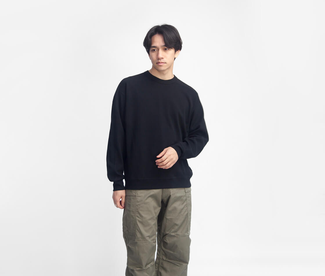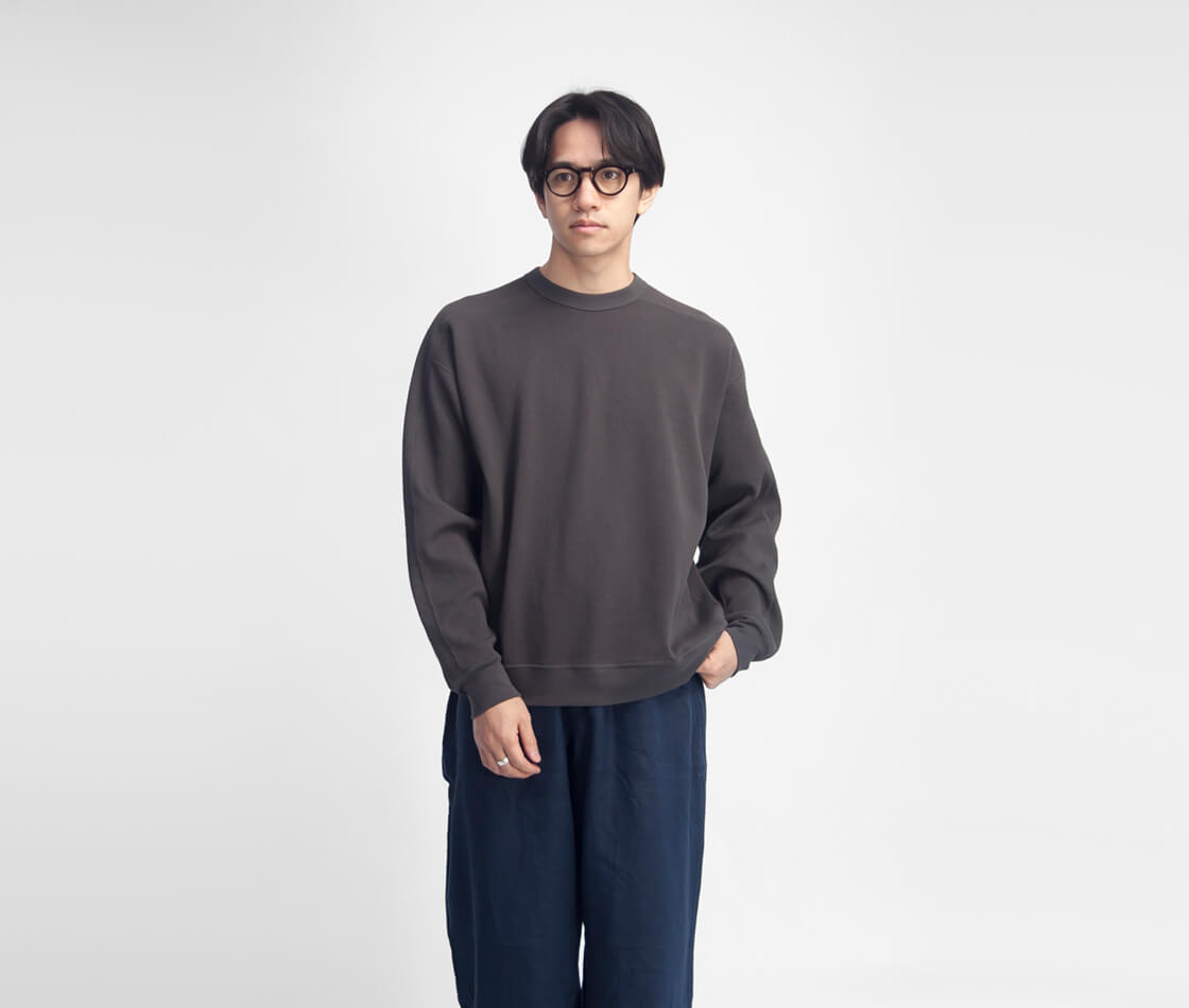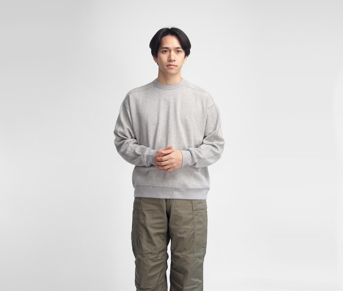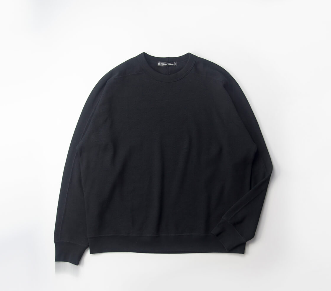 ヴィンテージ感と都会的な表情をあわせ持つ、現代的サーマル。 ヴィンテージのミリタリーを彷彿させるハニカム生地を用いた「OPEN END HONEYCOMB KNIT-SEW」。首元から肩、袖へとつながるヨークスリーブは、セットインとラグランの中間のような設計。肩が動かしやすいだけでなく、肩がはっているように見えにくく、見た目と実用性を両立しています。肩幅を気にしなくていいのも嬉しいポイントです。身幅にはゆとりを持たせ、着丈はすっきりと整えたボックスシルエット。スウェットのようなリラックス感がありながら、だらしなく見えないバランスに仕上げています。無骨な印象になりがちなサーマル生地も、リブの色味を統一することで洗練された雰囲気に。適度な厚みとハリがあるため、体のラインを拾いすぎず一枚でも安心して着用可能。ゆったりとしたシャツやアウターのインナーとしても、リブがすっきりと収まり、レイヤードスタイルにも活躍します。 ![]() ラグランとセットインの良いとこどり。肩回りが動かしやすく、すっきりともたつかない仕様。 ![]() 空気をまとうような軽やかなハニカムサーマル生地。 生地には、空紡糸(オープンエンド糸)を用いたハニカムサーマルを採用。空気の力で撚り合わせた糸は、外側は撚りが強くシャリ感があり、中心は撚りが甘く柔らかい構造。そのため、ふっくらとしたボリューム感がありながらも、肌当たりはさらっと快適です。その空紡糸をハニカム状に編み立てることで、生地内部に空気をしっかりと含ませ、見た目以上に軽やかな着心地を実現。肌との間に空気層が生まれることで保温性も備えつつ、一般的なスウェット生地よりも軽く、乾きやすく、シワになりにくいのも嬉しいですね。古くからニット産地として知られる和歌山県で編み立てられ、確かな技術に裏打ちされた安心感も魅力のひとつです。 ![]() ![]() 身長168cm、体重65kgの男性がMサイズ着用。