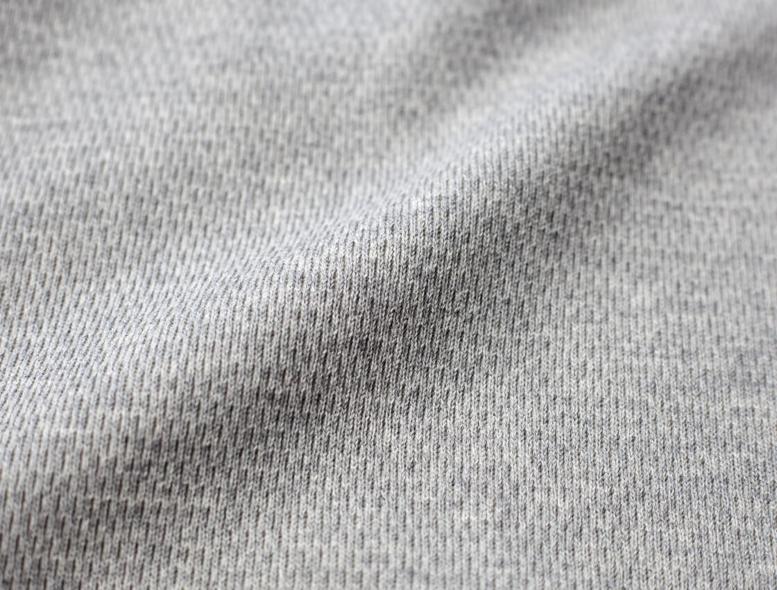 空紡糸をハニカム状に編み立てた生地は、ほどよいハリとシャリ感、ふくらみのある軽やかな着心地が特徴。