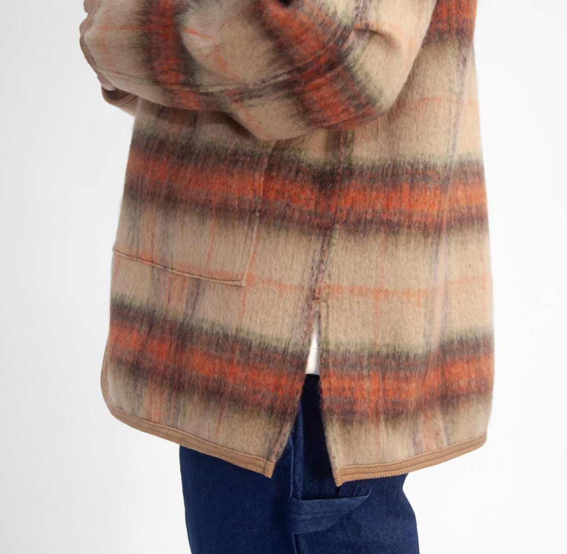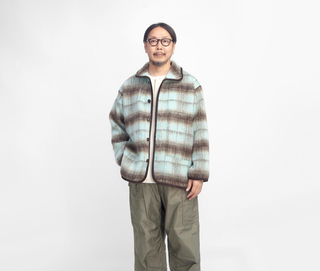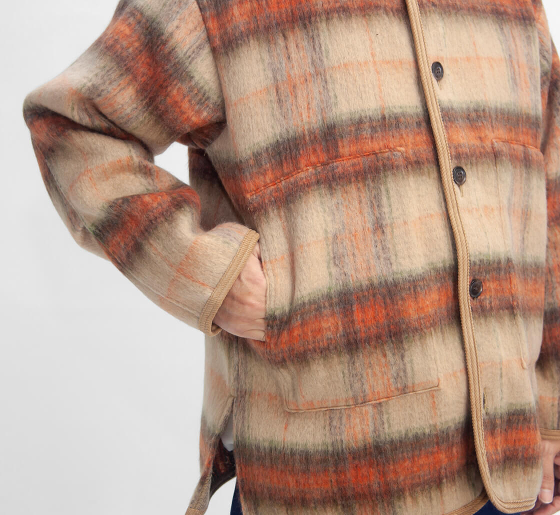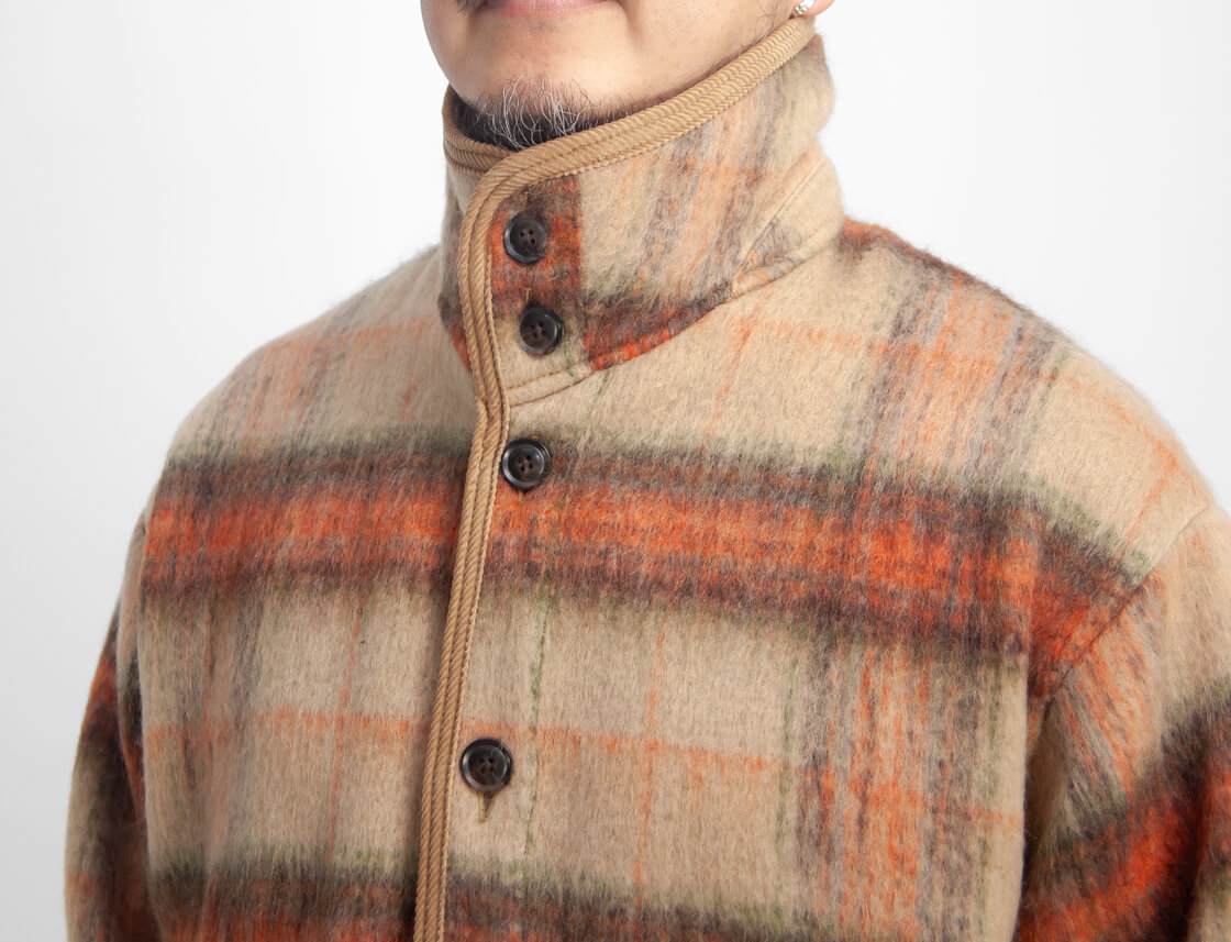 Upscape Audienceからモヘヤライクなシャギー素材のレトロなスタンドカラージャケットのご紹介。 やや高めのスタンドカラーは立てても寝かせても決まり、コーデュロイのパイピングがさりげないアクセントになります。 ゆったりと羽織れるサイズで厚手のインナーにも対応し、深めのスリットで動きやすさを確保。 ウールとリサイクルポリエステルを組み合わせたECOLANAで、軽さと暖かさを両立しつつ扱いやすい点も魅力です。 毛足の表情とチェック柄が存在感を放ち、シンプルな着こなしでもサマになる便利な秋冬アウターです。