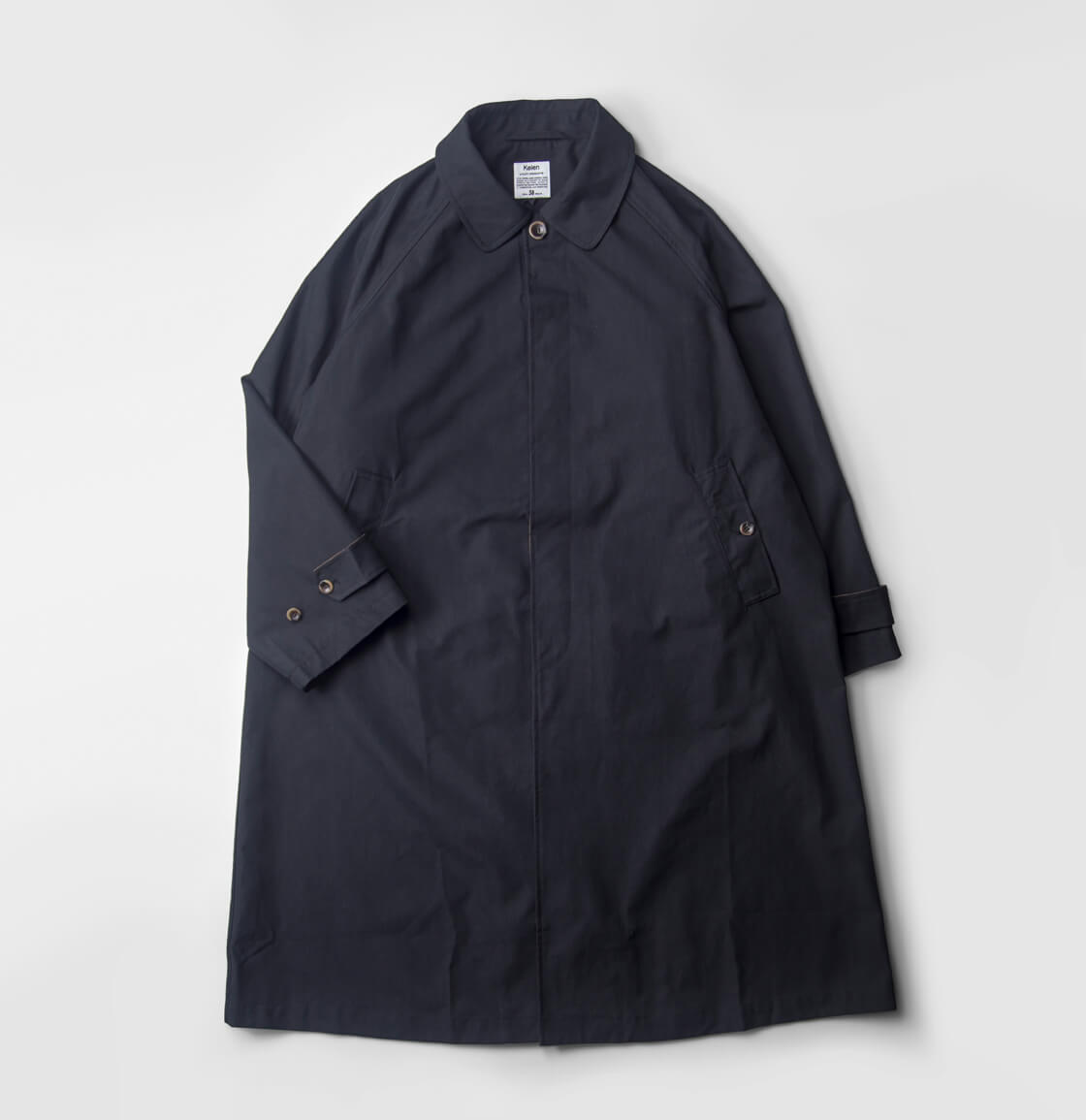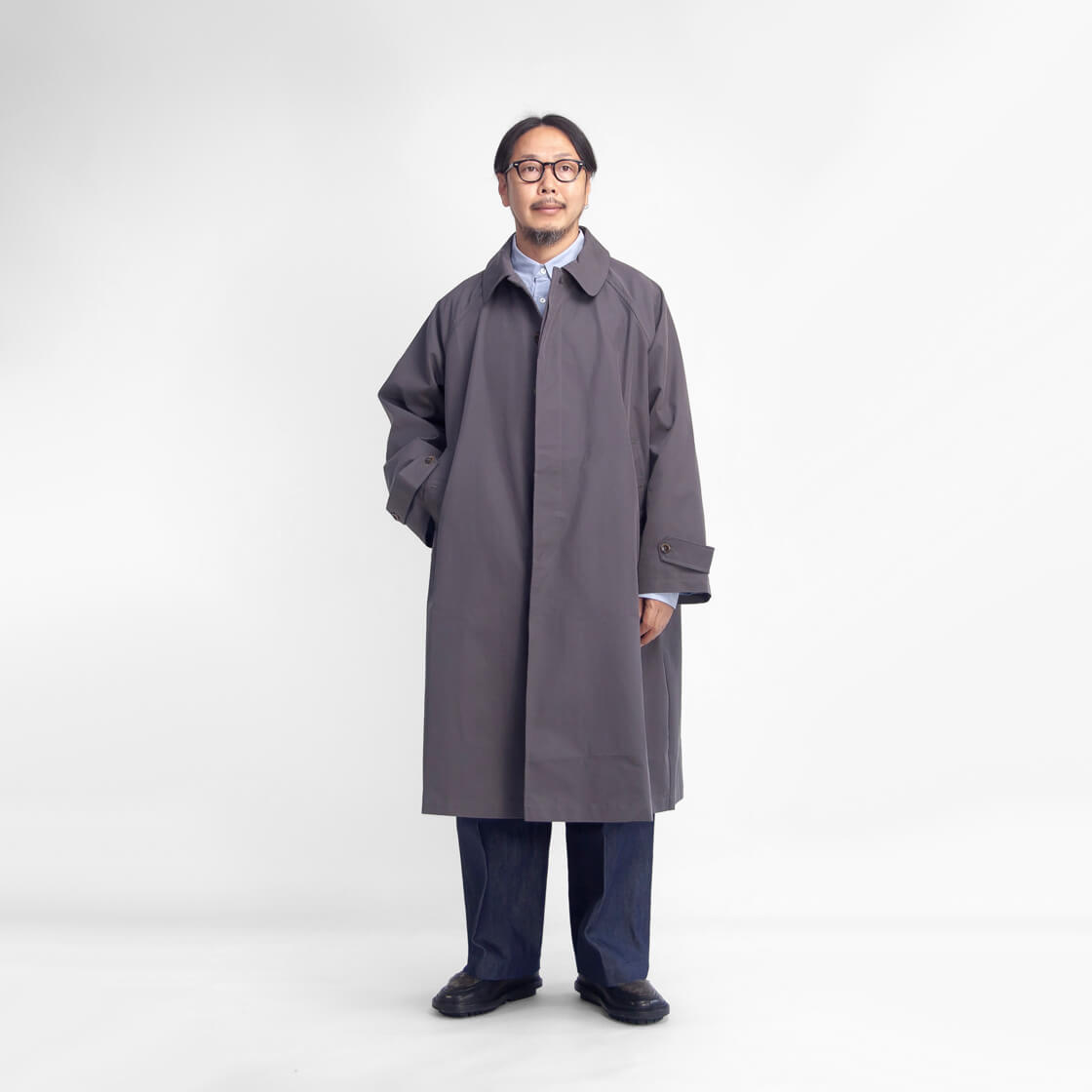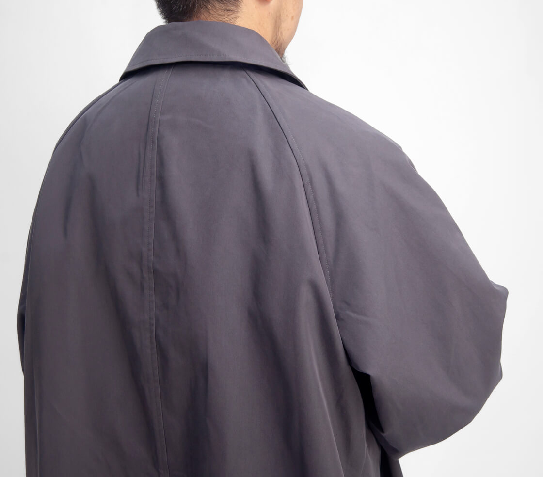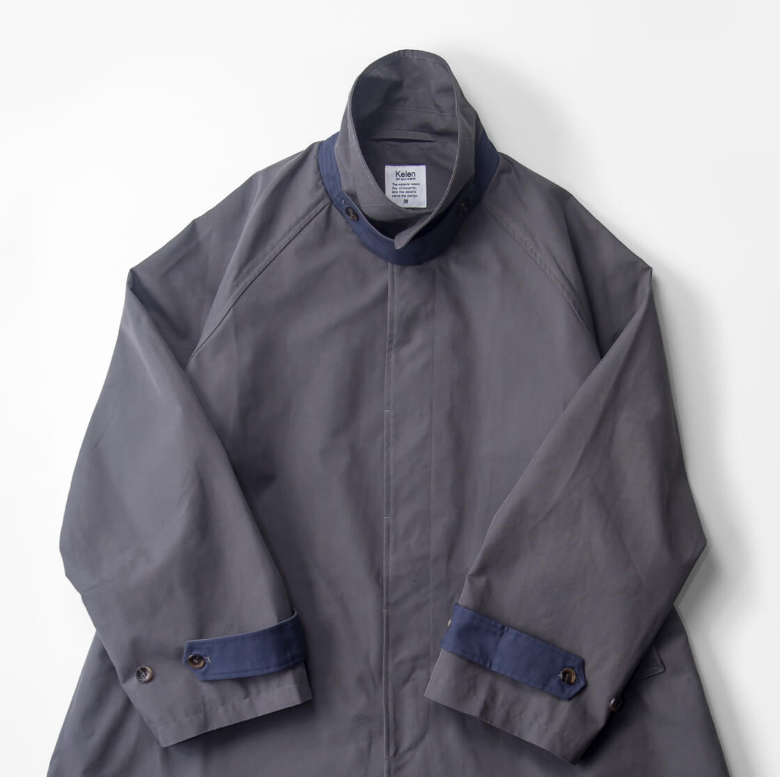 KELENから、80年代ヴィンテージを再構築したオーバーサイズのバルカラーコート「GRAVES」のご紹介。 深いラグランスリーブとカーブしたショルダーラインで、丸みのあるシルエットに。 比翼のフロントはすっきりと上品で、襟元には裏配色のチンストラップを装備。 袖のストラップも裏返すことで印象を変えることができます。 高密度に織り上げたコットン×ポリエステルのギャバジン。 上品な光沢と耐久性があり、程よい厚みでシワになりにくいのが特徴です。 ジャケットの上からも羽織れるゆったりとしたサイズ感で、ビジネスにもカジュアルにも対応。 伝統を踏まえながら新しい解釈で魅せる、KELENらしい存在感のある一着です。