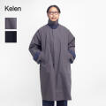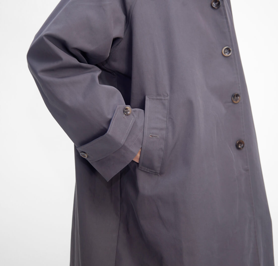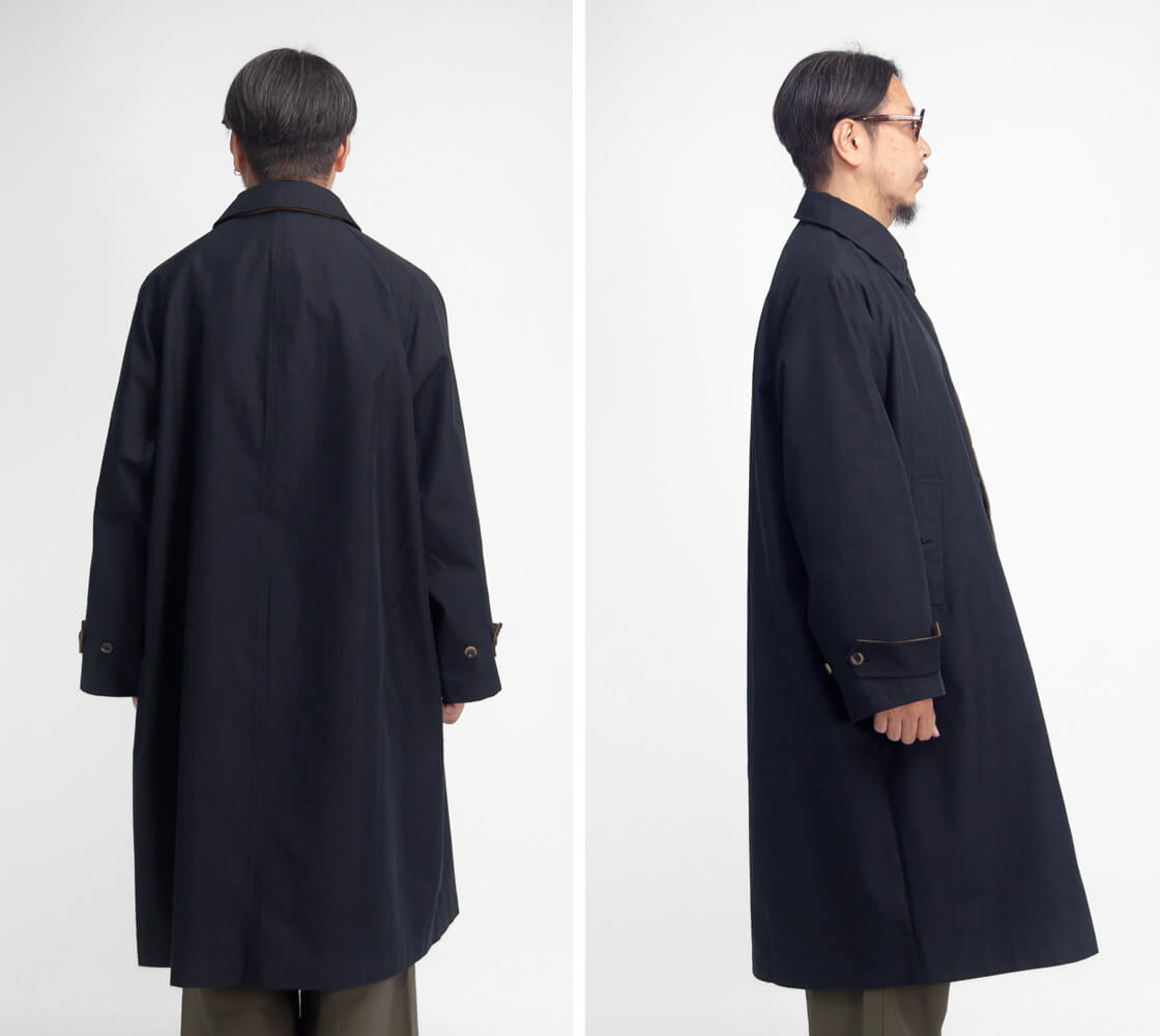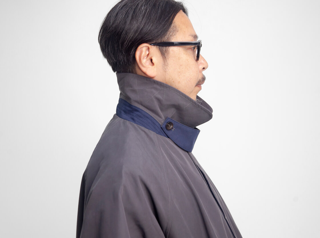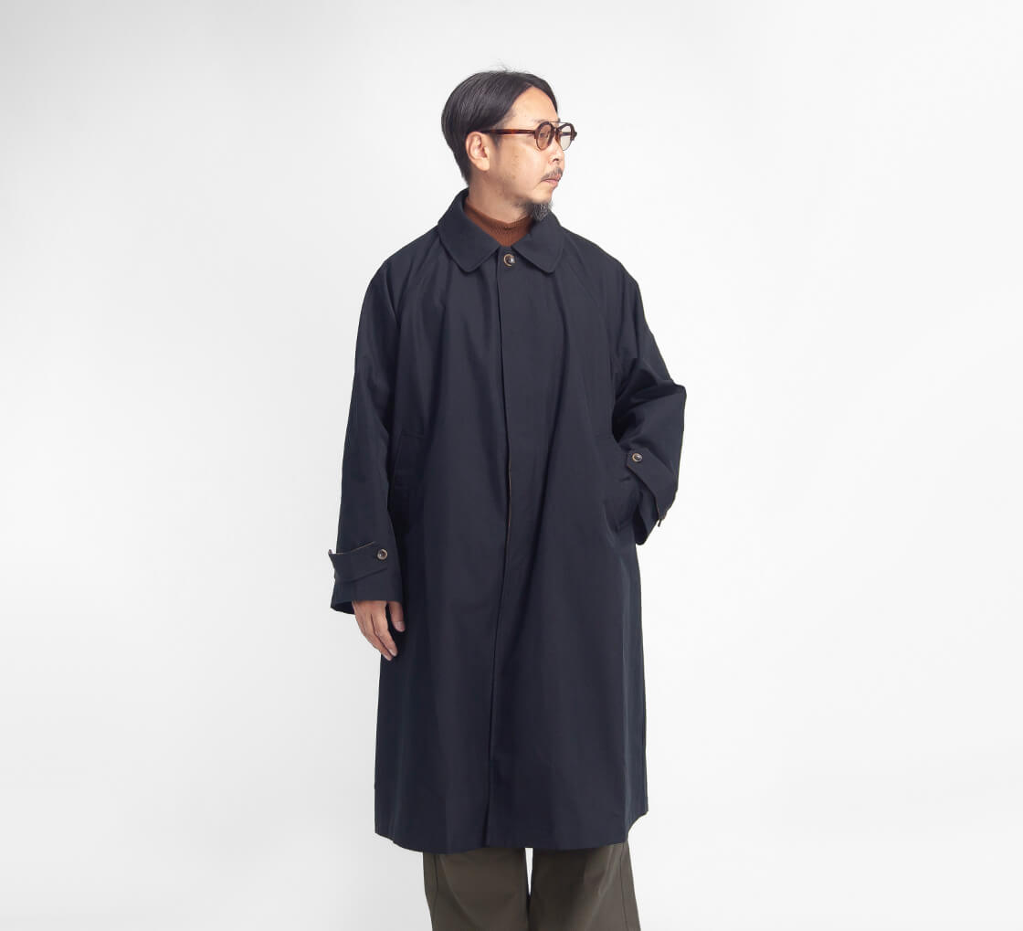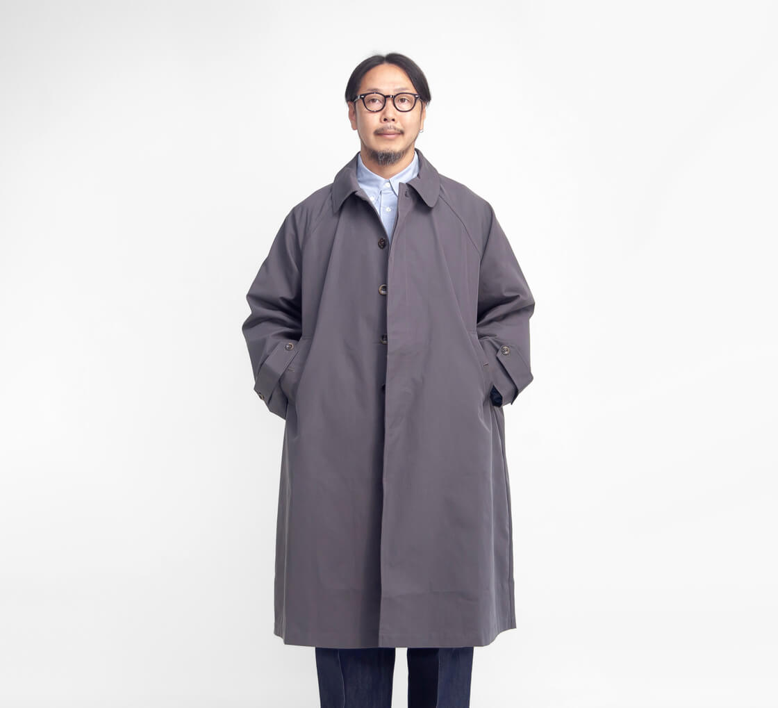 KELENから、80年代ヴィンテージを再構築したオーバーサイズのバルカラーコート「GRAVES」のご紹介。 深いラグランスリーブとカーブしたショルダーラインで、丸みのあるシルエットに。 比翼のフロントはすっきりと上品で、襟元には裏配色のチンストラップを装備。 袖のストラップも裏返すことで印象を変えることができます。 高密度に織り上げたコットン×ポリエステルのギャバジン。 上品な光沢と耐久性があり、程よい厚みでシワになりにくいのが特徴です。 ジャケットの上からも羽織れるゆったりとしたサイズ感で、ビジネスにもカジュアルにも対応。 伝統を踏まえながら新しい解釈で魅せる、KELENらしい存在感のある一着です。