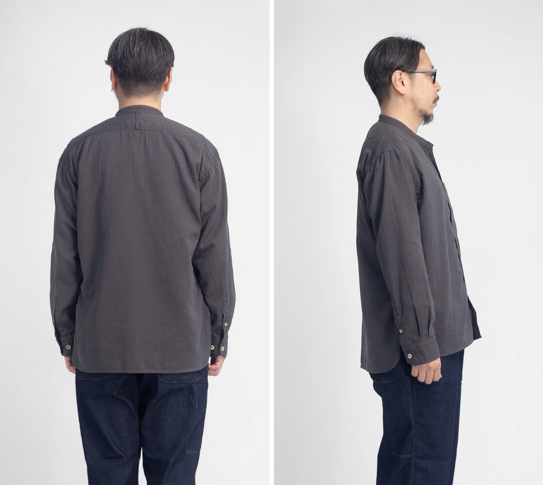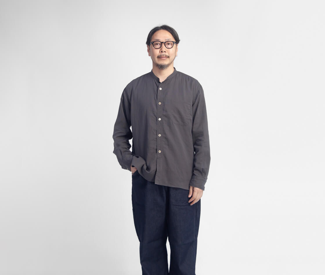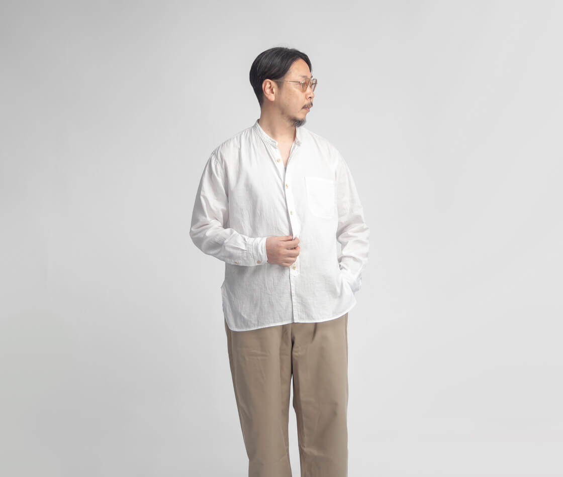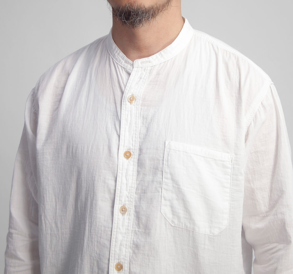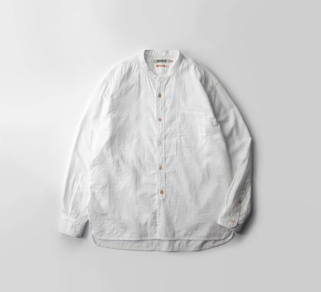 OMNIGODからダブルガーゼの柔らかさと無骨さを併せ持つバンドカラーシャツをご紹介。