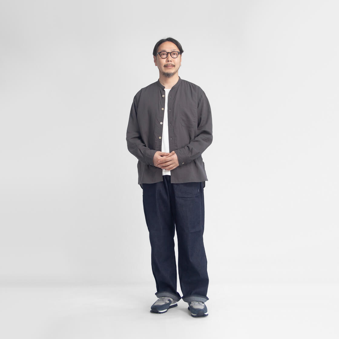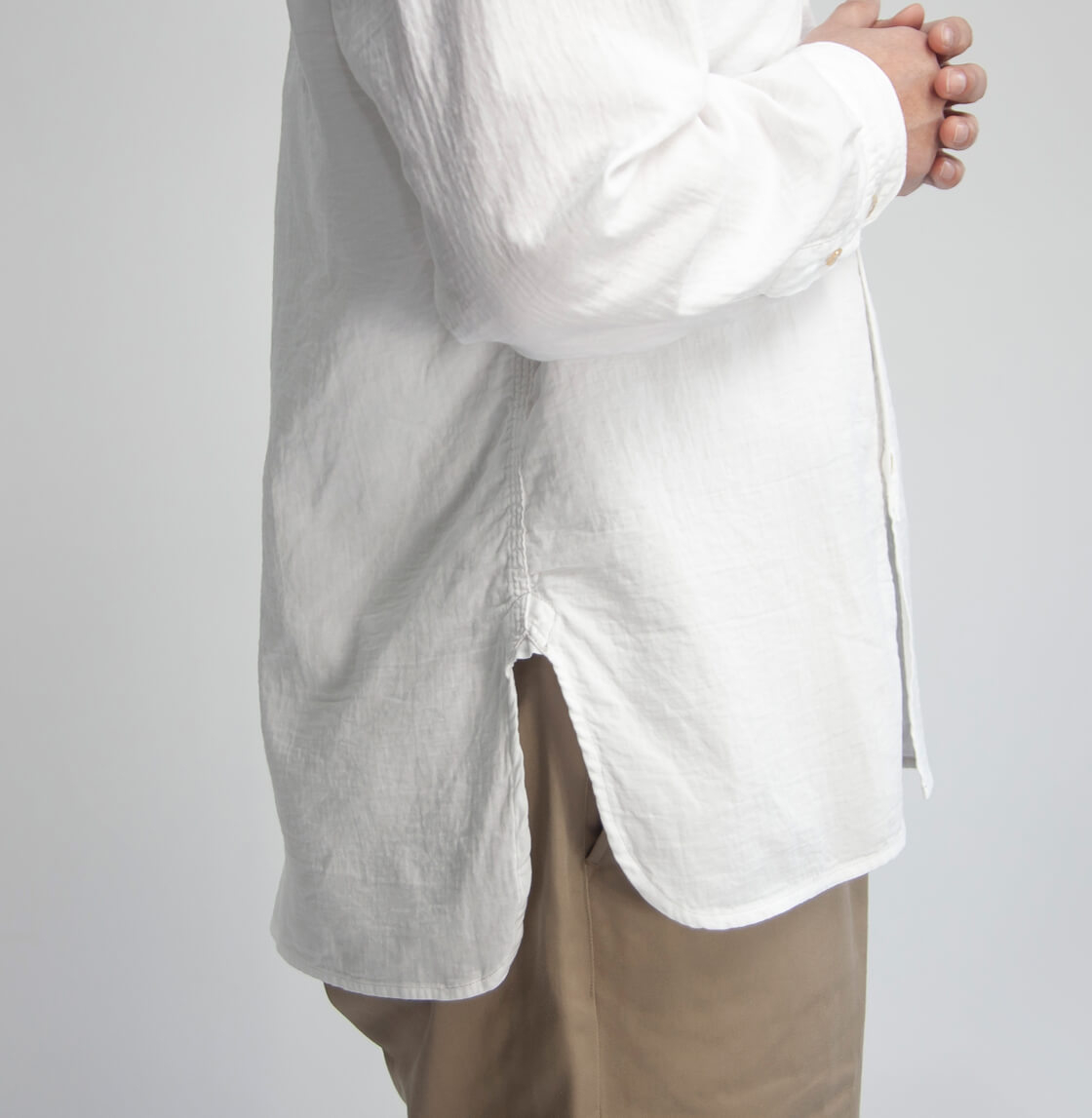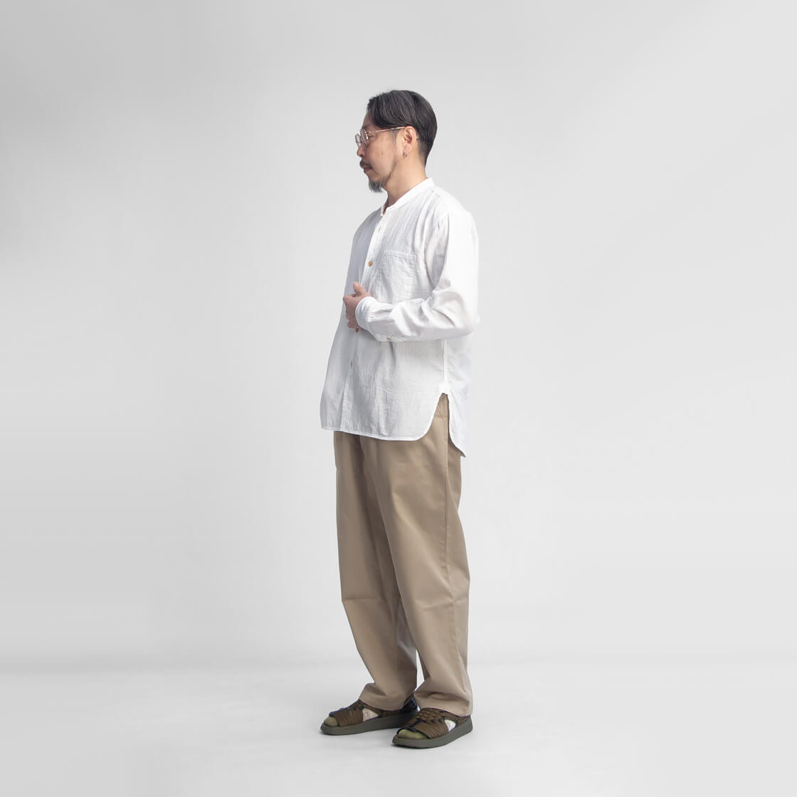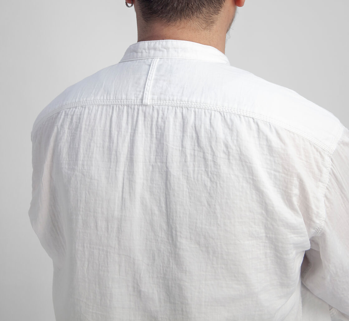 OMNIGODからダブルガーゼの柔らかさと無骨さを併せ持つバンドカラーシャツをご紹介。