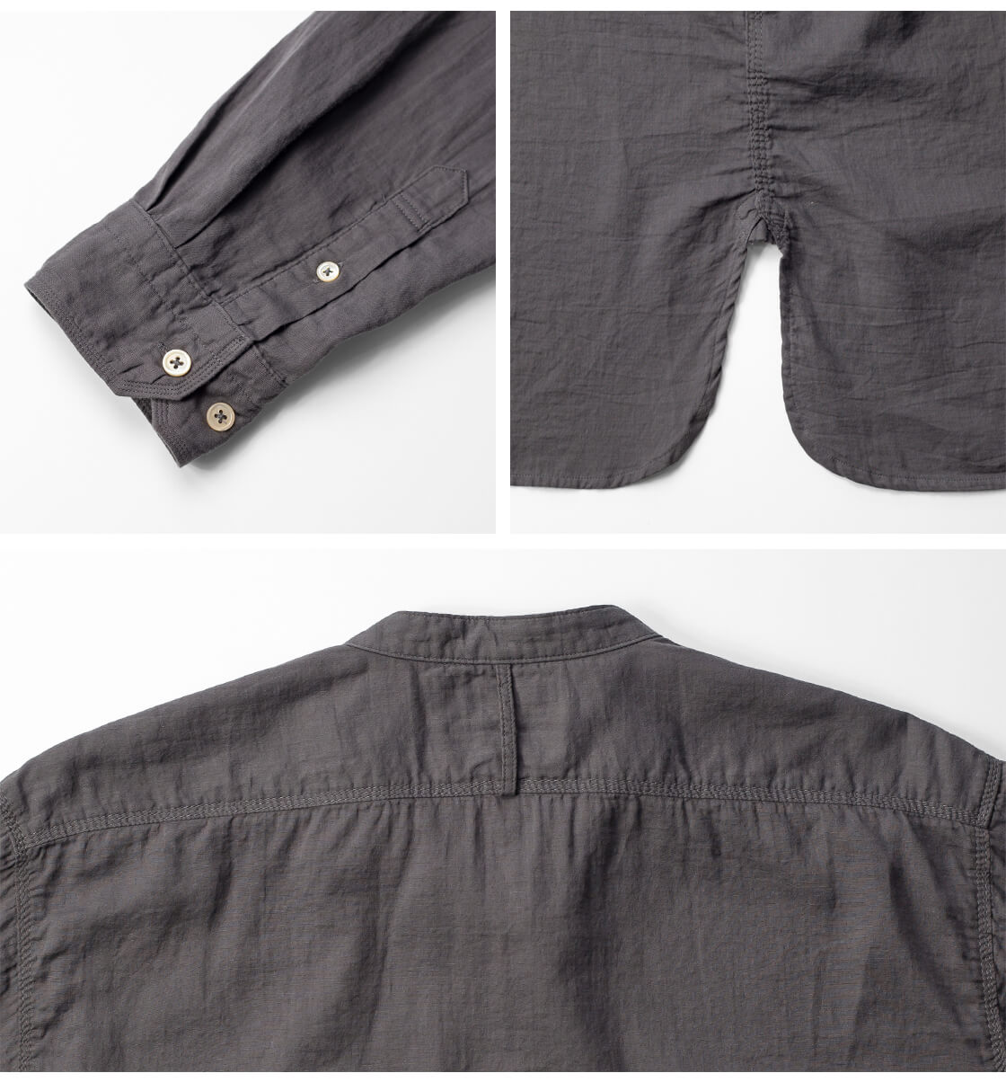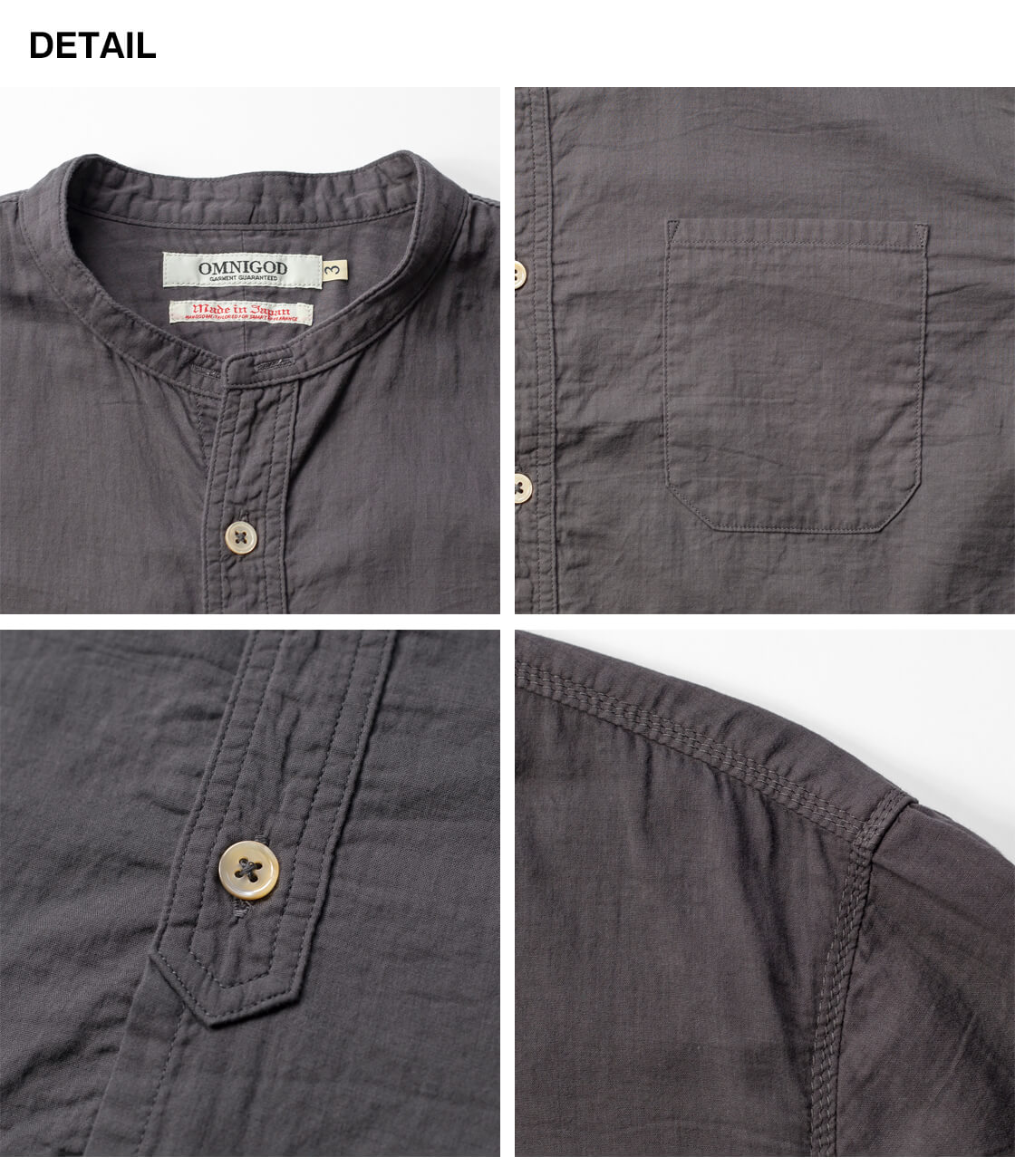 ![]() OMNIGOD - Double Gauze Stand Collar Work Shirt ![]() ふんわり柔らかくて軽いダブルガーゼに、3本針の無骨なステッチを活かしたバンドカラーワークシャツ。 ![]() OMNIGOD(オムニゴッド) OMINIGOD(オムニゴッド)の日本製パンツの多くは、香川県さぬき市津田町の小さな自社工場にて生産されています。元々ワーキングウェアの縫製からスタートしたこともあり、タフで丈夫なモノづくりは群を抜いています。"人が着る事"その当たり前とも思える考えに常に向き合いながら、素材や加工を駆使し、着心地や風合いの良いモノづくりを行う。人が求める本当の服、そんなモノづくりを出来ればとオムニゴッドは考えています。 ![]() 甘めのダブルガーゼに、抜け感と無骨さを同居させたワークシャツ。 ふんわり軽いダブルガーゼを用いた、低めの台襟でクラシックな雰囲気のOMNIGODのバンドカラーシャツ「Double Gauze Stand Collar Work Shirt」。本来はやわらかくて甘めの印象のダブルガーゼですが、このシャツはそこがひと味違う。3本針のステッチを多用することで、無骨でワークテイストな表情に仕上げているのが面白い。トップボタンはあえて省かれていて、首元はほどよくリラックスした抜け感に。脇や肩はしっかりとした3本針の巻き縫い、さらにアームホールやヨーク、カフスにも3本針を使うことで、全体にタフで男らしい雰囲気がしっかりと宿っています。脇のカーブはやや深めの設定。ポケットに手を入れたときもシルエットが崩れにくく、自然なラインをキープします。前立ては途中で途切れたハーフプラケット。その上に並ぶ生成り色の高瀬貝ボタンも、本体のクラシックな雰囲気とマッチして、なんとも味わい深い仕上がり。シルエットはゆったりしすぎたイマの雰囲気ではありませんが、身幅やアームホールなどにややゆとりを持たせた、リラックスした着用感です。 ![]() 空気をまとうような軽やかなダブルガーゼ素材。ふんわりと柔らかい質感は肌にも心地よく、通気性も高い生地です。 本体に使用している生地は、ガーゼを二重にしたコットン100%のダブルガーゼ生地。軽くて肌に心地よく、自然なシワ感でナチュラルな雰囲気を演出してくれるのが特徴。程よい厚みがありながらも、メッシュ素材の様に風をすっと通す通気性はとっても心地よくて、夏場でも快適に過ごせるというのが魅力です。仕上げに製品染めを施し、ガーゼ特有の縮みとステッチの立体感が重なり合うことで、奥行きのある表情に。洗いをかけたようなやさしい風合いと、ふっくらとしたタッチが、着るたびに心地よさを深めてくれる素材です。 ![]() ![]() 身長170cm、体重62kgの男性が3サイズ着用。