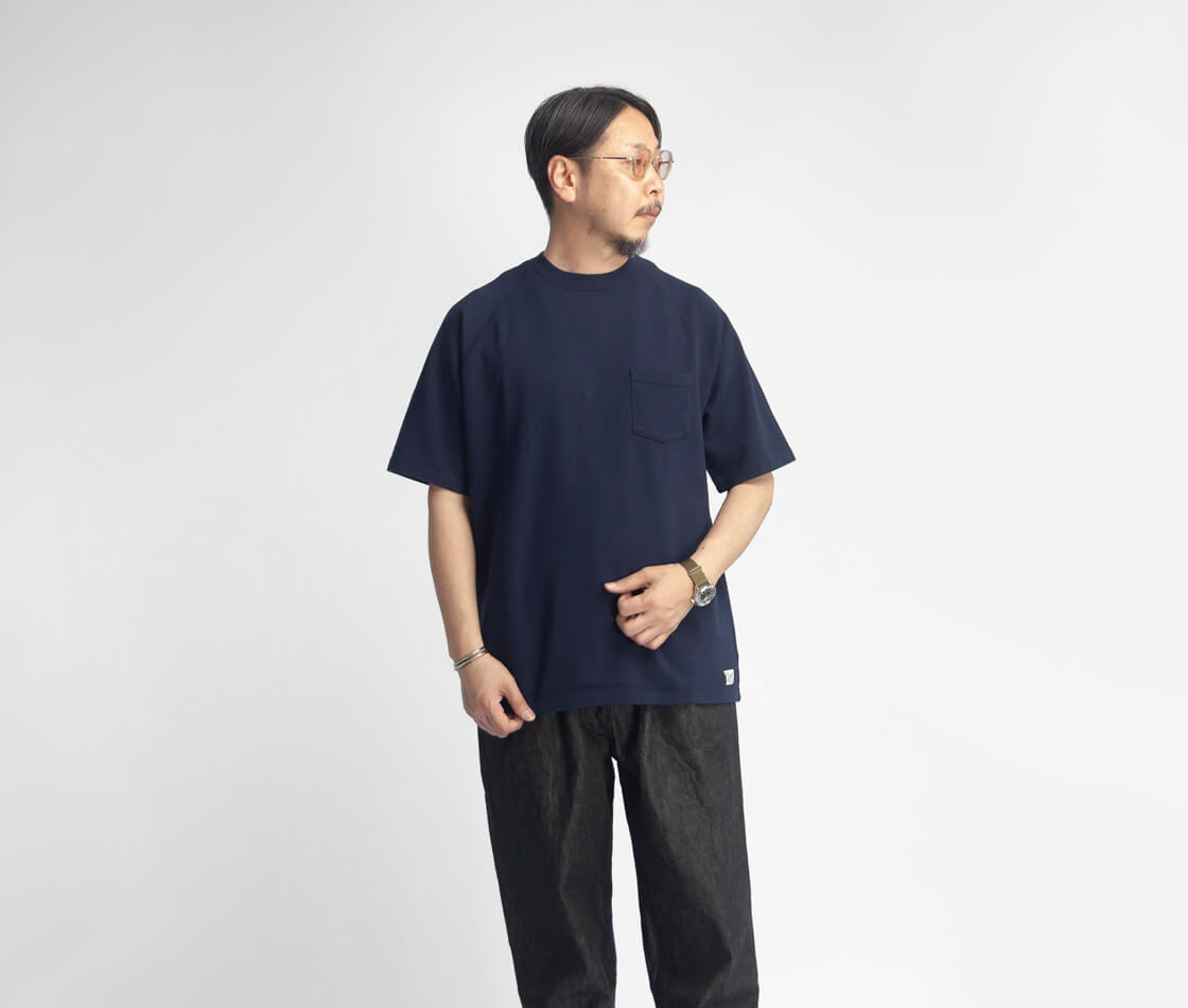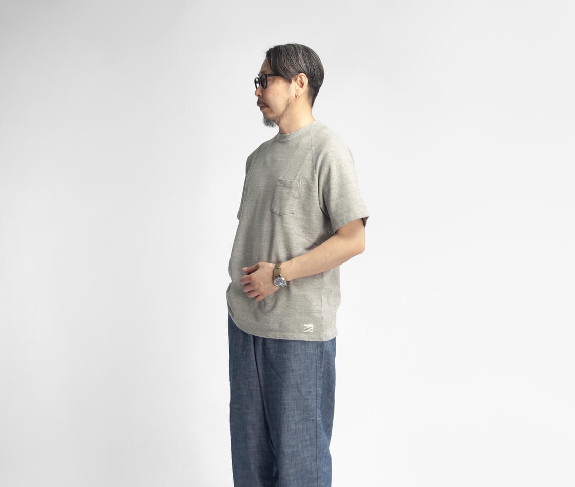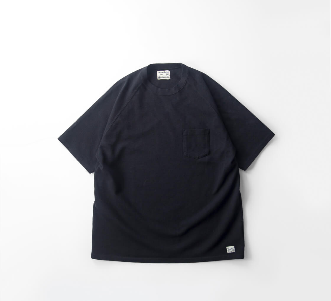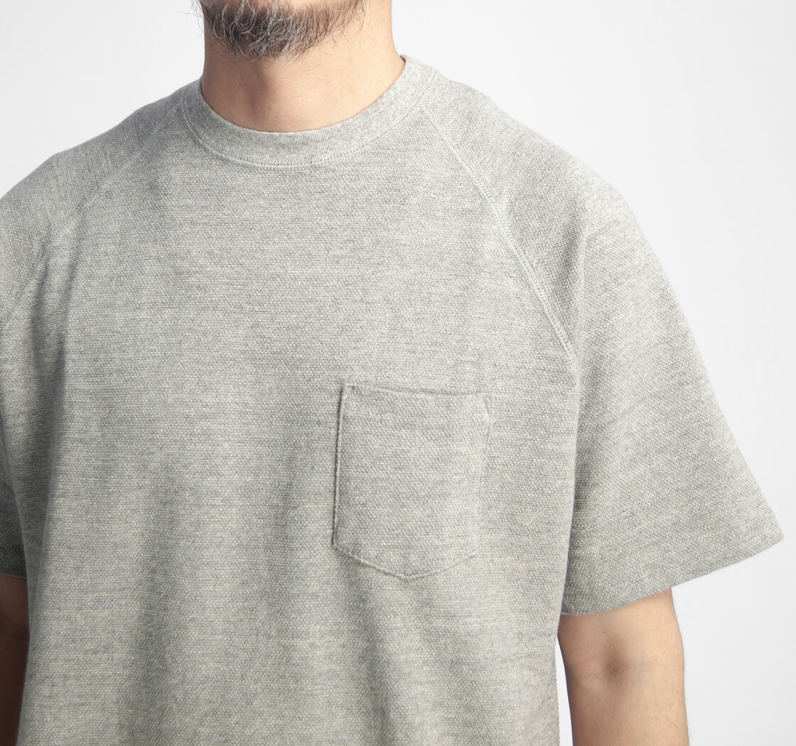 Kepaniから軍物由来のヘビー鹿の子生地を用いた、タフでドライな着心地のTシャツをご紹介。 ラグランスリーブ仕様で左胸にはポケットを配置。 6本取りで編み立てた凹凸の強い鹿の子生地が、存在感のある仕上がり。 身幅やアームホールにゆとりを持たせたボックスシルエットで、リラックス感のある着用感。 素材にはスウェーデン軍のアンダーウェアをモチーフにしたヘビー鹿の子を採用。 ラフィ糸と超長綿を掛け合わせた双糸により、ドライな肌触りとタフさを両立。 凹凸のある生地で肌離れが良く、暑い時期でも快適に着られる一着です。
