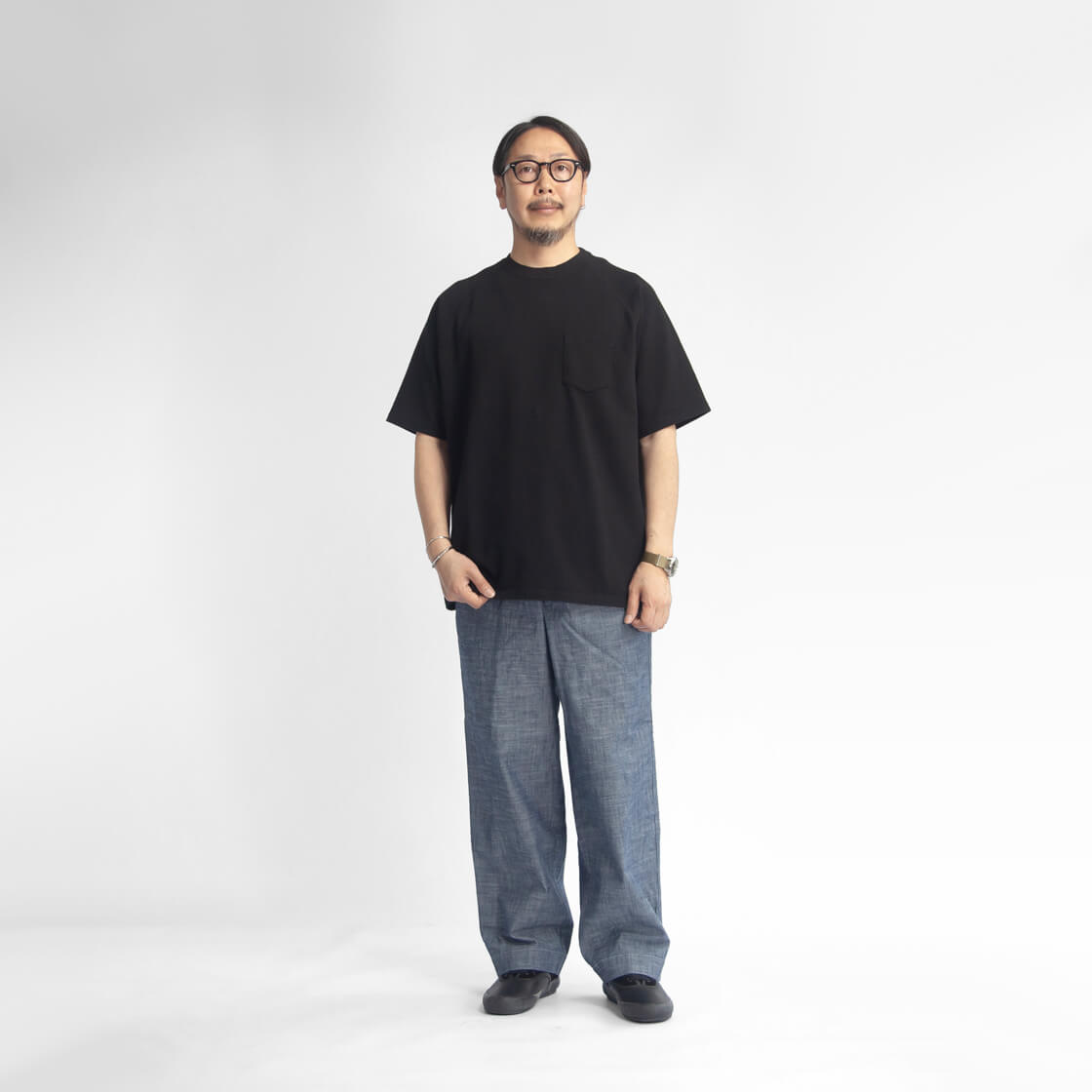 2 / 着丈71 / 身幅58 / 裄丈51 モデル着用 170cm/62kgで2サイズ 素材 綿100% カラー展開 ホワイト、ダークネイビー、ブラック、ライトグレー 生産国 日本 モデル着用コメント 2サイズを着用しました。身幅など全体的にゆったりとしていてルーズな着心地です。僕の場合2サイズでも十分にゆとりを持って着用できますが、もっとオーバーに着用するなら3サイズでもいいかなと思います。 スタッフ着用コメント 3サイズを着用しました。全体的にゆったりなシルエットで、これ一枚でも存在感があります。首周りは広すぎないのでだらしなさはありません。着丈はヒップが半分隠れるぐらいの長さでした。生地はしっかりと厚みがあって、透け感はなく安心感があります。着丈が長くなりますが、よりオーバーに着用するなら4サイズでもいいかなという感じです。 |
