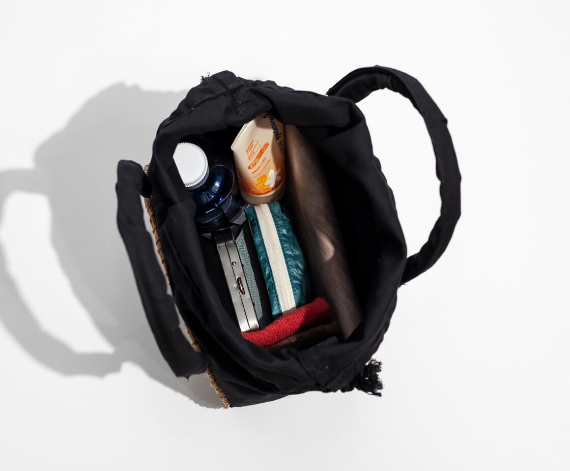 巾着仕様の開口で中身をしっかり目隠しし、安心感のある作りです。