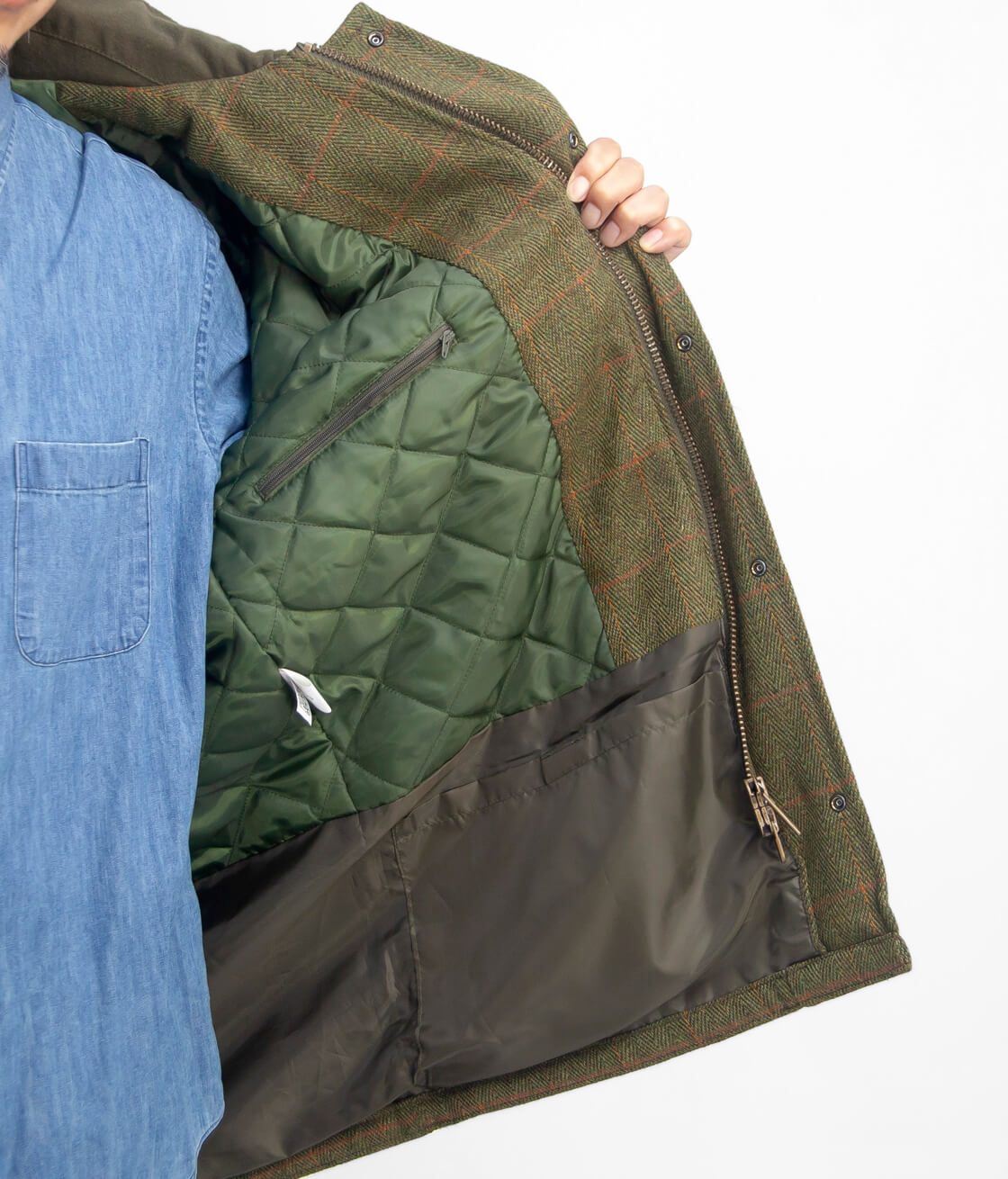 カントリー調で素朴な味わい深い表情のウールツイード生地。 厚手で耐久性のあるウールをメインに60%混紡したツイード生地。ヘリンボーンの織りにウインドウペンチェック柄を重ねた、カントリー調で素朴な味わい深い表情が印象的。秋冬シーズンのジャケットやコートに最適な、しっかりとした質感と温かみのある素材です。裏面にはダイヤキルティングの中綿を封入しているので高い防寒性を誇ります。表地のツイードと中綿により、防風・防水性に優れているうえ、裏地の下部を透湿性のある素材で切り替えることで、生地内部にたまった湿気を逃がすという機能性も備えています。 ![]() ![]() 身長170cm、体重62kgの男性がMサイズ着用。