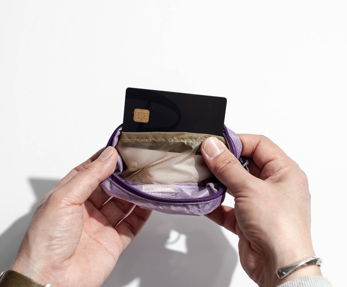 大きく開くファスナー仕様に加え、内部にはカードが収まるポケットを配置。