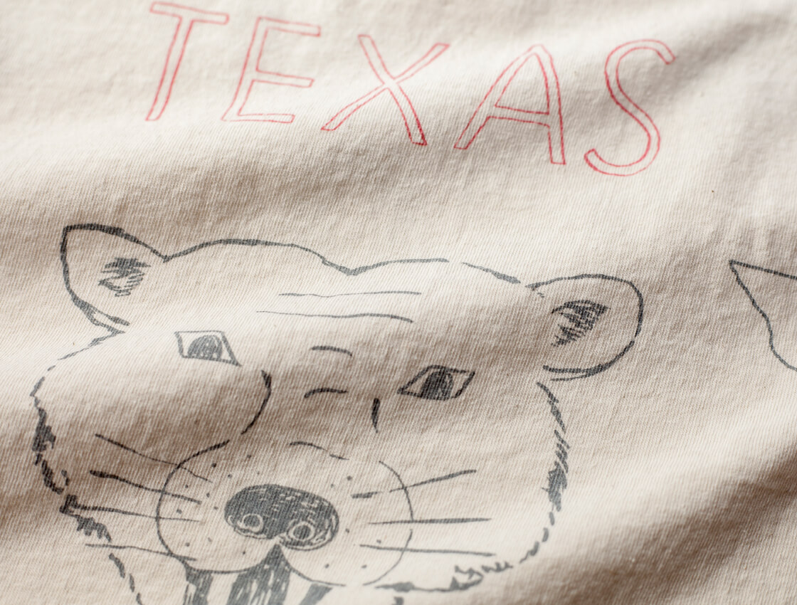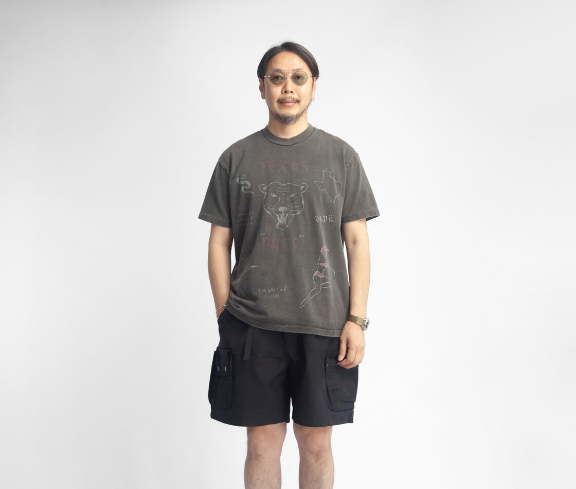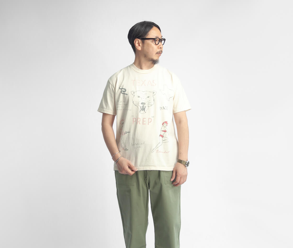 ![]() Unison Special - GIANT Tube PG Print S/S TEE(TEXAS) ![]() テキサスにちなんだ手書きモチーフを大胆にプリントした、ヴィンテージ感&インパクトのあるTシャツ。 ![]() Unison Special(ユニゾンスペシャル) Unison Special(ユニゾンスペシャル)は、某アメカジブランドのデザイナーを務め、多岐に渡りカジュアルウェアを企画してきた2人が、2025年春よりスタートした、「ありそうでない」をコンセプトとしたカジュアルブランド。 ヴィンテージの雰囲気と風格を参考にし、現代的なデザインを取り入れることで、独自のスタイルを創造。 糸の開発や編機、生地の選定、加工手法、アイテムディテールにこだわりを持ち、質の高い日本製のラインナップを展開しています。 ![]() 身幅はほどよくゆったり、脇に縫い目のない丸胴チューブボディ。 Unison Special定番のUSコットンの丸胴チューブボディのTシャツに、テキサスにちなんだ手書きモチーフを特殊なUSED風プリントで前後に大胆に配した、Unison SpecialのプリントT「GIANT Tube PG Print S/S TEE(TEXAS)」。一枚一枚ハンドで描いたような雰囲気、まるで長年着込まれてきたかのような表情を持ちながらも、どこか新鮮さを感じさせる一枚です。袖口や裾は、縦にミシン目の入る裾引き(天地引き、ブラインドステッチ)始末で、ヴィンテージな雰囲気がプンプン。シルエットはレギュラーよりも少しだけ大き目。身幅はほどよくゆったりですが、けっしてオーバーなサイズ感ではありません。 ![]() 何度もテストを繰り返し風合いを出した、特殊なUSED風プリント。前後にプリントが入り、存在感抜群。 ![]() ヴィンテージな雰囲気、ドライでアメリカンな空気感を纏う、空紡糸の天竺生地。 本体に使用しているのは、コットンUSAを原料にした16番手の空紡糸で編み立てたコットン天竺生地。空紡糸(BD糸/オープンエンド糸)は、空気の力で繊維を撚り合わせた糸で、古くからアメリカ製Tシャツに多く採用されてきた素材です。外側はしっかりと撚りが効いているためドライでシャリ感のあるタッチに、一方で中心は甘撚りなので着用時に柔らかさを感じさせてくれる。このコントラストが、独特の着心地を生み出しているのです。肌離れの良いドライな質感は、汗ばむ季節でもべたつきにくく、夏場でも快適。さらに程よい厚みがあるため透けにくく、1枚で着ても安心感があります。どこか無骨でいて心地よい風合いは、まさに"古き良きアメリカ"の空気感を纏わせてくれます。BLACKカラーにはピグメント染めを施し、着込んだようなアタリや色の変化が魅力。まるで長年愛用してきたかのような、ヴィンテージさながらの表情に仕上げています。一方のNATURALカラーは、あえて染めを行わない生機のまま。コットン本来の生成り色に、ところどころに見える綿カスが素朴で温かみのある表情を添え、素材そのものの魅力をダイレクトに感じさせてくれます。 ![]() ![]() 身長170cm、体重62kgの男性がMサイズ着用。