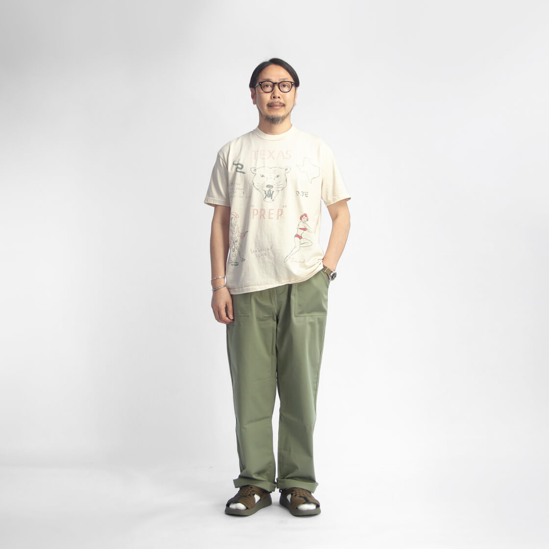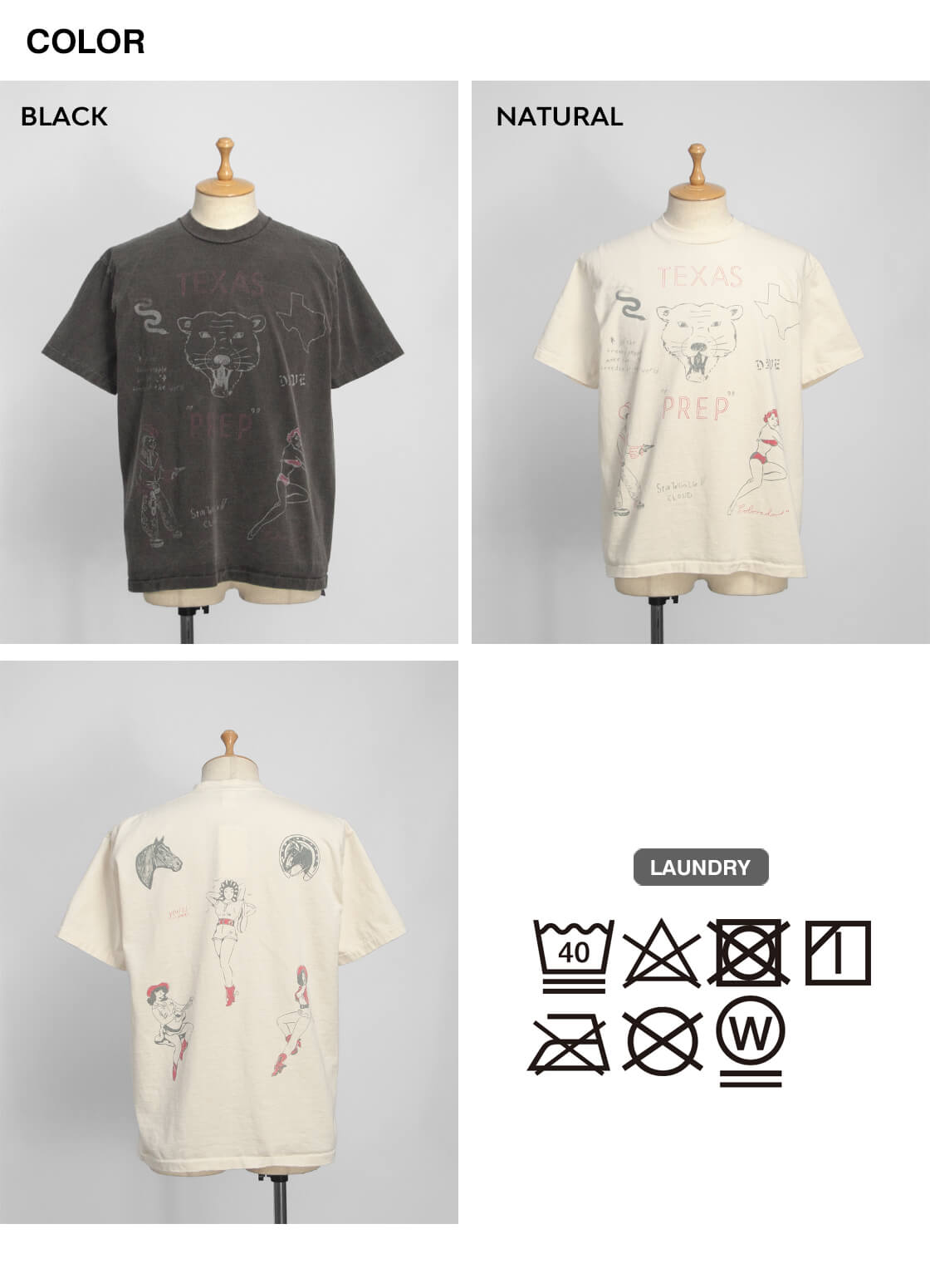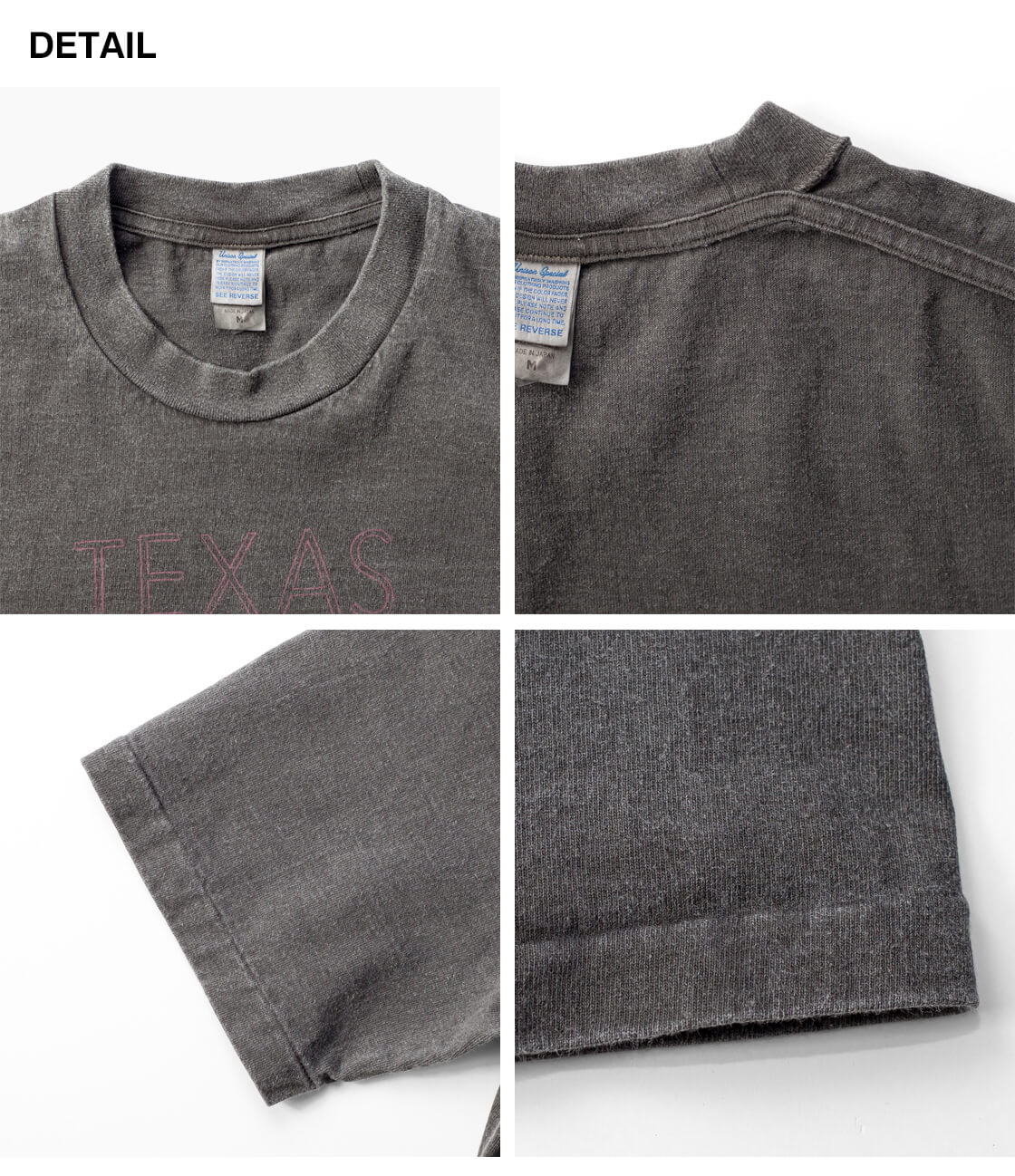 ![]() Unison Special - GIANT Tube PG Print S/S TEE(TEXAS) ![]() テキサスにちなんだ手書きモチーフを大胆にプリントした、ヴィンテージ感&インパクトのあるTシャツ。 ![]() Unison Special(ユニゾンスペシャル) Unison Special(ユニゾンスペシャル)は、某アメカジブランドのデザイナーを務め、多岐に渡りカジュアルウェアを企画してきた2人が、2025年春よりスタートした、「ありそうでない」をコンセプトとしたカジュアルブランド。 ヴィンテージの雰囲気と風格を参考にし、現代的なデザインを取り入れることで、独自のスタイルを創造。 糸の開発や編機、生地の選定、加工手法、アイテムディテールにこだわりを持ち、質の高い日本製のラインナップを展開しています。 ![]() 身幅はほどよくゆったり、脇に縫い目のない丸胴チューブボディ。 Unison Special定番のUSコットンの丸胴チューブボディのTシャツに、テキサスにちなんだ手書きモチーフを特殊なUSED風プリントで前後に大胆に配した、Unison SpecialのプリントT「GIANT Tube PG Print S/S TEE(TEXAS)」。一枚一枚ハンドで描いたような雰囲気、まるで長年着込まれてきたかのような表情を持ちながらも、どこか新鮮さを感じさせる一枚です。袖口や裾は、縦にミシン目の入る裾引き(天地引き、ブラインドステッチ)始末で、ヴィンテージな雰囲気がプンプン。シルエットはレギュラーよりも少しだけ大き目。身幅はほどよくゆったりですが、けっしてオーバーなサイズ感ではありません。 ![]() 何度もテストを繰り返し風合いを出した、特殊なUSED風プリント。前後にプリントが入り、存在感抜群。 ![]() ヴィンテージな雰囲気、ドライでアメリカンな空気感を纏う、空紡糸の天竺生地。 本体に使用しているのは、コットンUSAを原料にした16番手の空紡糸で編み立てたコットン天竺生地。空紡糸(BD糸/オープンエンド糸)は、空気の力で繊維を撚り合わせた糸で、古くからアメリカ製Tシャツに多く採用されてきた素材です。外側はしっかりと撚りが効いているためドライでシャリ感のあるタッチに、一方で中心は甘撚りなので着用時に柔らかさを感じさせてくれる。このコントラストが、独特の着心地を生み出しているのです。肌離れの良いドライな質感は、汗ばむ季節でもべたつきにくく、夏場でも快適。さらに程よい厚みがあるため透けにくく、1枚で着ても安心感があります。どこか無骨でいて心地よい風合いは、まさに"古き良きアメリカ"の空気感を纏わせてくれます。BLACKカラーにはピグメント染めを施し、着込んだようなアタリや色の変化が魅力。まるで長年愛用してきたかのような、ヴィンテージさながらの表情に仕上げています。一方のNATURALカラーは、あえて染めを行わない生機のまま。コットン本来の生成り色に、ところどころに見える綿カスが素朴で温かみのある表情を添え、素材そのものの魅力をダイレクトに感じさせてくれます。 ![]() ![]() 身長170cm、体重62kgの男性がMサイズ着用。