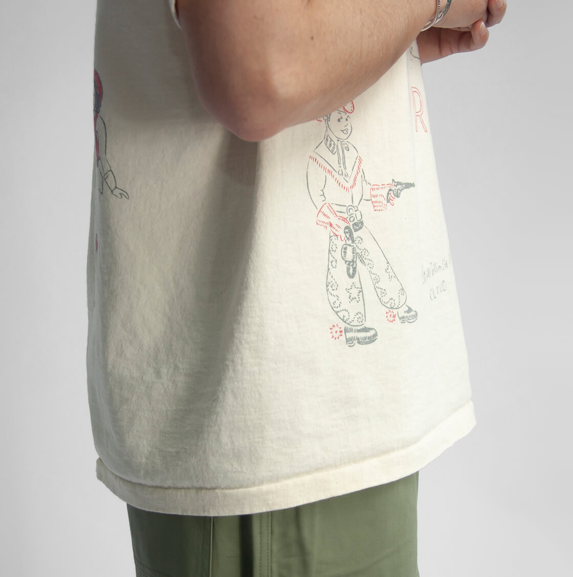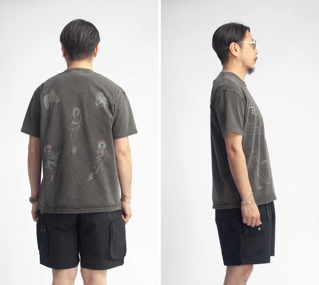 Unison Specialから手書きモチーフを大胆に配したヴィンテージ感のあるプリントTシャツをご紹介。 前後に配置されたUSED風プリントや、裾引き仕様の縫製が雰囲気を高めるディテール。 丸胴チューブボディで脇に縫い目がなく、ストレスの少ない着心地に仕上げています。 身幅に少しゆとりを持たせた、オーバーすぎないシルエット。 素材には空紡糸のコットン天竺を使用。 ドライでシャリ感のあるタッチと適度な厚みで、汗ばむ季節でも快適に着用可能。 ヴィンテージの空気感と現代的なバランスを併せ持つ、存在感のある一着です。