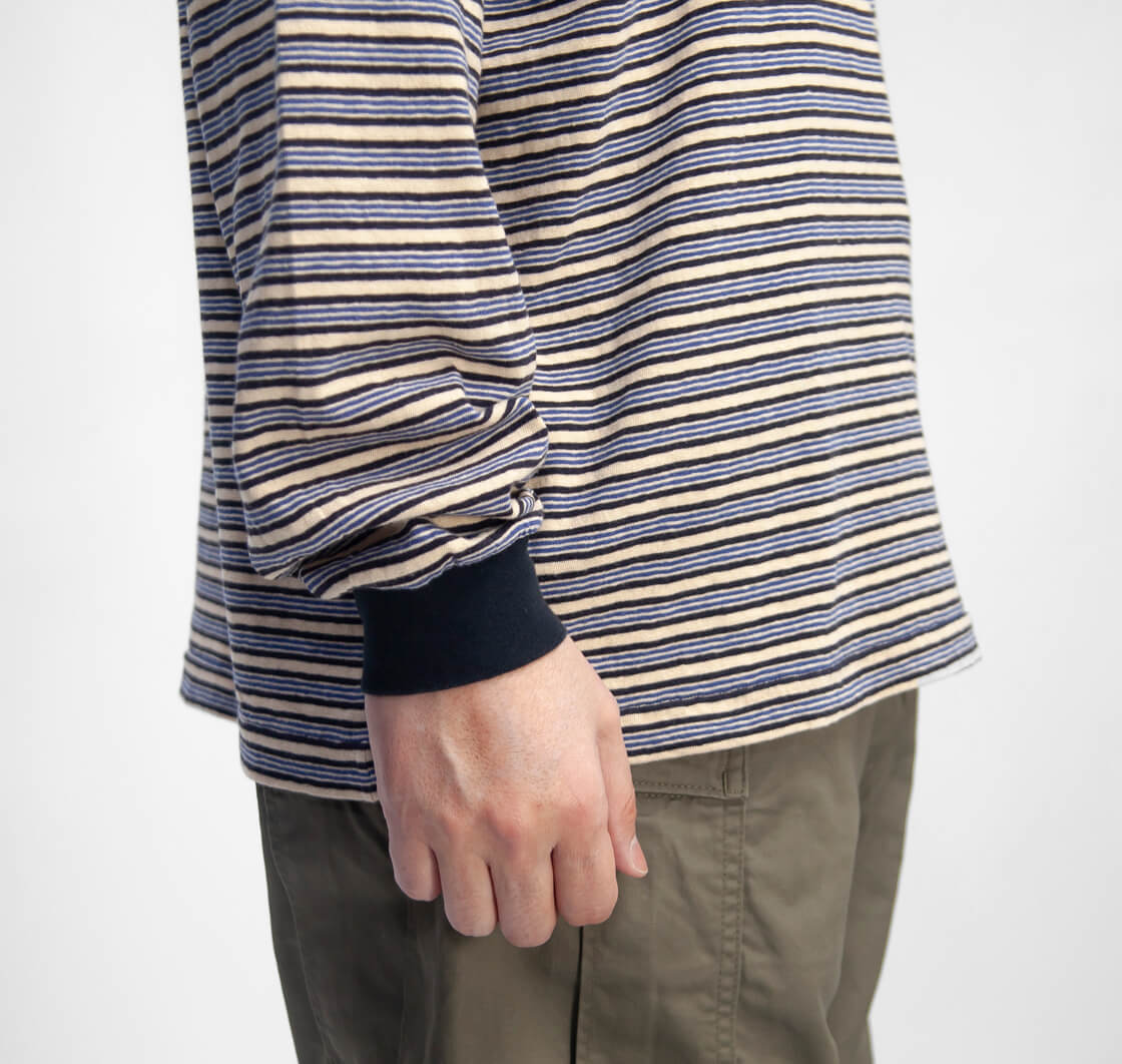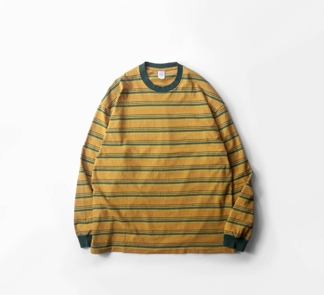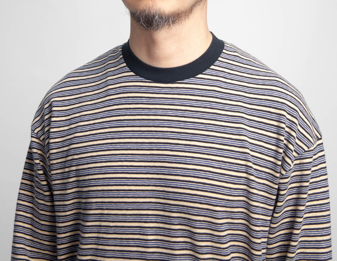 Unison Specialから70年代サーフスタイルを彷彿させるレトロなマルチボーダーの長袖Tシャツをご紹介。 襟と袖口はフライスで切り替え、肩まわりはタコバインダーで補強し、脇は丁寧な柄合わせで整えられた作り込み。 ゆったりとした身幅のボックスシルエットで、リラックス感のある着こなしに馴染みます。 生地は落ち綿を用いたリサイクルコットンの天竺を使用。 自然なムラとフェード加工により、古着のような風合いを表現。 柔らかく馴染む着心地も魅力です。 雰囲気と着やすさを両立した、ヴィンテージライクな気分を上げてくれる一着です。