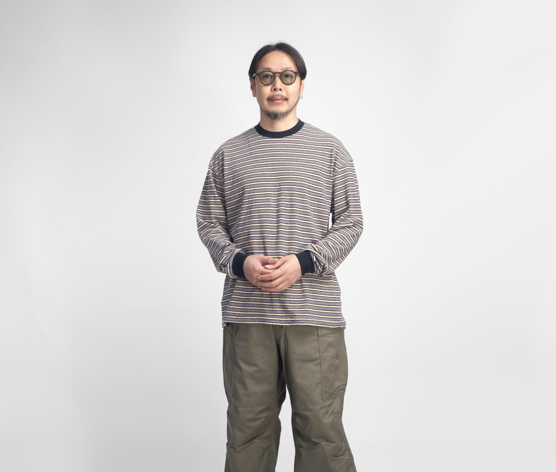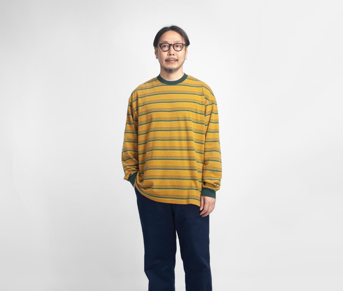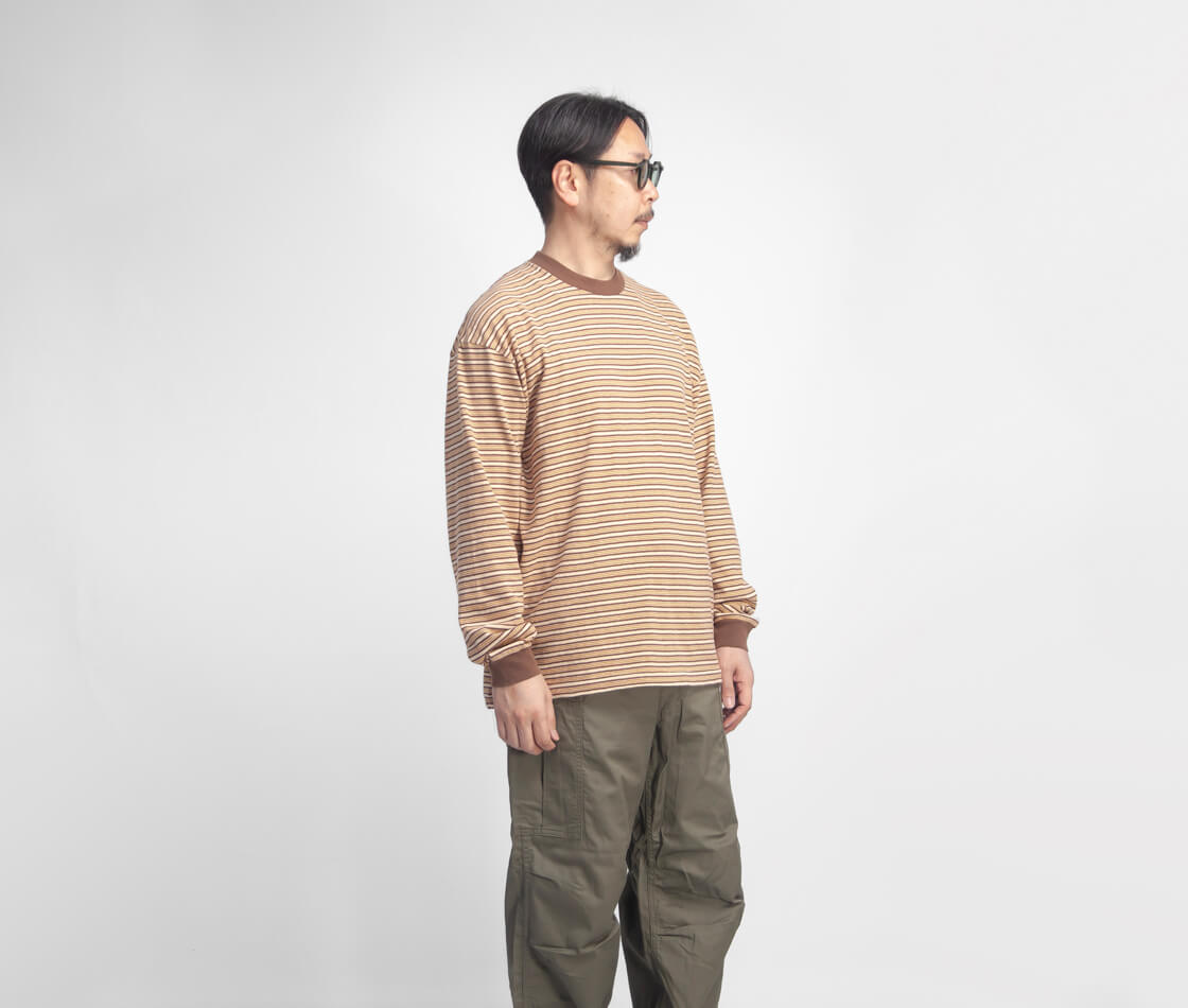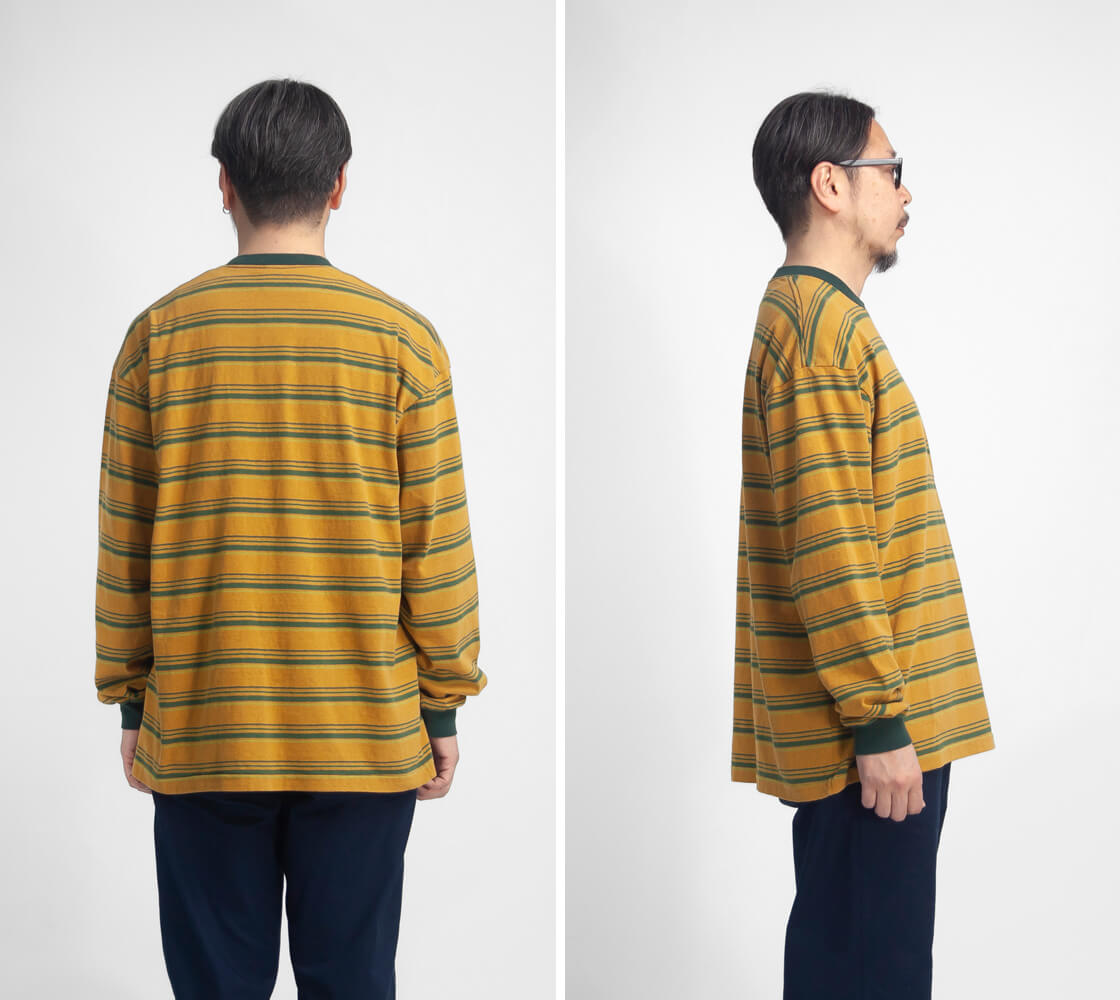 ![]() Unison Special - GIANT MULTI BORDER L/S TEE ![]() 70年代のサーフスタイルを彷彿させる、レトロなマルチボーダーのロンTEE。 ![]() Unison Special(ユニゾンスペシャル) Unison Special(ユニゾンスペシャル)は、某アメカジブランドのデザイナーを務め、多岐に渡りカジュアルウェアを企画してきた2人が、2025年春よりスタートした、「ありそうでない」をコンセプトとしたカジュアルブランド。 ヴィンテージの雰囲気と風格を参考にし、現代的なデザインを取り入れることで、独自のスタイルを創造。 糸の開発や編機、生地の選定、加工手法、アイテムディテールにこだわりを持ち、質の高い日本製のラインナップを展開しています。 ![]() 襟ぐりと袖口をフライス生地で切り替えた、ゆったり身幅のボックスシルエット。 70年代のサーフスタイルを彷彿させる、レトロなマルチボーダーが雰囲気抜群なUnison Specialの長袖Tシャツ「GIANT MULTI BORDER L/S TEE」。何がイイって、やっぱりこのレトロな70sを感じさせるボーダー柄と、古着の様なムラ感のある生地の雰囲気。襟と袖口はフライス生地で切り替え、袖にギュッと絞りを出しています。この袖口の膨らみは好みが分かれると思いますが、個人的には大好物。襟裏から肩にかけてはタコバインダーでヨレを防ぎます。身頃の脇は丁寧に柄合わせされていて、サイドから見た際のチグハグ感がないというのも、見逃せないポイント。細部までしっかりと作り込まれているのです。 ![]() 落ち綿を使用したレトロでヴィンテージ感のあるマルチボーダー天竺生地。 本体に用いているのは、糸を製造する工程で削り落とされる落ち綿と呼ばれる綿で紡績された、リサイクルコットンを使用した、マルチボーダーの天竺生地。表面に独特のムラがあるのは、この落ち綿によるものです。落綿には短い繊維が多く含まれており、糸には自然とムラが出来ます。そのナチュラルなムラが生み出すヴィンテージ古着の様な風合いが特徴的。粗野な見た目がしますが、とても手間暇のかかった高価な糸なのです。そして廃棄される落ち綿を使うことで、ごみが減量され、エコにも貢献しているという地球にも優しい素材です。さらにフェード加工を施すことで、奥行きのあるヴィンテージライクな表情に。使い込まれたような自然な風合いが、素材そのものにさりげない存在感を与えています。くったりとした柔らかなタッチは、肌に触れた瞬間にも心地よく、着るたびに馴染んでいく感覚も魅力の素材です。 ![]() ![]() 身長170cm、体重62kgの男性がMサイズ着用。
