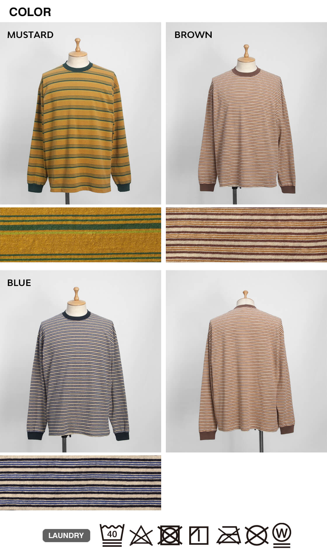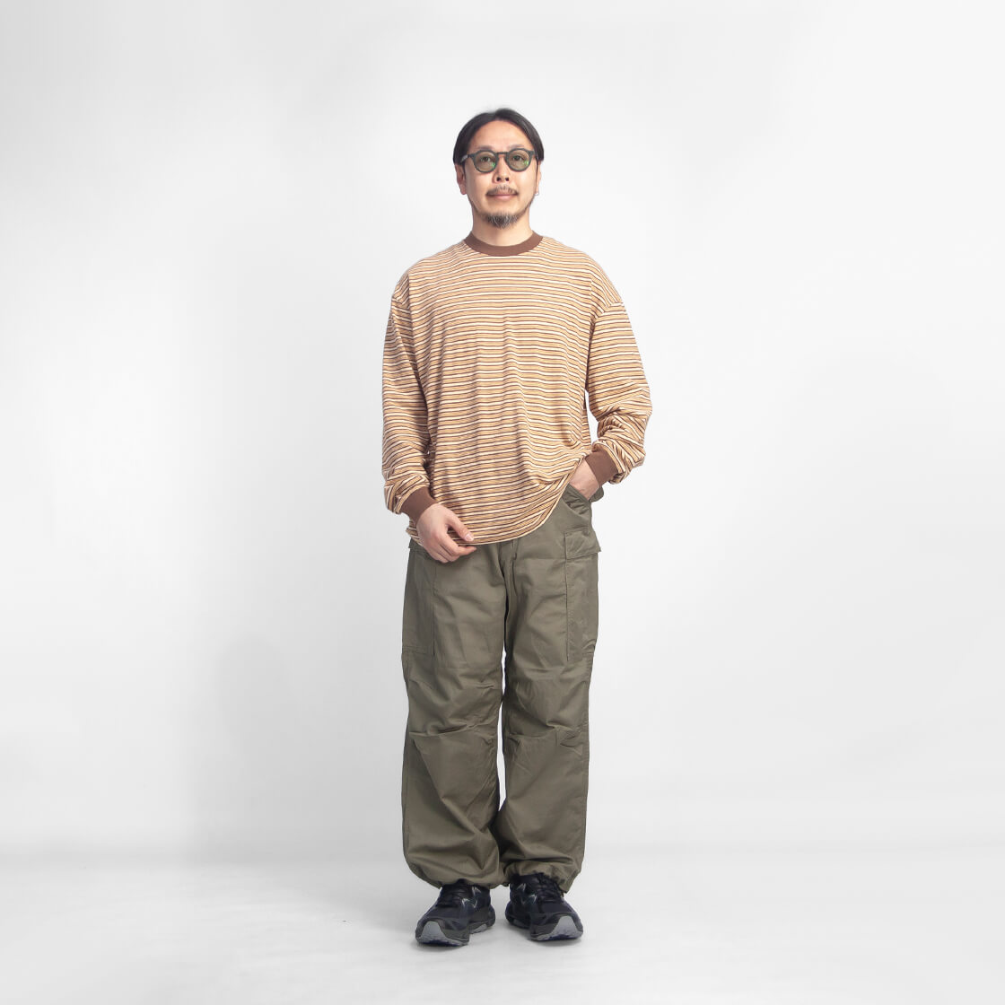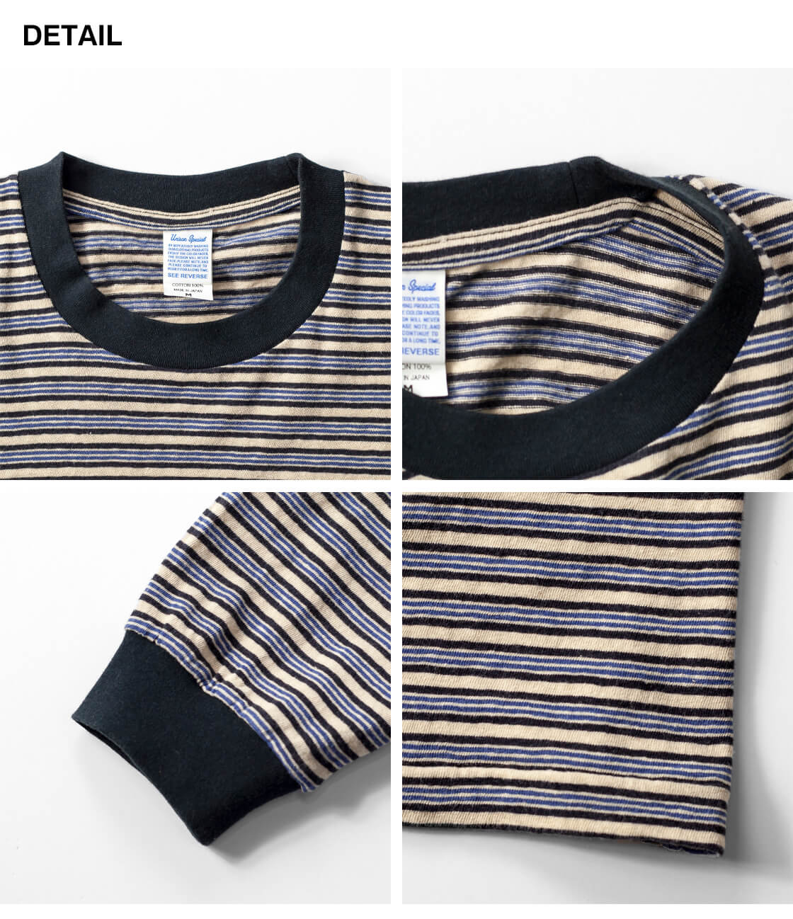 ![]() Unison Special - GIANT MULTI BORDER L/S TEE ![]() 70年代のサーフスタイルを彷彿させる、レトロなマルチボーダーのロンTEE。 ![]() Unison Special(ユニゾンスペシャル) Unison Special(ユニゾンスペシャル)は、某アメカジブランドのデザイナーを務め、多岐に渡りカジュアルウェアを企画してきた2人が、2025年春よりスタートした、「ありそうでない」をコンセプトとしたカジュアルブランド。 ヴィンテージの雰囲気と風格を参考にし、現代的なデザインを取り入れることで、独自のスタイルを創造。 糸の開発や編機、生地の選定、加工手法、アイテムディテールにこだわりを持ち、質の高い日本製のラインナップを展開しています。 ![]() 襟ぐりと袖口をフライス生地で切り替えた、ゆったり身幅のボックスシルエット。 70年代のサーフスタイルを彷彿させる、レトロなマルチボーダーが雰囲気抜群なUnison Specialの長袖Tシャツ「GIANT MULTI BORDER L/S TEE」。何がイイって、やっぱりこのレトロな70sを感じさせるボーダー柄と、古着の様なムラ感のある生地の雰囲気。襟と袖口はフライス生地で切り替え、袖にギュッと絞りを出しています。この袖口の膨らみは好みが分かれると思いますが、個人的には大好物。襟裏から肩にかけてはタコバインダーでヨレを防ぎます。身頃の脇は丁寧に柄合わせされていて、サイドから見た際のチグハグ感がないというのも、見逃せないポイント。細部までしっかりと作り込まれているのです。 ![]() 落ち綿を使用したレトロでヴィンテージ感のあるマルチボーダー天竺生地。 本体に用いているのは、糸を製造する工程で削り落とされる落ち綿と呼ばれる綿で紡績された、リサイクルコットンを使用した、マルチボーダーの天竺生地。表面に独特のムラがあるのは、この落ち綿によるものです。落綿には短い繊維が多く含まれており、糸には自然とムラが出来ます。そのナチュラルなムラが生み出すヴィンテージ古着の様な風合いが特徴的。粗野な見た目がしますが、とても手間暇のかかった高価な糸なのです。そして廃棄される落ち綿を使うことで、ごみが減量され、エコにも貢献しているという地球にも優しい素材です。さらにフェード加工を施すことで、奥行きのあるヴィンテージライクな表情に。使い込まれたような自然な風合いが、素材そのものにさりげない存在感を与えています。くったりとした柔らかなタッチは、肌に触れた瞬間にも心地よく、着るたびに馴染んでいく感覚も魅力の素材です。 ![]() ![]() 身長170cm、体重62kgの男性がMサイズ着用。