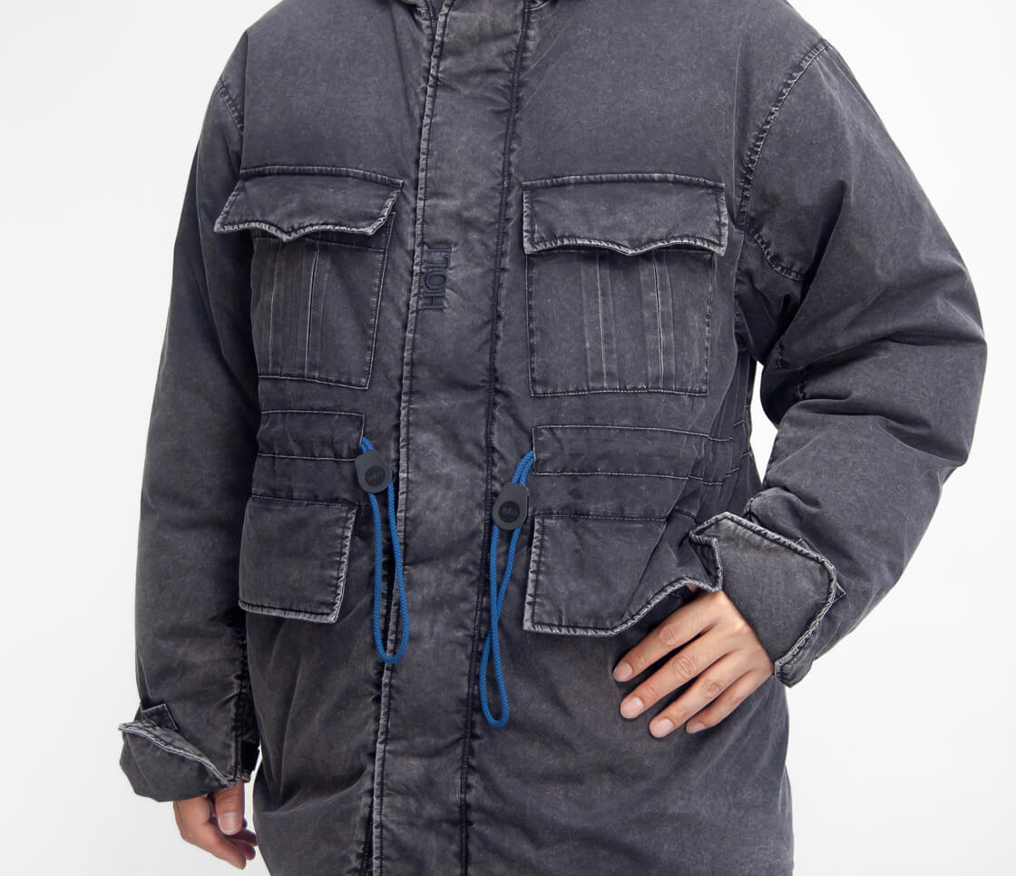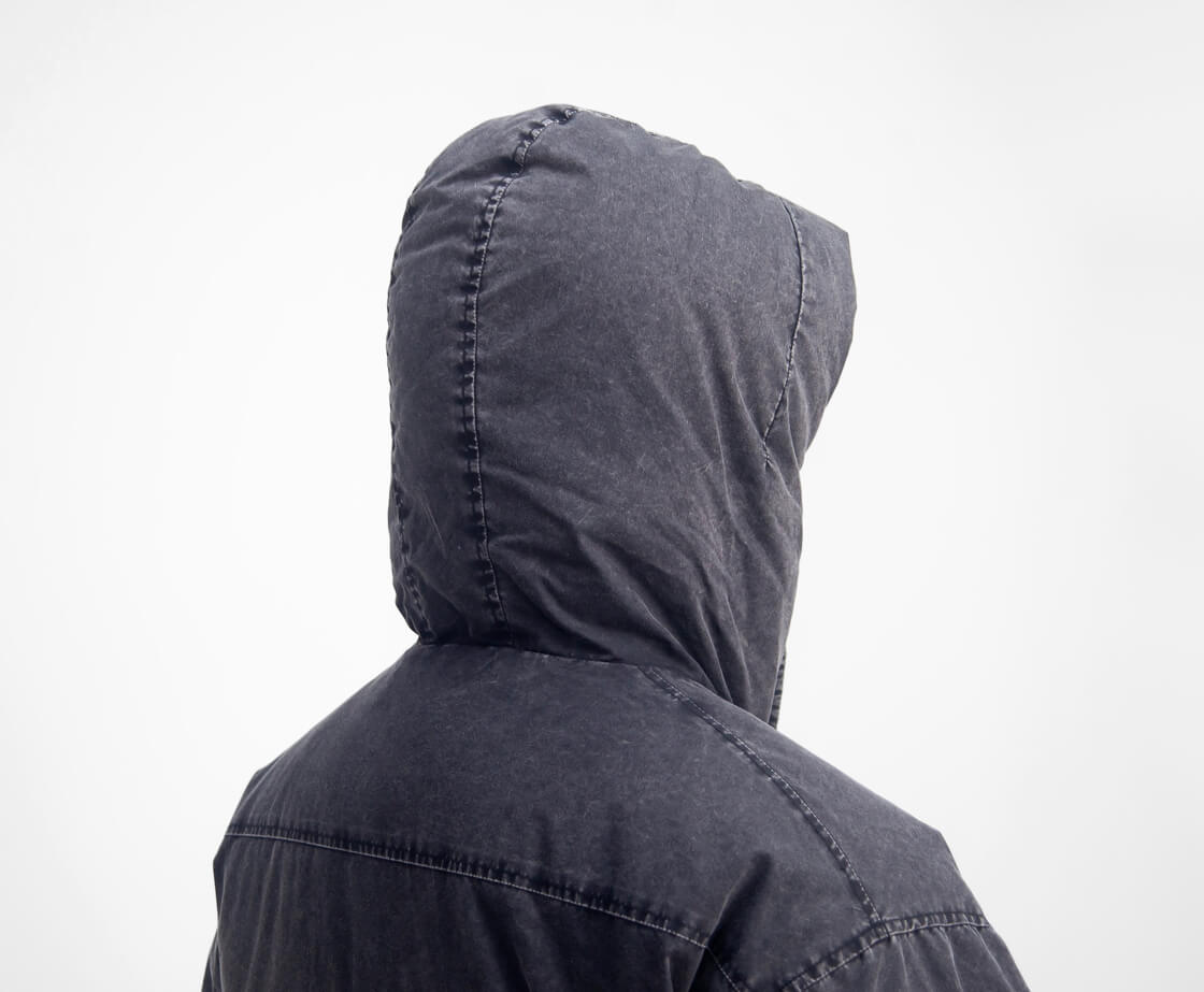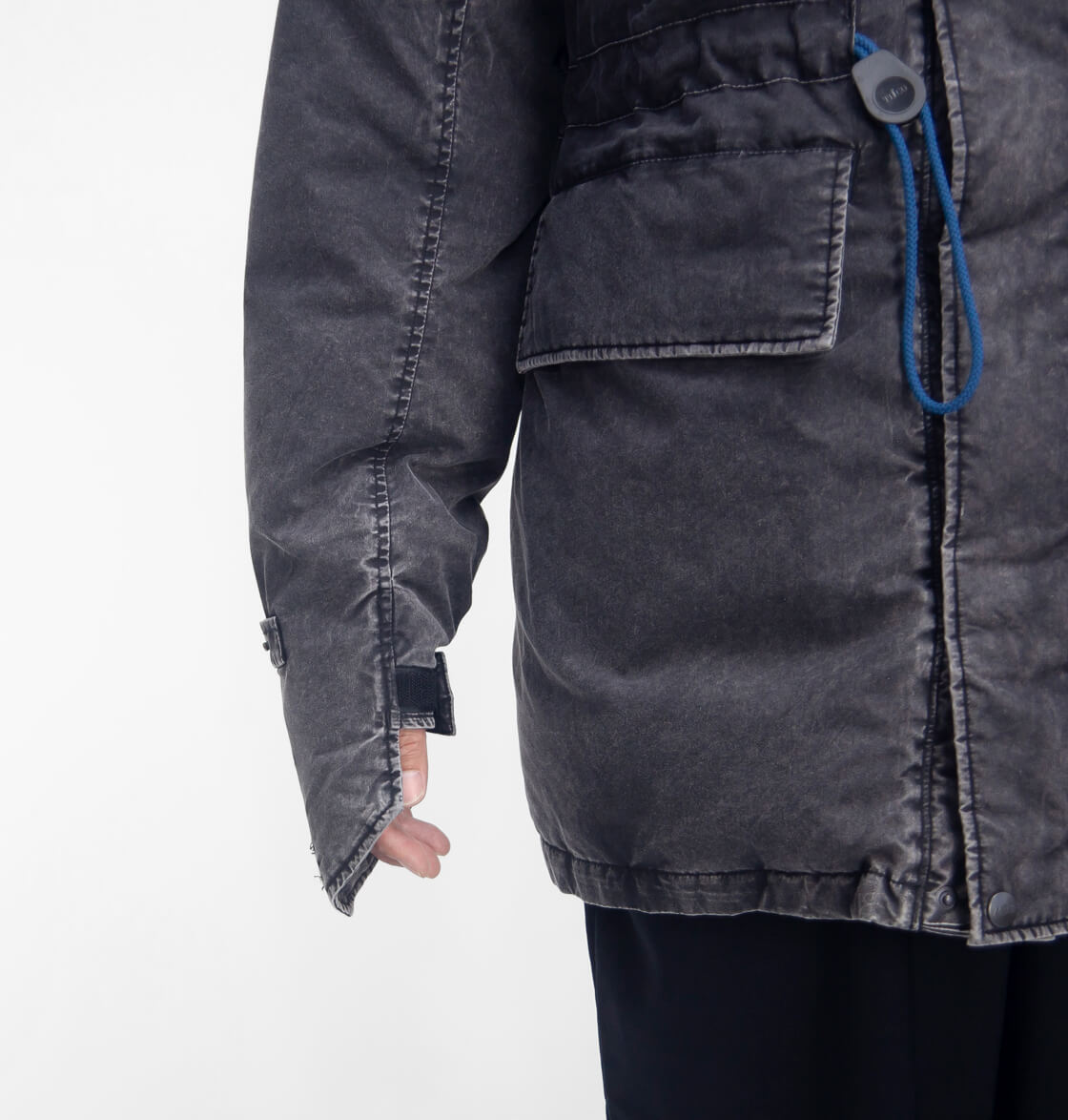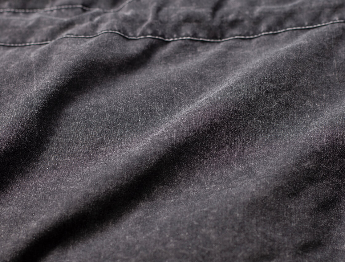 表地はコットン・ポリエステルの高密度生地を顔料染め+ケミカルウォッシュで仕上げ、ヴィンテージのようなフェード感を表現。