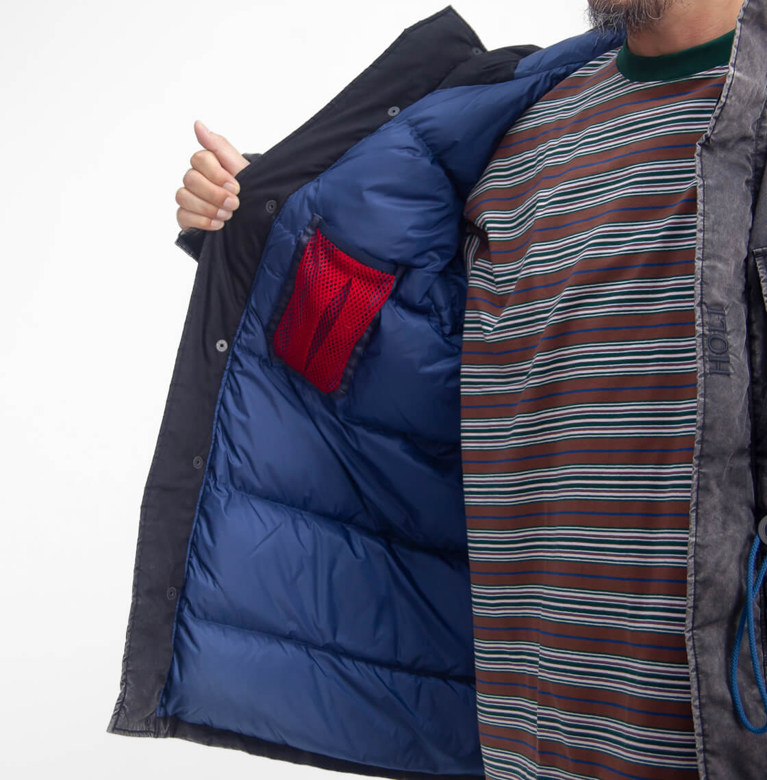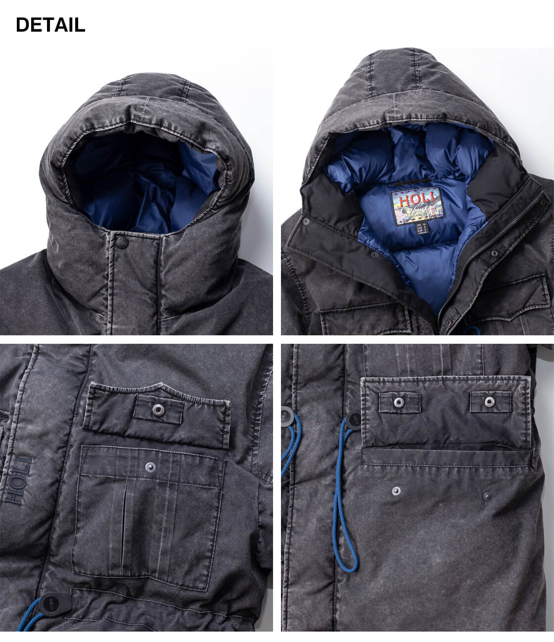 NANGAから、伝統的なアウトドアの雰囲気を残しながら都会的にアップデートされたダウンジャケットのご紹介。 南アジアに伝わるホーリー祭に着想を得て展開するカプセルコレクションの一着です。 胸・腰にはスナップポケット、ウエストコードでシルエット調整も可能。 M-65を彷彿とさせる三角ストラップ付き袖口や、片手で留められる浮きスナップなど、実用性とデザイン性を両立しています。 表地はコットン・ポリエステルの高密度生地を顔料染め+ケミカルウォッシュで仕上げ、ヴィンテージのようなフェード感を表現。 中綿にはリサイクルダウンを260g封入し、650フィルパワーの保温性を確保しています。 無骨でありながらも現代的なバランスを持ち、街にも馴染むNANGAらしい高機能ダウン。 アウトドアから日常まで活躍する、頼れる冬の相棒です。
