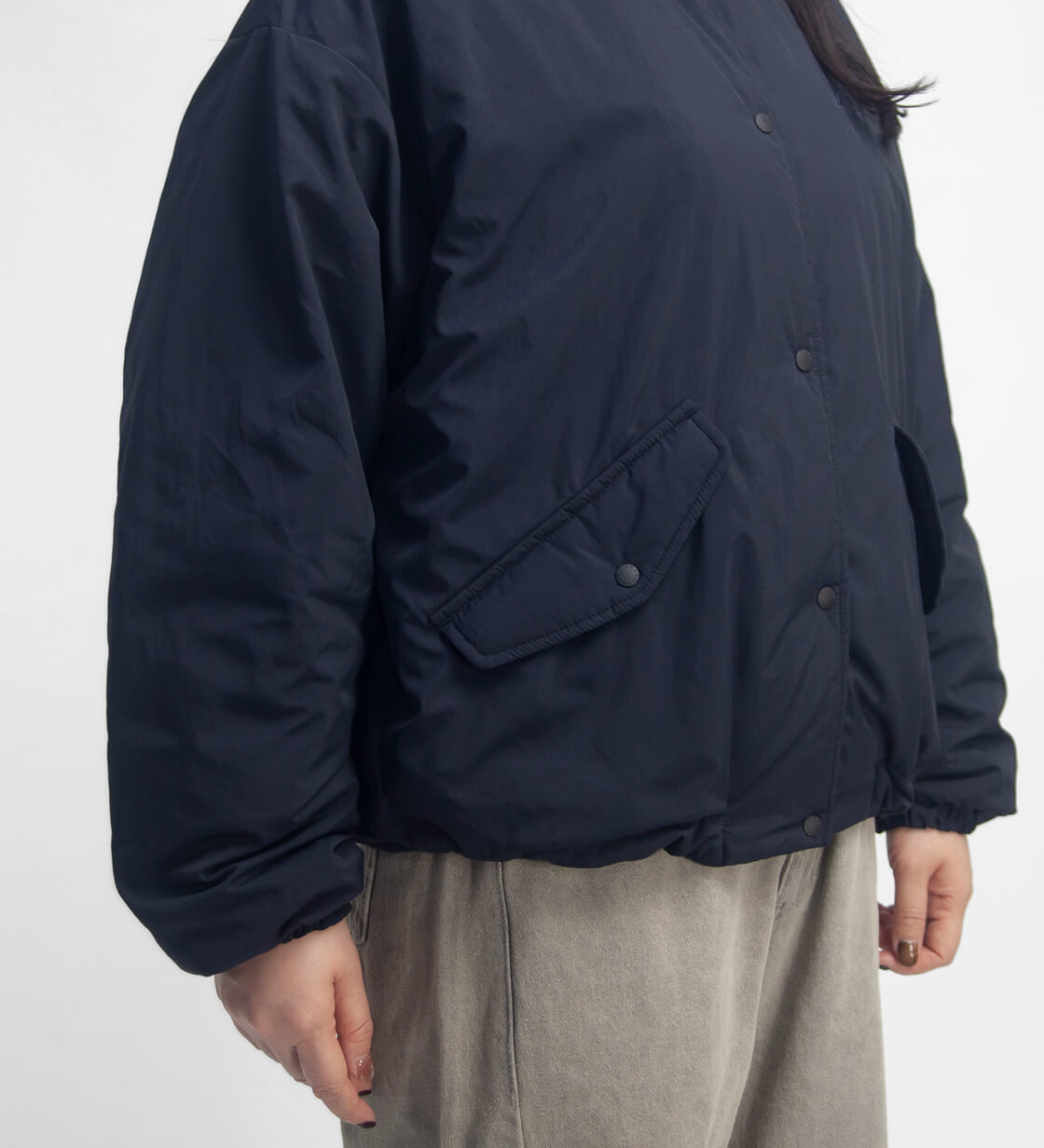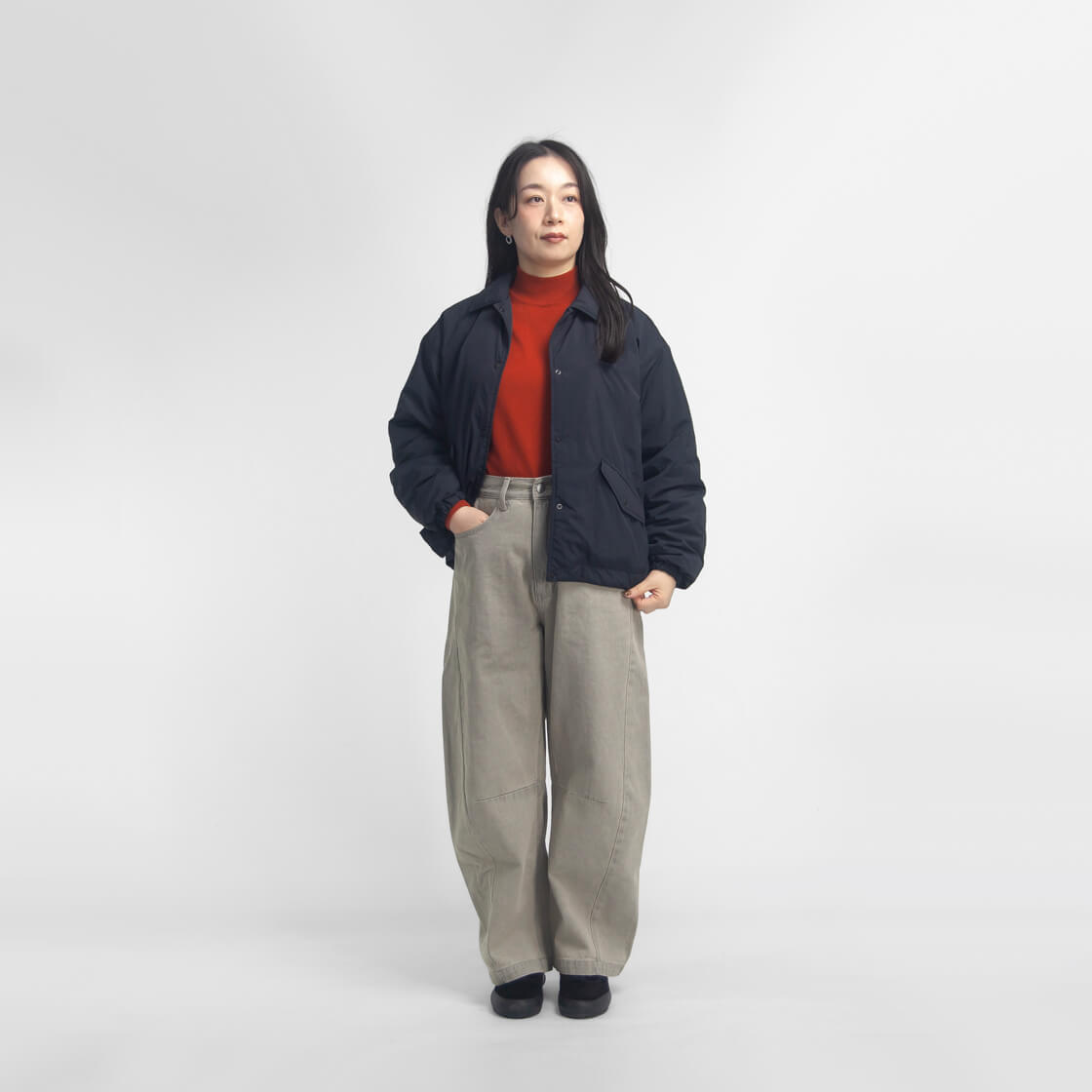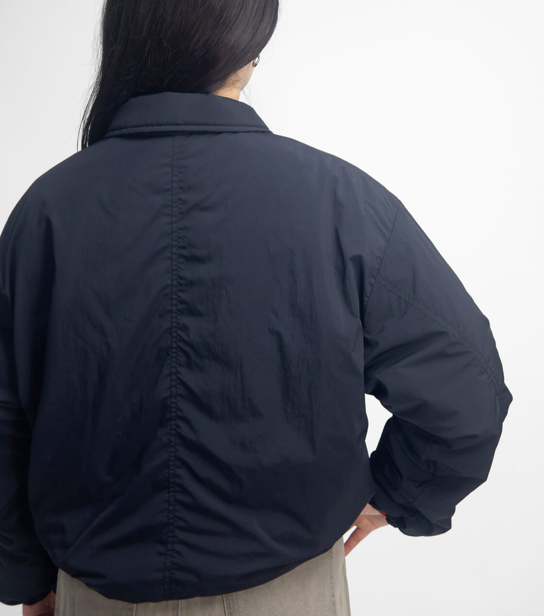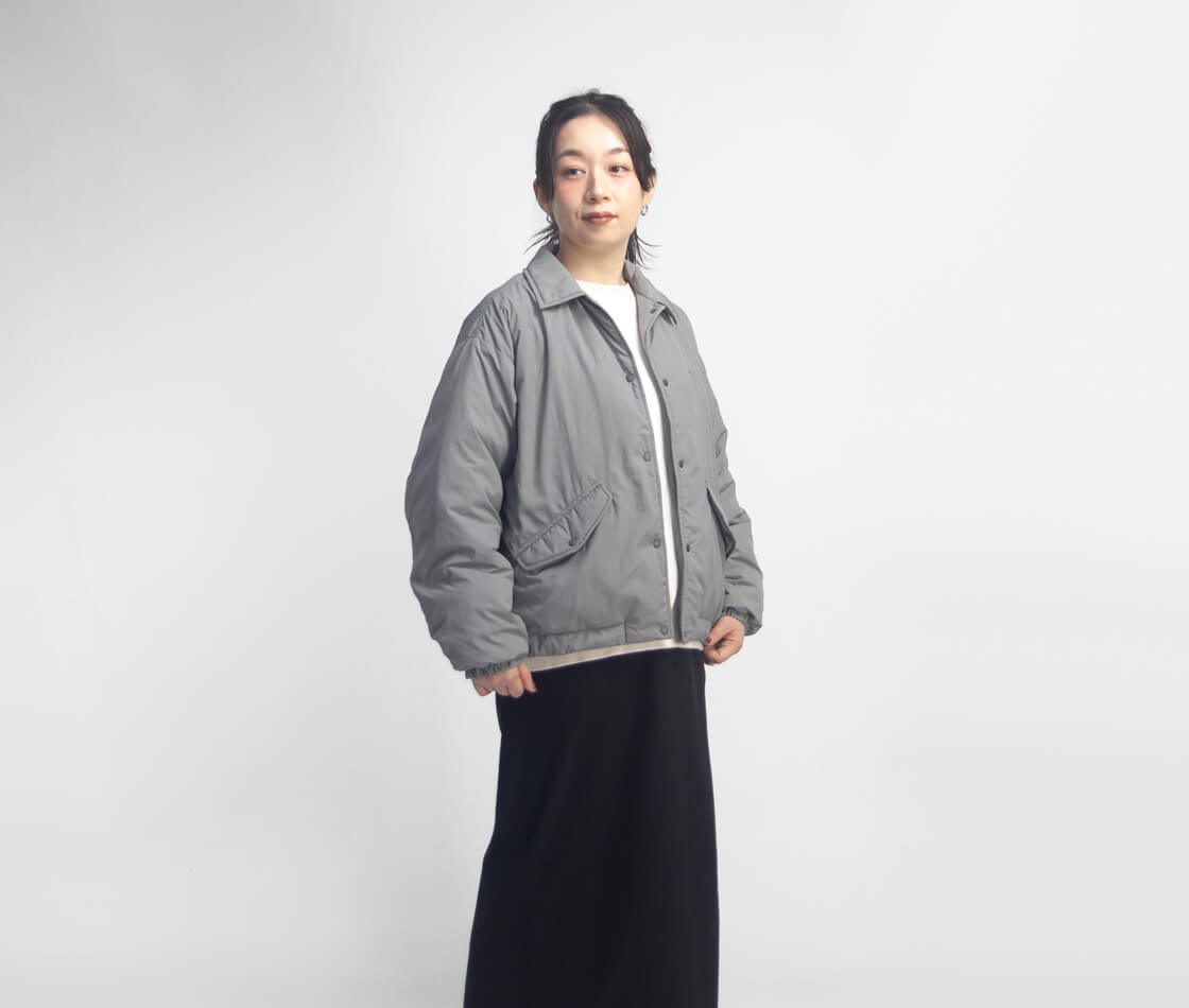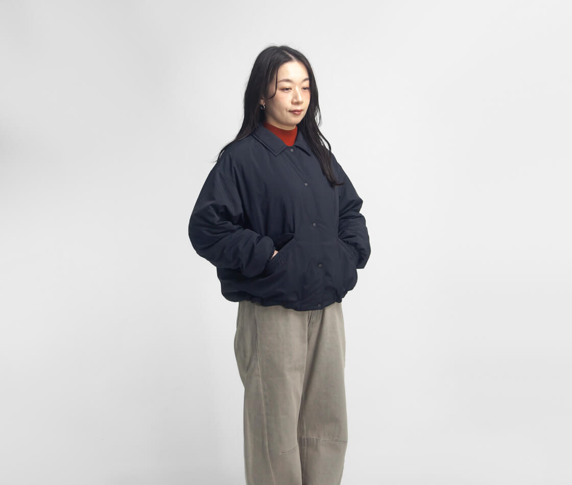 とにかく軽く、まるで空気を纏っているかのような、ふんわりとした着心地が魅力。ゆったりとしたシルエットに、コーチジャケットを大胆に短丈にしたクロップド丈が特徴で、裾のドローコードを絞ることで丸みのあるショートブルゾンのようなシルエットに変化します。スカートにもパンツにも合わせやすく、スタイリング次第で印象が変わるのもポイント。
