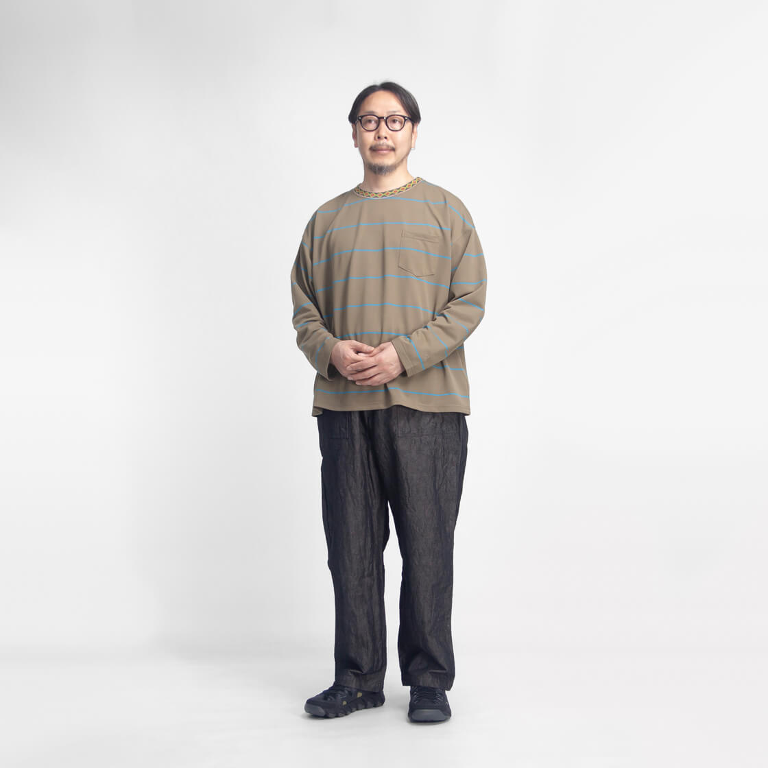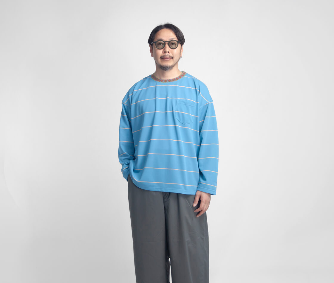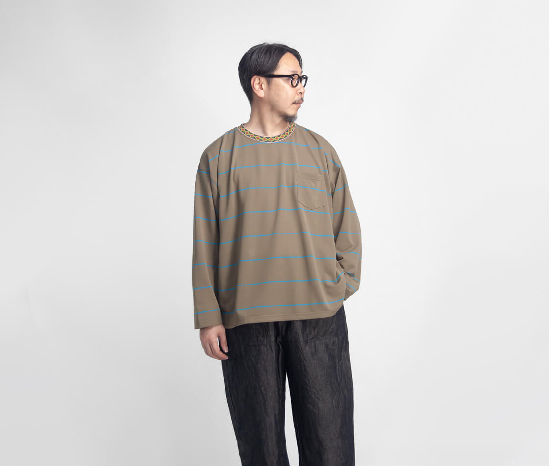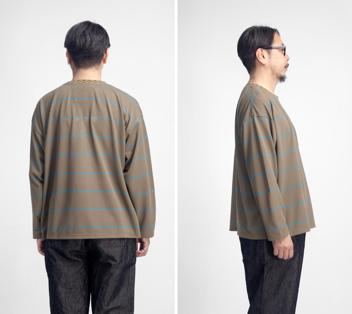 NANGAからオリジナルで編み立てたジオメトリックなリブが映える清涼感あるボーダーロンTをご紹介。 ネックのダイヤ柄リブは、配色ボーダーや背面刺繍と相まって存在感ある仕上がり。 身幅を広めに取ったボックスシルエットに、ゆとりのあるアーム設計でリラックスした着用感。 インナー使いでもアクセントになり、程よくラフなサイズ感です。 素材にはポリエステルの鹿の子生地を使用。 凹凸のある編みで肌離れが良く、通気性と速乾性に優れたドライなタッチが特徴。 季節の変わり目から活躍し、快適さとデザイン性を両立した一着。