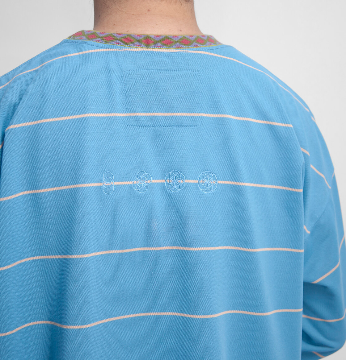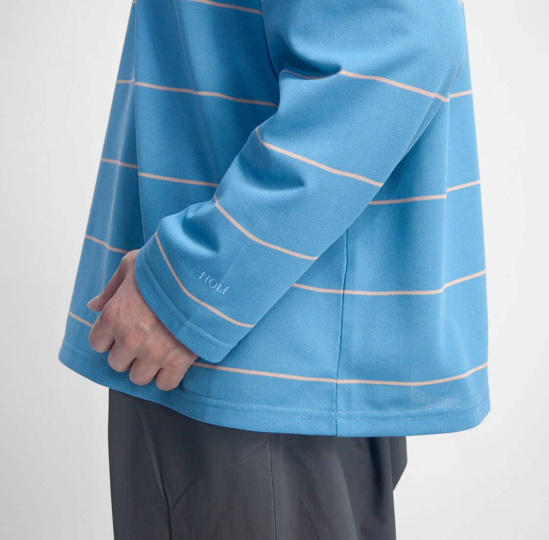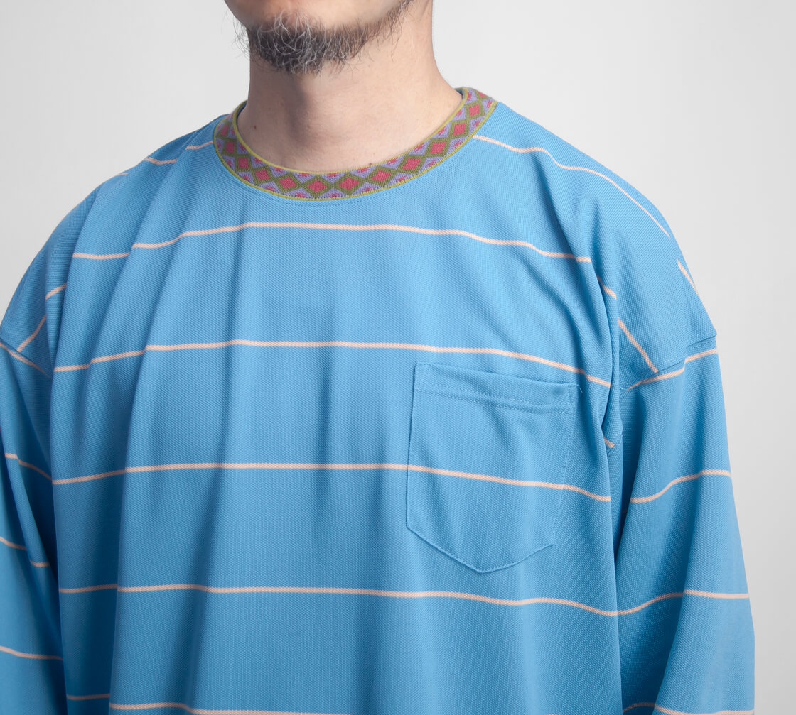 NANGAからオリジナルで編み立てたジオメトリックなリブが映える清涼感あるボーダーロンTをご紹介。 ネックのダイヤ柄リブは、配色ボーダーや背面刺繍と相まって存在感ある仕上がり。 身幅を広めに取ったボックスシルエットに、ゆとりのあるアーム設計でリラックスした着用感。 インナー使いでもアクセントになり、程よくラフなサイズ感です。 素材にはポリエステルの鹿の子生地を使用。 凹凸のある編みで肌離れが良く、通気性と速乾性に優れたドライなタッチが特徴。 季節の変わり目から活躍し、快適さとデザイン性を両立した一着。