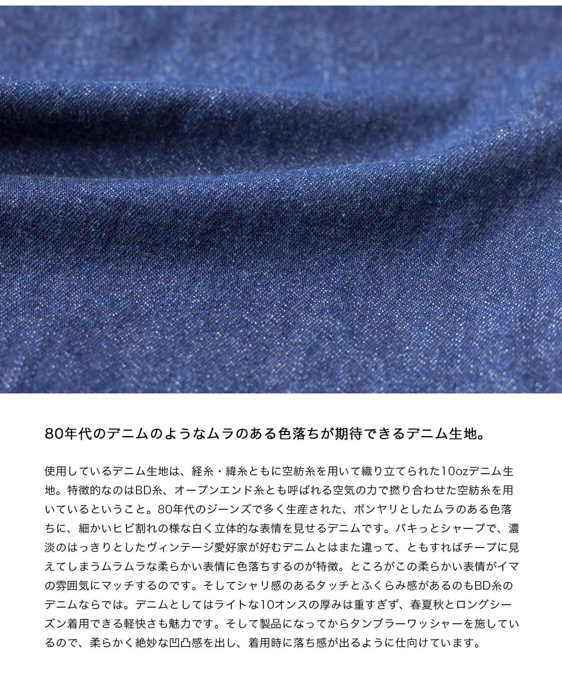 デニムとしてはライトな10オンスの厚みは重すぎず、春夏秋とロングシーズン着用できる軽快さも魅力です。