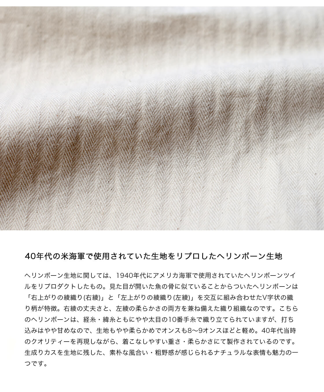 ヘリンボーン生地に関しては、1940年代にアメリカ海軍で使用されていたヘリンボーンツイルをリプロダクトしたもの。