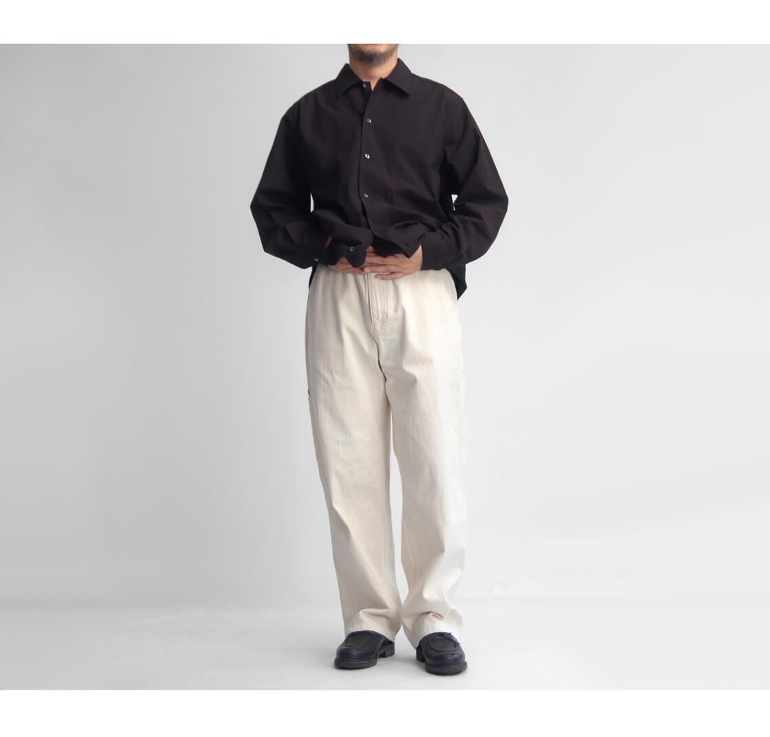 ペインターパンツらしいゆったりとした太目シルエットですが、膝から裾にかけてほんのりと細くなるようテーパードをかけることで、ズドンとしすぎないシルエットに仕上げられています。