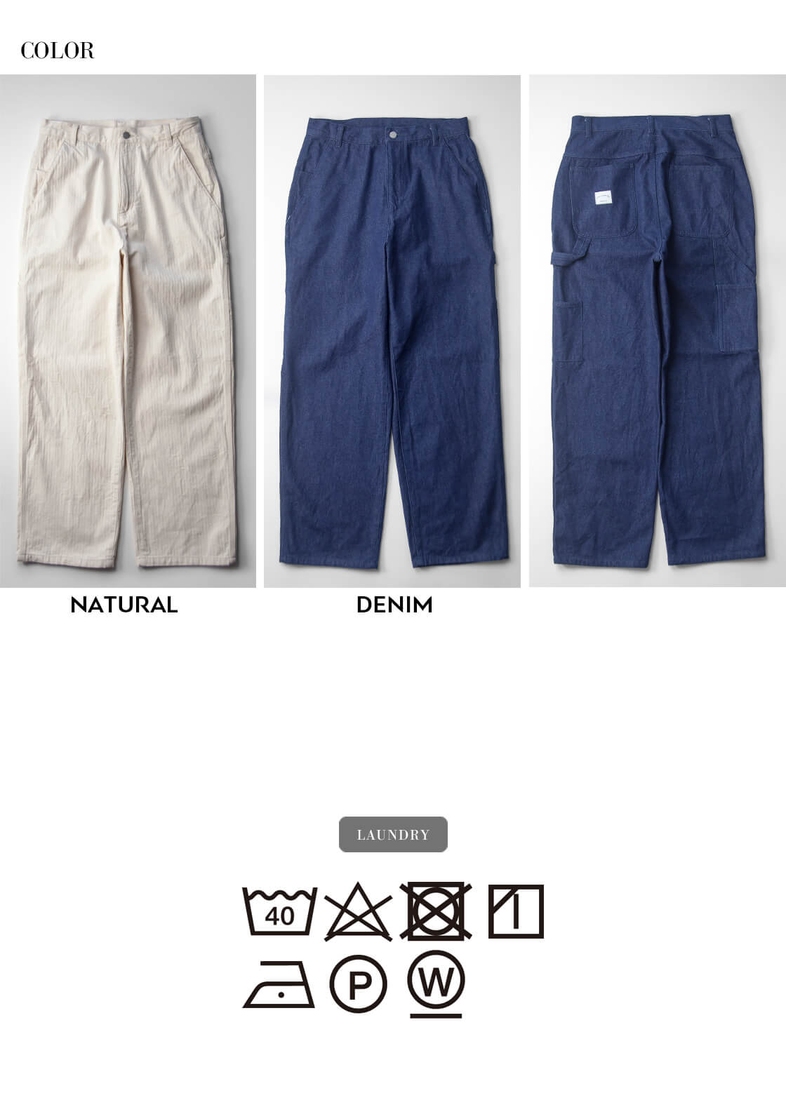紡績技術が未発達な時代の空紡糸デニムと、40年代米海軍のヘリンボーンツイルを再現した生地を使用した「PAINTER PANTS」。