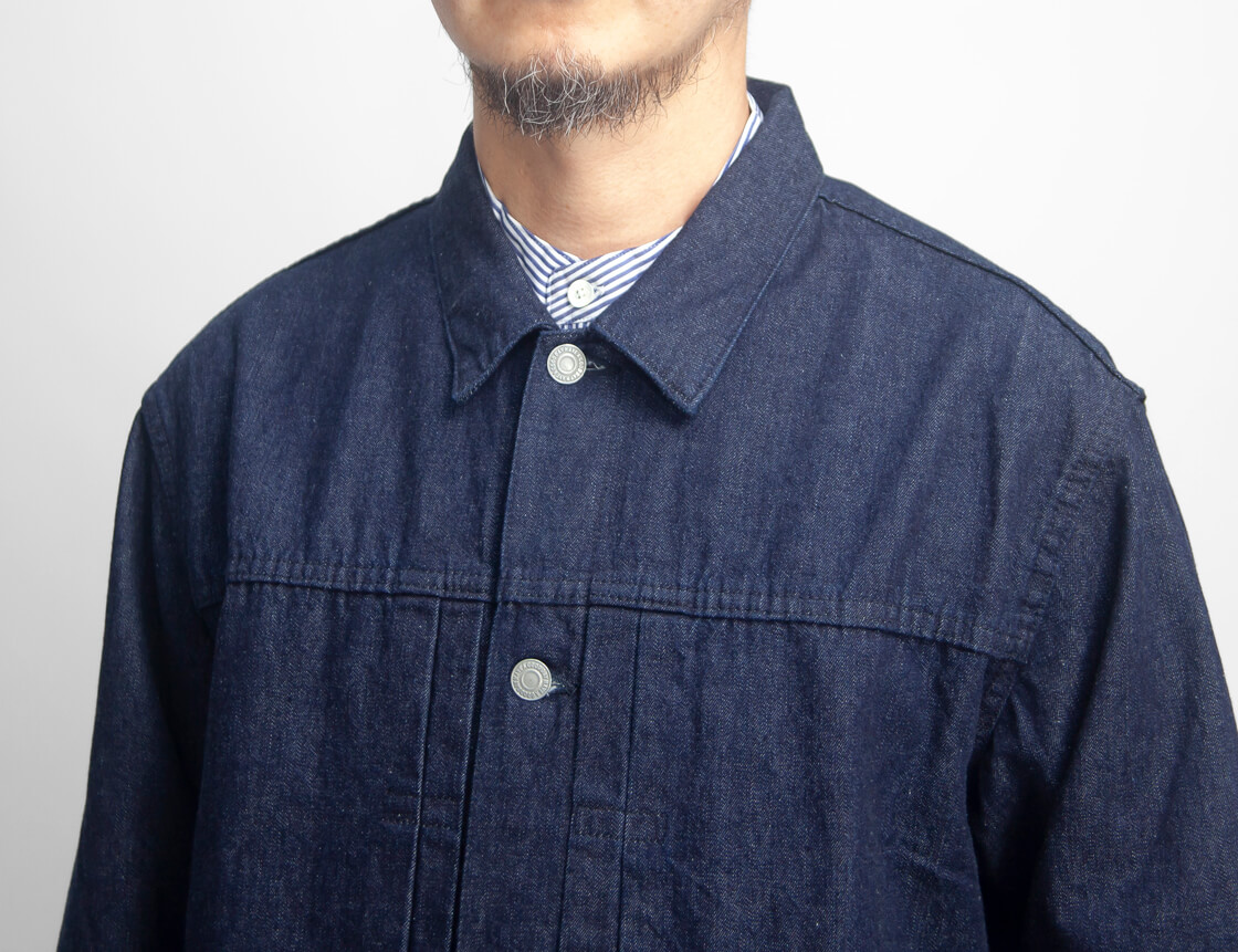 have a good dayからセルヴィッチデニムトラッカージャケットのご紹介。 クラシックな2ndタイプGジャンをベースに、日常に馴染むよう再構築された一着です。 特徴的なアクションプリーツは変わらず、ポケットを腰位置へと変更。 前立て裏にはセルヴィッチが覗き、メタル釦のみでミニマルな表情に。 背面には縦に通るプリーツを加え、動きと立体感を演出しています。 身幅にゆとりを持たせつつ短め丈でバランスの良いコンパクト感で幅広いスタイルに対応します。 旧式シャトル織機で織り上げた10オンスの柔らかいセルヴィッチデニムを使用。 独特な凹凸を持ち、経年変化も楽しめます。 製品洗いを施しているため縮みは少なく、届いた時から快適な着心地に。 クラシックな意匠を現代的にした、軽快に羽織れる、長く愛用いただけるデニムジャケットです。