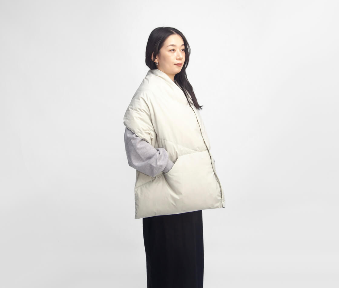 中綿にはサスティナブルなリサイクルダウンを60g封入し、650フィルパワーの高い保温力を実現。