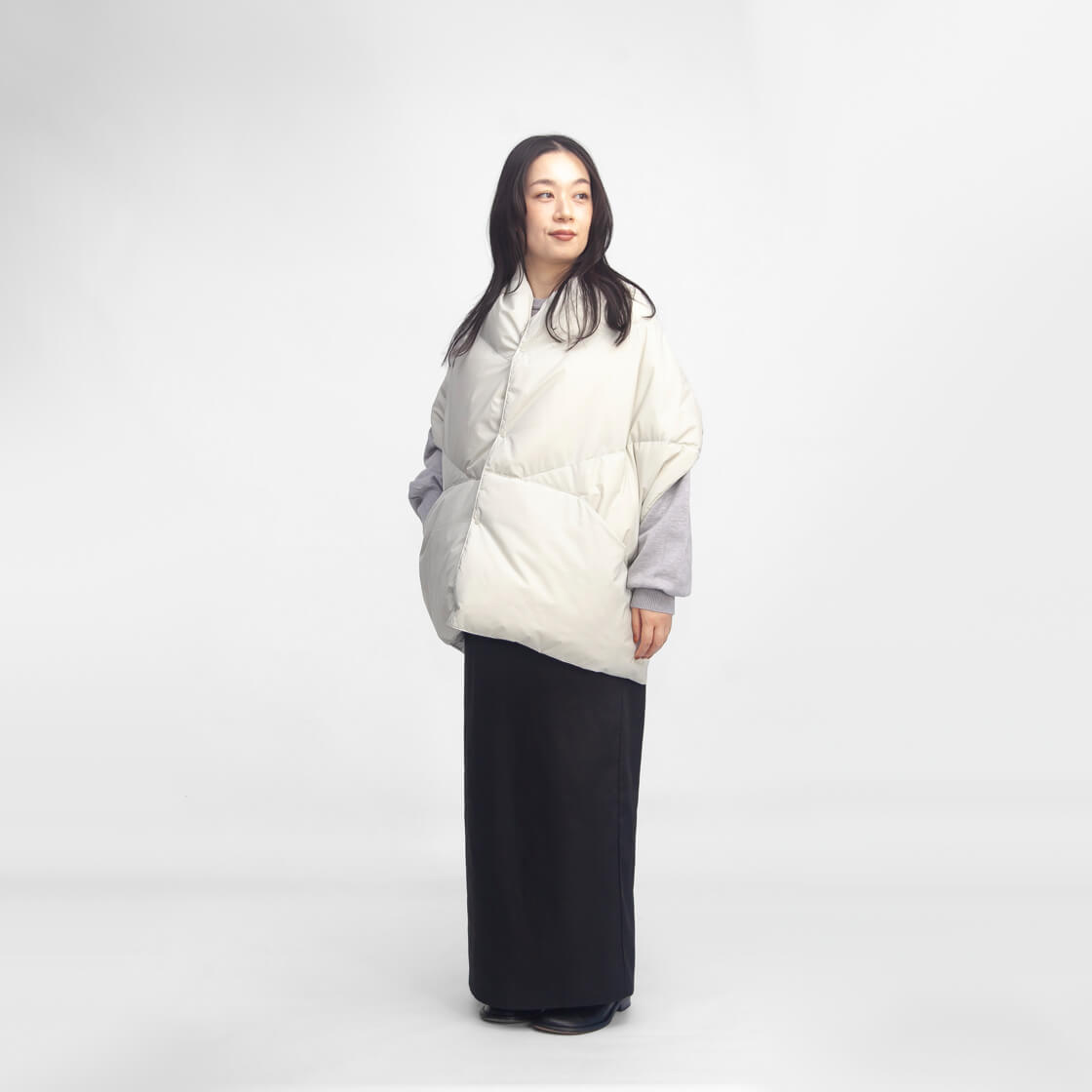 FREE / 全長約172cm / 幅約44cm / 重量約207g モデル着用 身長155cmでFREEサイズ 素材 表地(ナイロン100%) カラー展開 ベージュ、カーキ、アイボリー、ブラック 生産国 ベトナム モデル着用コメント さっと肩にかけてスナップを留めるだけと気軽に羽織れますし、そのままひざ掛けにでも使えます。アウターの上からでも羽織れるくらいで、スナップボタンを留めても苦しくありません。首後ろにあたる部分を折りたたんですっきりさせることもでき、寒いときは立てるとよりカバーできて暖かいです。背中側は短くはなりますが、肩掛けとしてちょうどいいサイズです。ダウンケットとしても一家に一つあると大変重宝すると思います。 |
