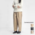 COMMENCEMENT(コメンスメント)より、ゆったりした履き心地ながら、テーパードラインできれいなシルエットのワイドパンツ「Wide Pants」をご紹介。 ヒップとワタリにたっぷりとボリュームをとり、裾に向かってやや細くなった丸いシルエットが美しいこちらの「Wide Pants(ワイドパンツ)」。 ウエストはゴム仕様となっており、ストレスなく着用いただけ、内側にはドローコードが設置されているのでサイズ調節も可能。 ウエストの前部分には大きめのインボックスタックが左右に入っており、膝を曲げやすい構造でアクティブに動く日にもお勧めです。 両脇には両玉縁ポケットが施されており、さらに手を入れやすいよう斜めに設置されたデザインは製作時の手間が伺えます。 本体に使用しているのは、ほど良い厚みとハリのあるコットンとポリエステルのツイル生地。 高密度で織られた光沢感のある表面と、見る角度によって色の見え方が変わる玉虫カラーは、イージーパンツ仕様ですが、綺麗めなコーディネートにも合わせやすい。 コットン100%の生地に比べると、型崩れしづらく、お洗濯による劣化も受けにくいので、イージーケア性が高いのも嬉しいポイント。 季節問わず使える生地なので、年間でも長期的に使える1本となっています。