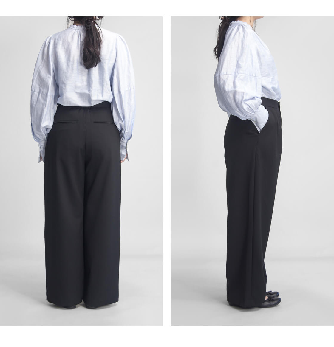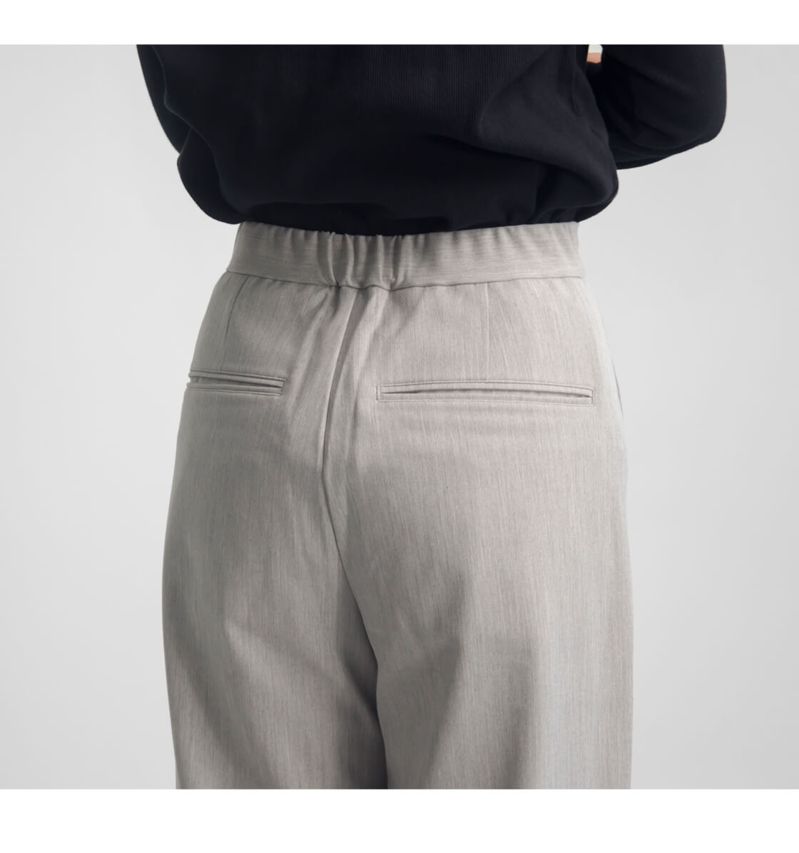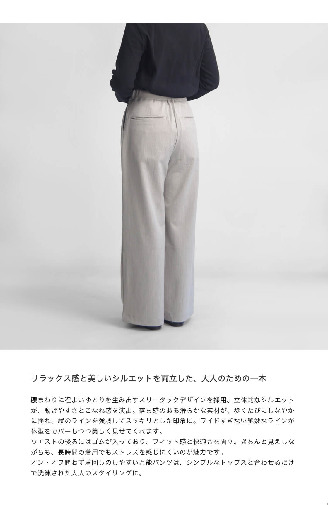 ウエストの後ろにはゴムが入っており、フィット感と快適さを両立。きちんと見えしながらも、長時間の着用でもストレスを感じにくいのが魅力です。