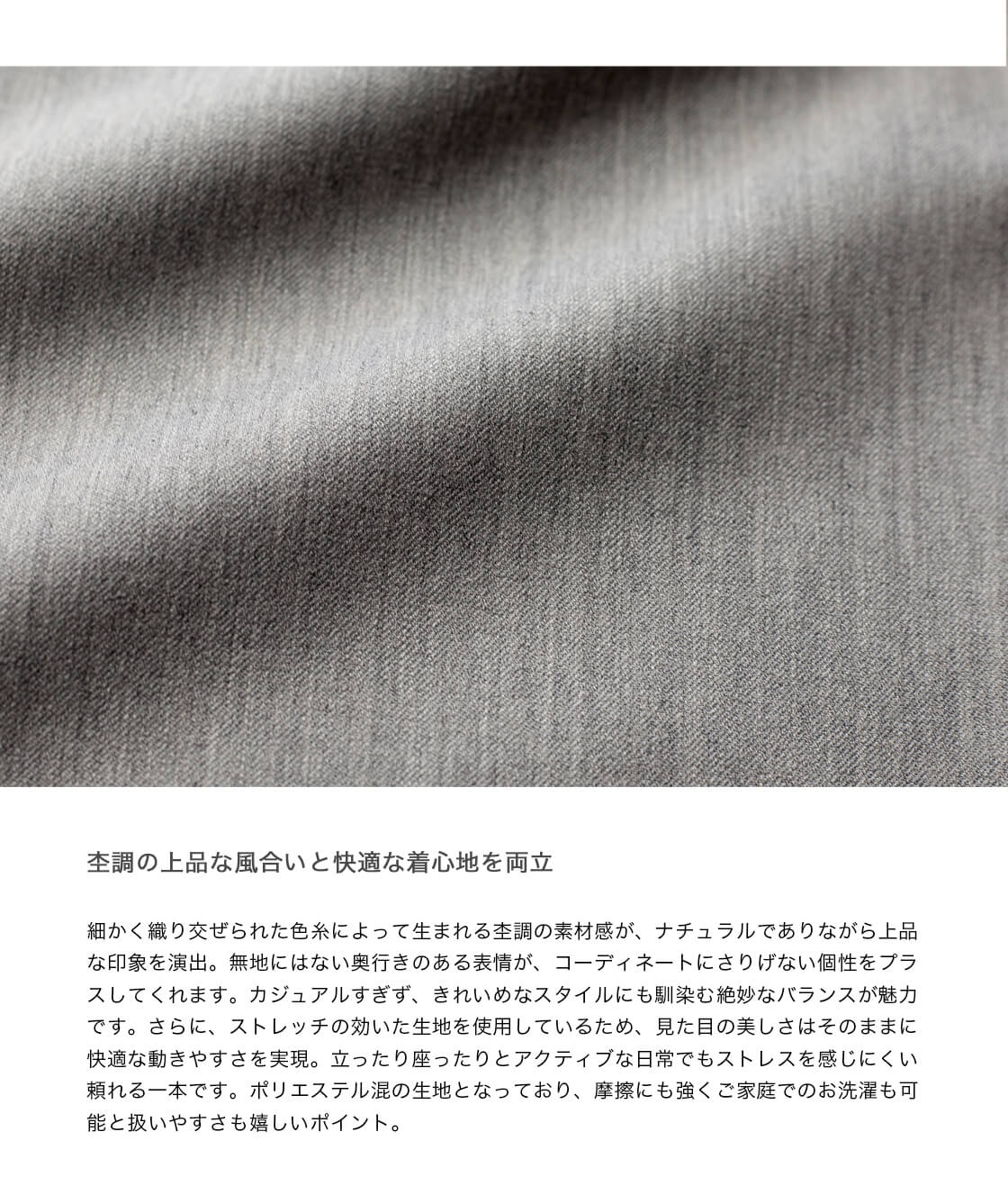 生地は細かく織り交ぜられた色糸によって生まれる杢調の素材感が、ナチュラルでありながら上品な印象。