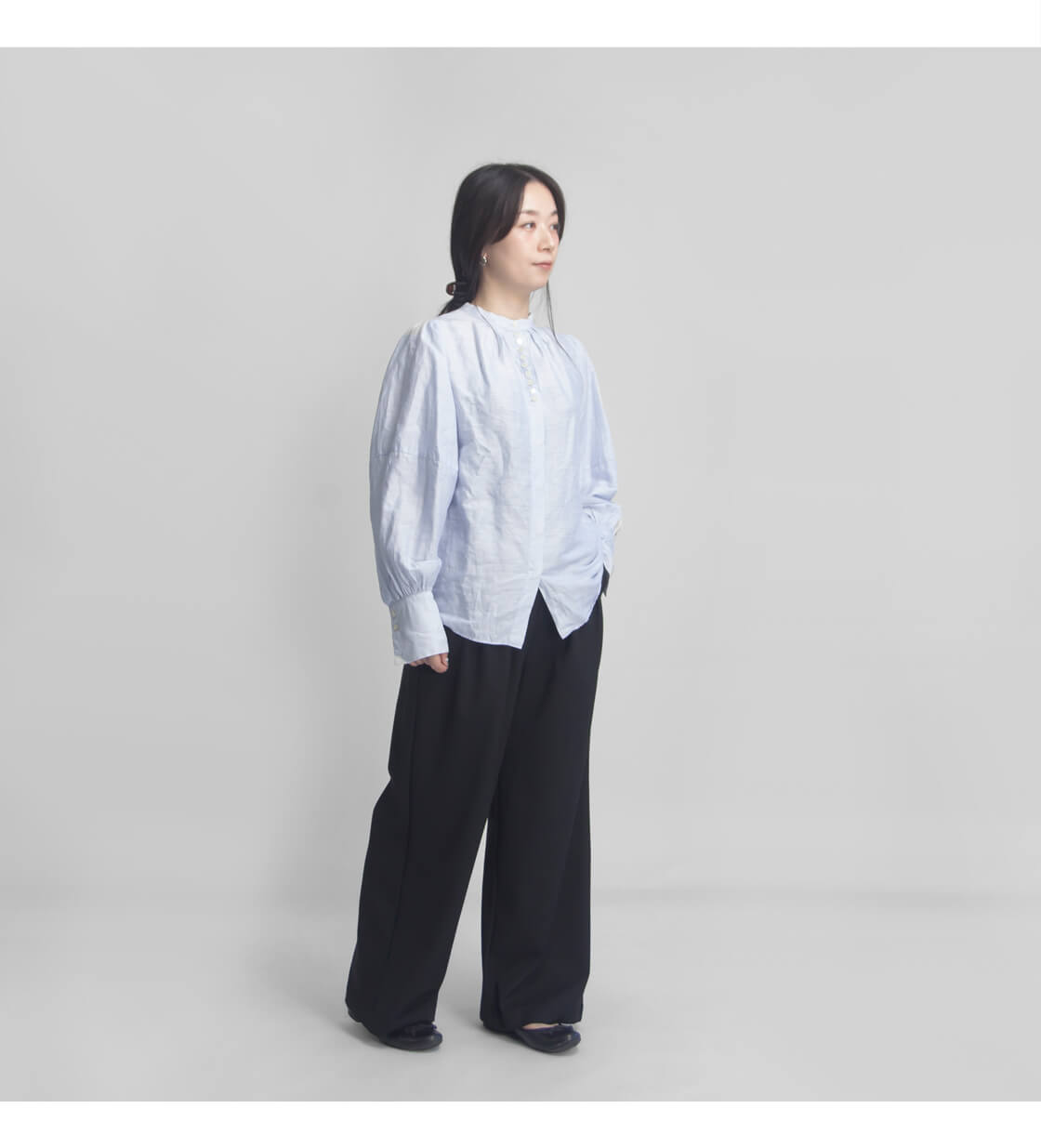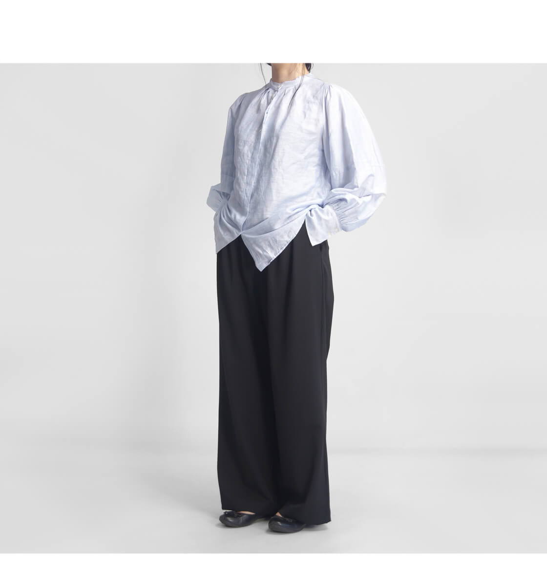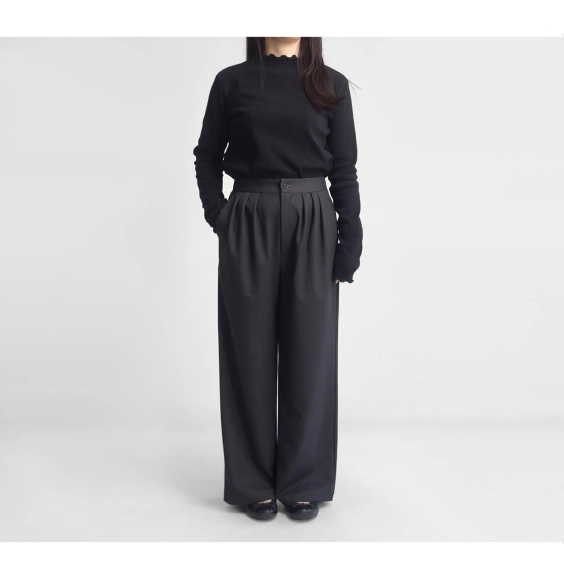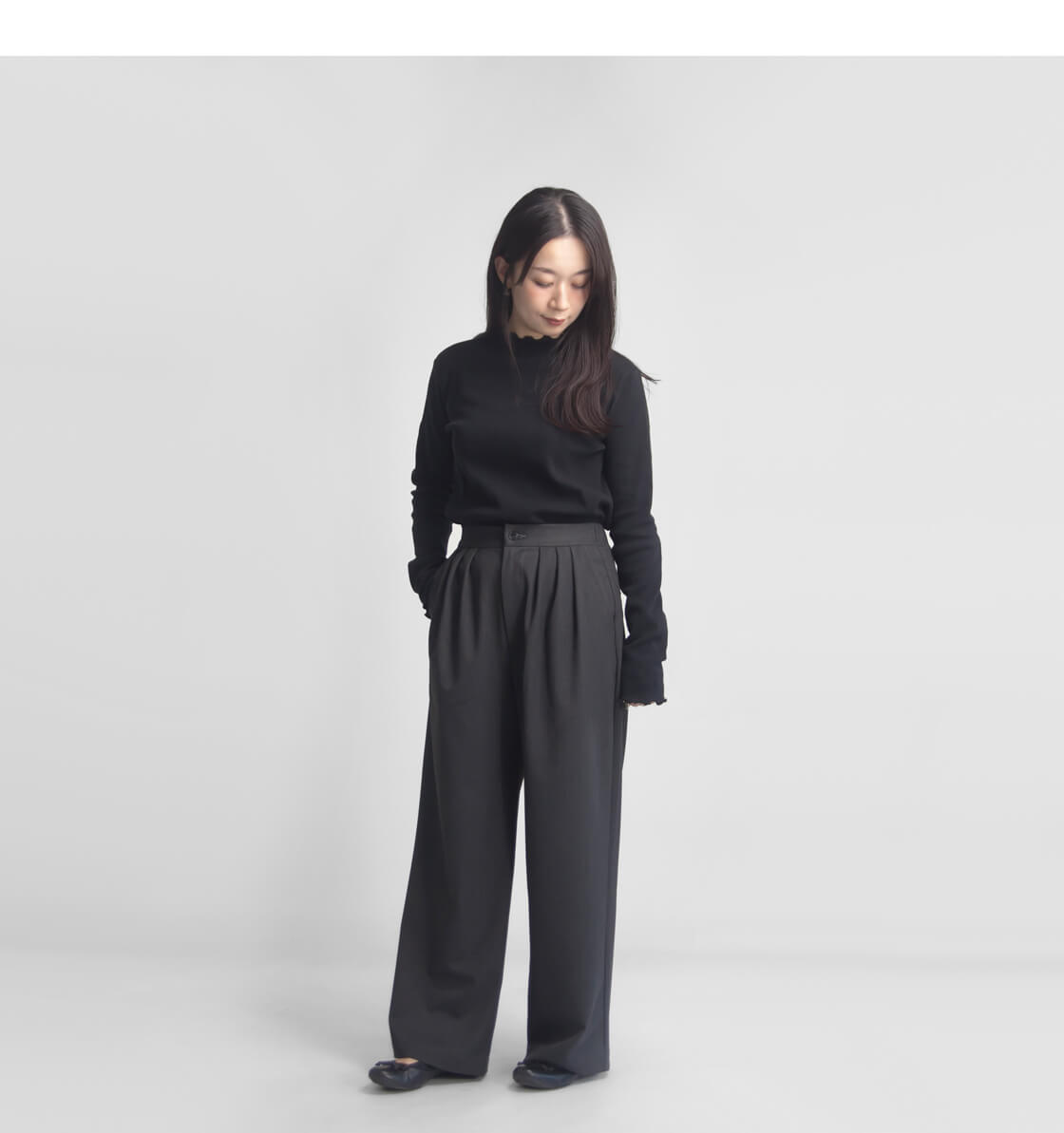 落ち感のある滑らかな素材が、歩くたびにしなやかに揺れ、縦のラインを強調してスッキリとした印象に。ワイドすぎない絶妙なラインが体型をカバーしつつ美しく見せてくれます。