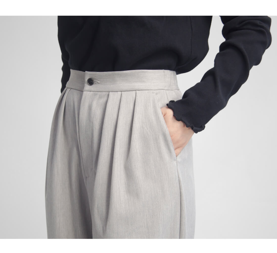 腰まわりに程よいゆとりを生み出すスリータックデザインを採用した「Wide tac slacks(ワイドタックスラックス)」。