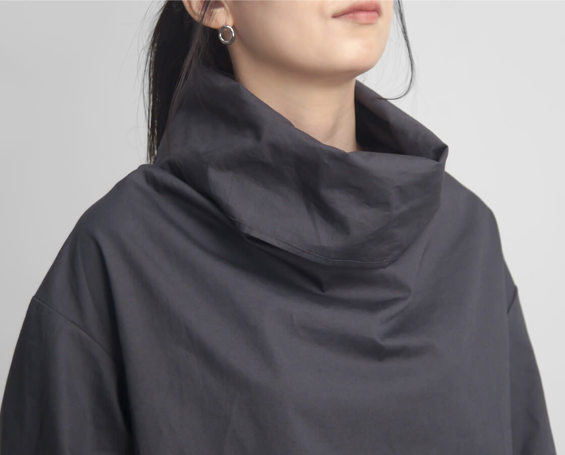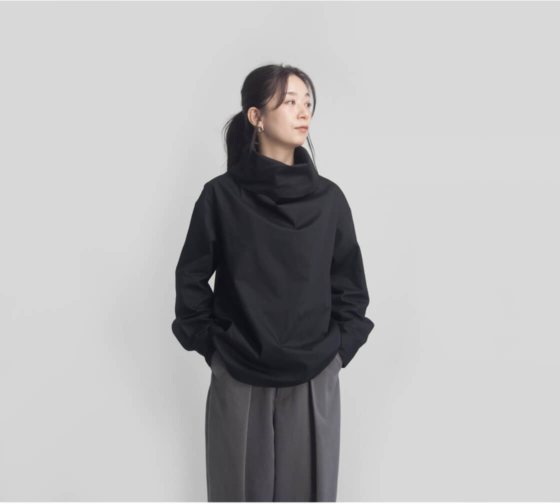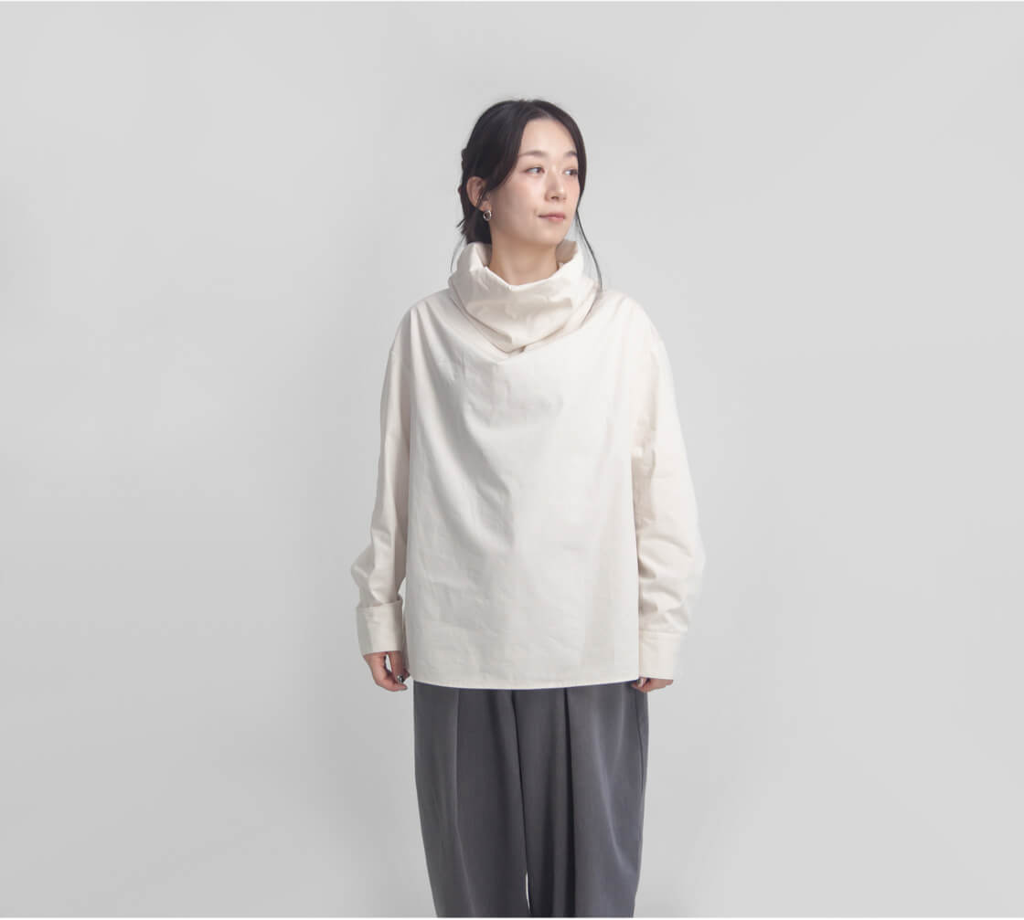 ハリ感のある生地を使用しており、オフタートルの首元は自然に立ち上がり、顔まわりに美しい立体感を演出してくれます。ふんわりとボリュームをもたせ立ち上げても、くしゅっと崩しても◎整え方次第で表情が変わるので、1枚で着てもサマになる、着回し力抜群のデザインです。