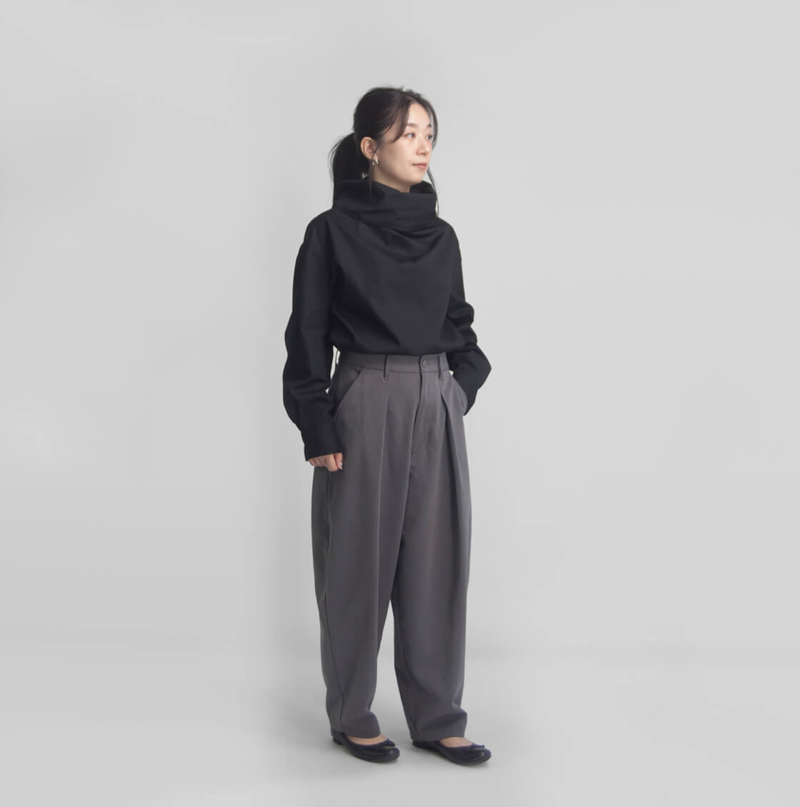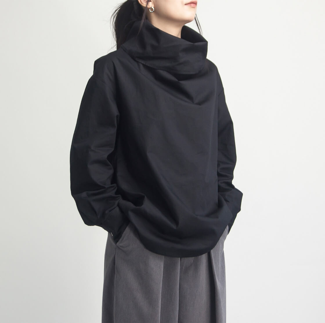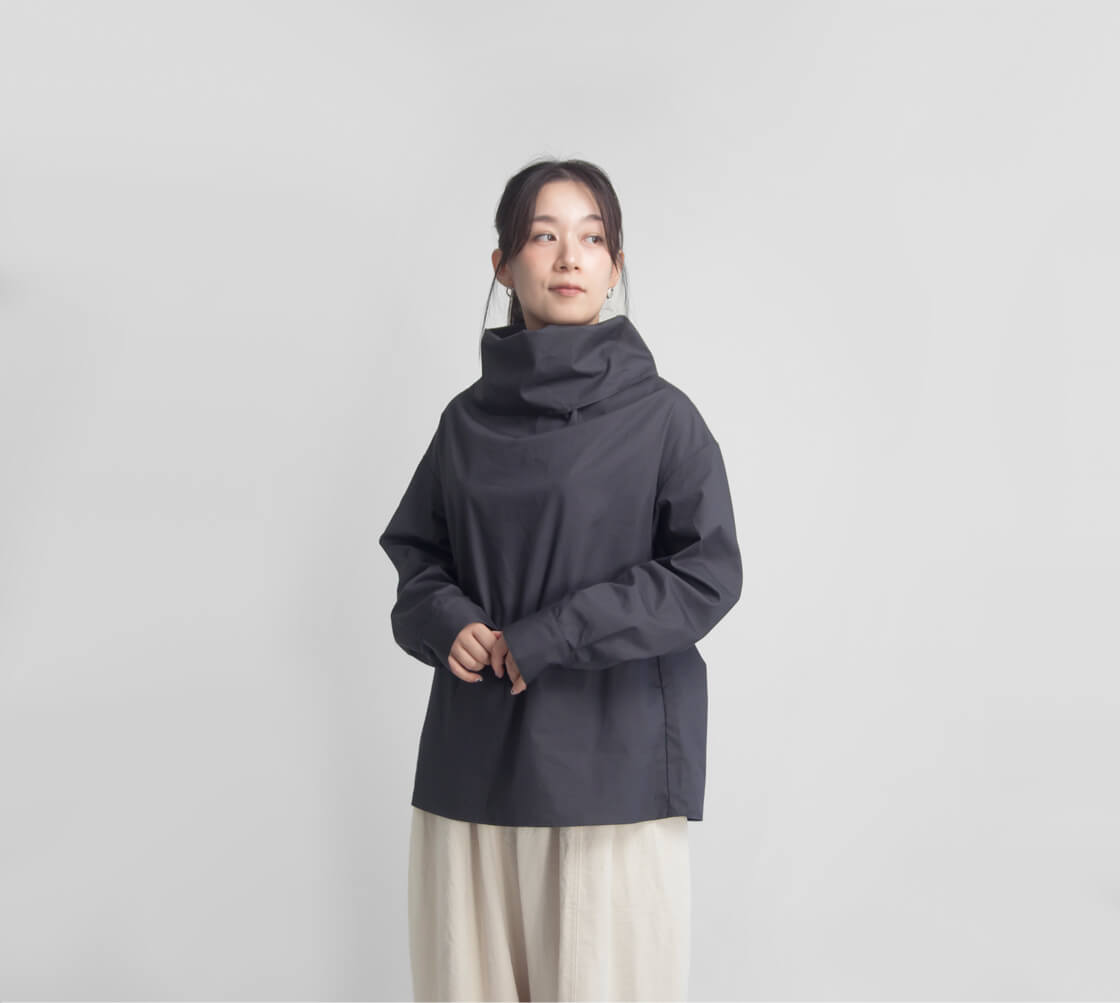 ハリ感のある生地を使用しており、オフタートルの首元は自然に立ち上がり、顔まわりに美しい立体感を演出してくれます。ふんわりとボリュームをもたせ立ち上げても、くしゅっと崩しても◎整え方次第で表情が変わるので、1枚で着てもサマになる、着回し力抜群のデザインです。