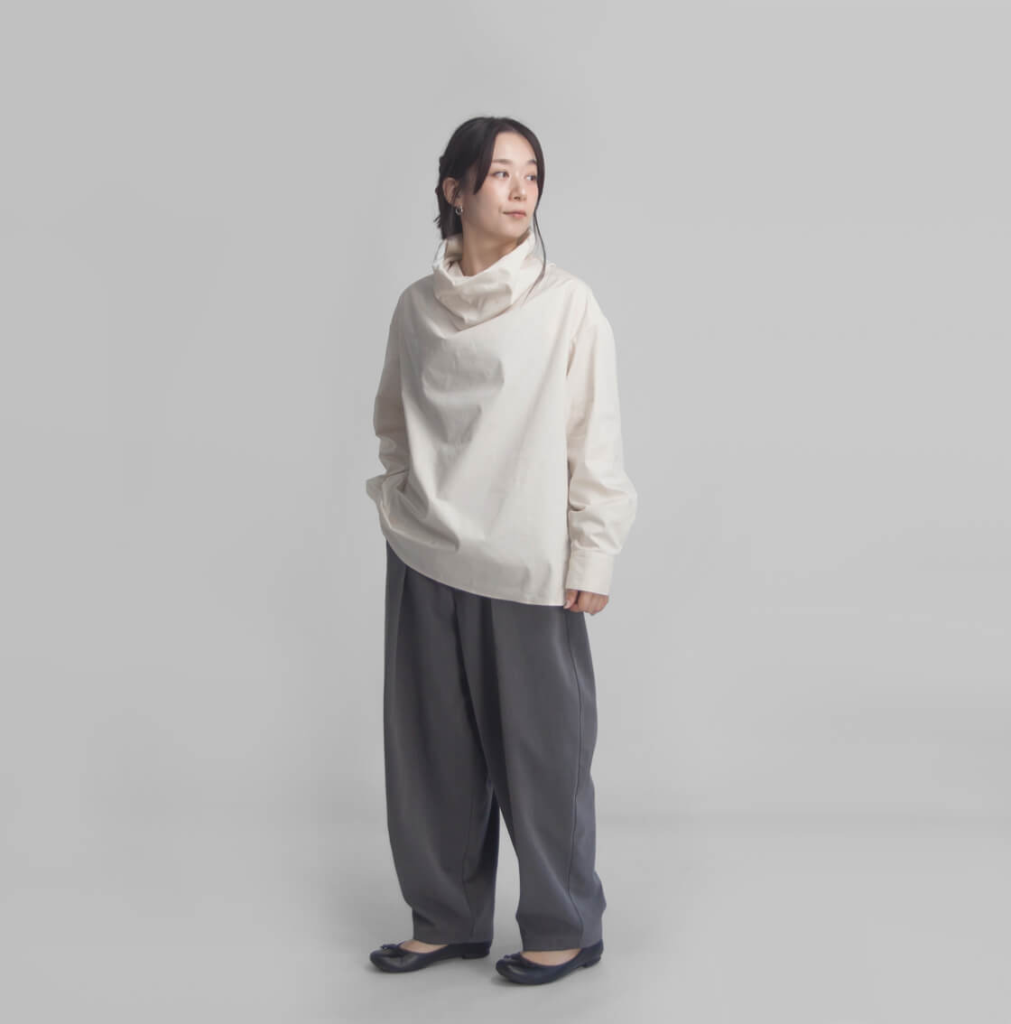 春や秋にぴったりの軽やかな着心地と、上品な雰囲気を兼ね備えたオフタートルシャツ。 ハリ感のある生地を使用しており、オフタートルの首元は自然に立ち上がり、顔まわりに美しい立体感を演出してくれます。ふんわりとボリュームをもたせ立ち上げても、くしゅっと崩しても◎整え方次第で表情が変わるので、1枚で着てもサマになる、着回し力抜群のデザインです。 後ろ身頃のセンターにはタックを施し、ほどよいゆとりと立体感をプラス。バックスタイルにもさりげないアクセントを加えながら、動きやすさにも配慮した仕立てです。 袖口はすっきりとしたカフス仕様できちんと感を演出し、オン・オフ問わず活躍します。 シルエットはややゆったりとしており、身体のラインを拾いすぎず、カジュアルなパンツにもフェミニンなスカートにも相性が良い。普段のお出かけはもちろん、オフィスカジュアルにもおすすめの1枚です。