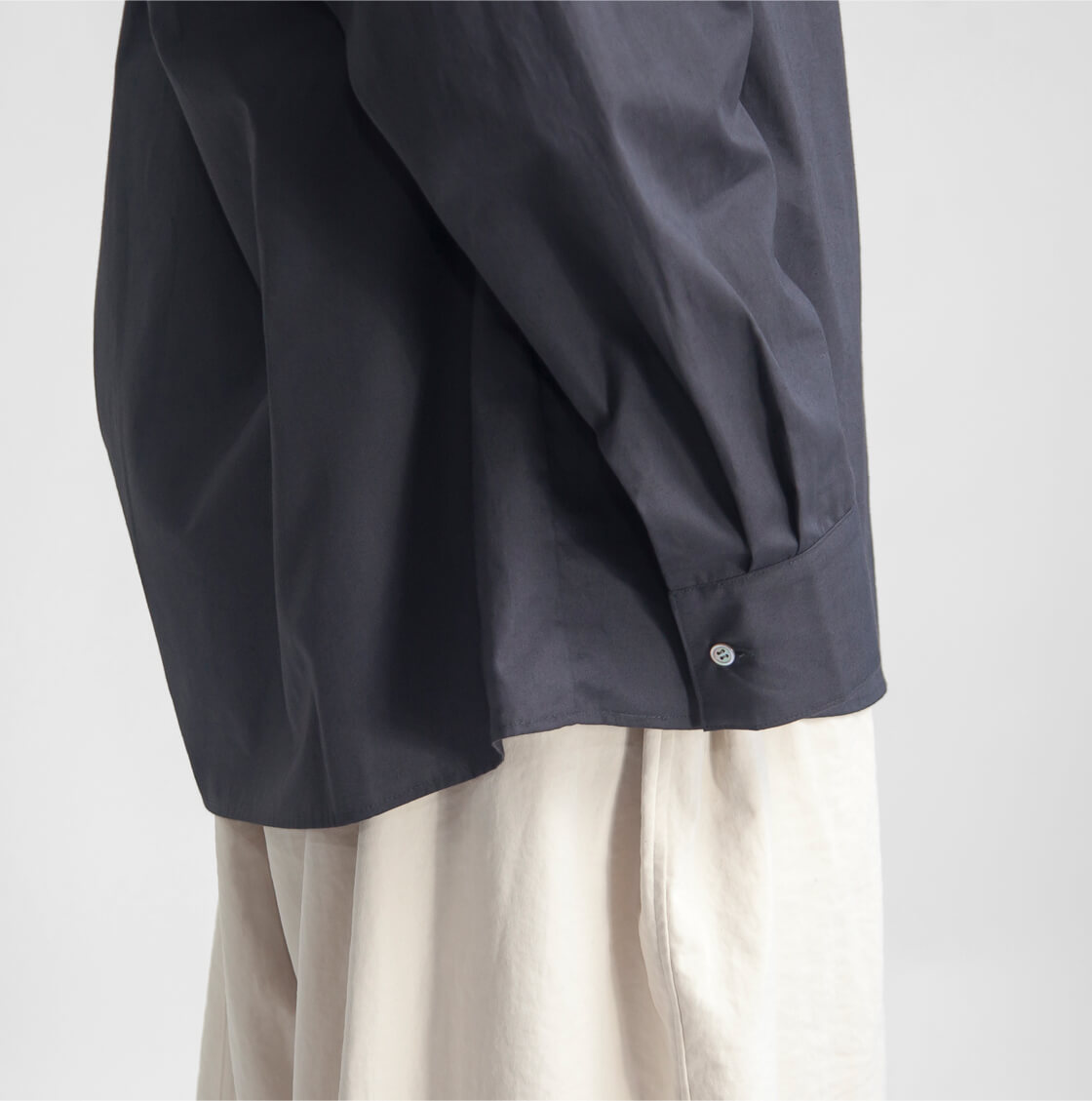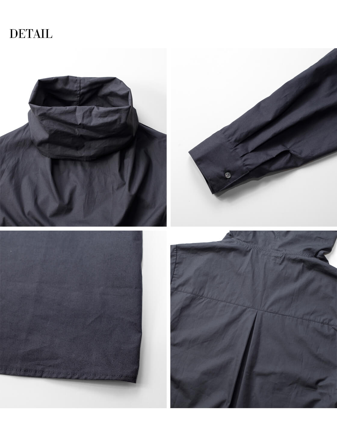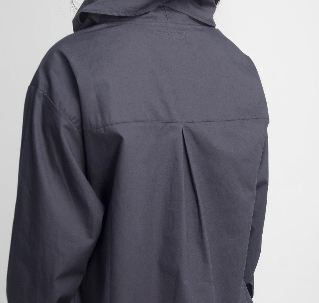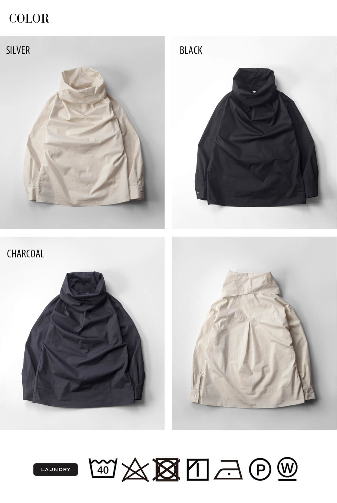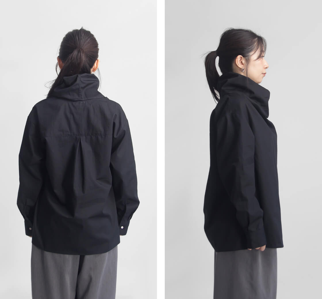 FREE / 着丈65 / 身幅51 / 肩幅48 / 袖丈55 モデル着用 155cm 素材 綿100% カラー展開 シルバー、ブラック、チャコール 生産国 日本 モデル着用コメント 首元までボリュームのあるプルオーバーシャツですが、身幅や首周りにゆとりがあるので着脱のしにくさはありません。袖丈はやや長めながら、カフス仕様できちんと感があり、だらしない印象になりません。着丈はヒップがすっぽり隠れるほどの長さで、そのままでもボトムスと合わせやすく、また、タックインもしやすい長さとなっています。 |