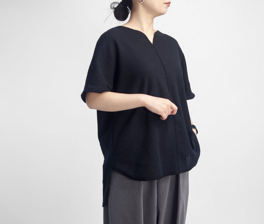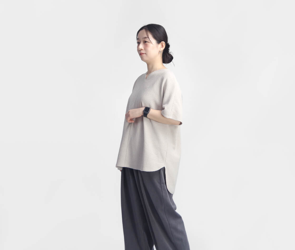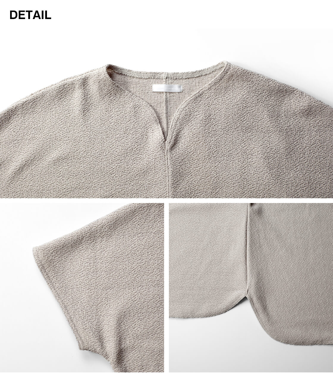 身幅はゆったりとしたリラックス感のあるシルエットで、体のラインを拾いにくく、さりげなく体型をカバーしてくれるデザイン。締め付け感がなく、デイリーにも着やすい着心地が魅力です。 ![]() 汗をかいてもさらりと快適、素肌にもやさしい梨地編み素材。
