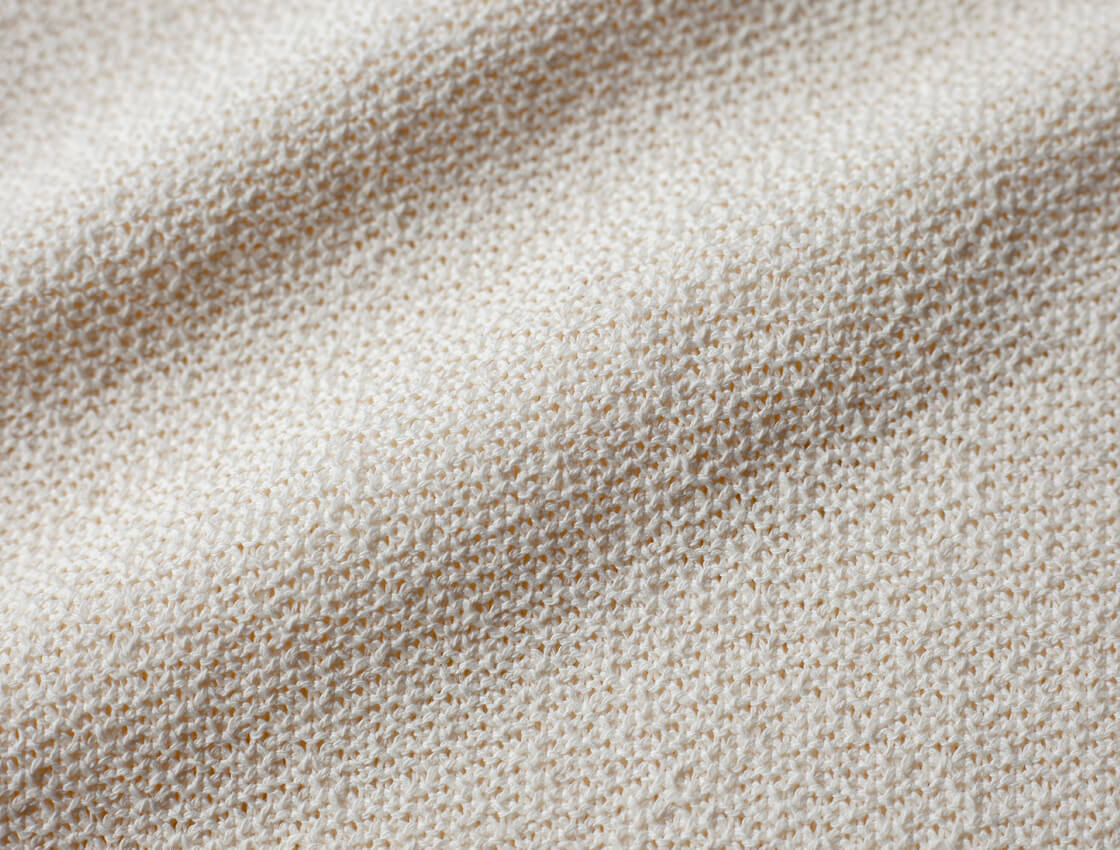 表面にほどよい凹凸を持つ梨地編み素材を使用。汗をかいても肌に張りつきにくく、長時間さらりとした着心地が続きます。素肌に触れても心地よく、インナーにタンクトップなど薄手のものを合わせれば、トップスとして1枚でも快適に過ごせます。軽量でストレッチ性があり、動きやすさも抜群。ドライタッチで快適ながら、しなやかな風合いで上品な印象を与えます。洗濯後もしわになりにくく、お手入れが簡単。速乾性に優れているため、お洗濯後すぐに乾くのも嬉しいポイントです。