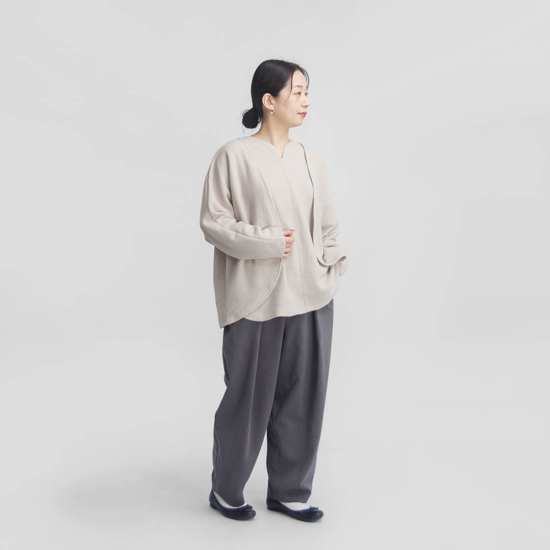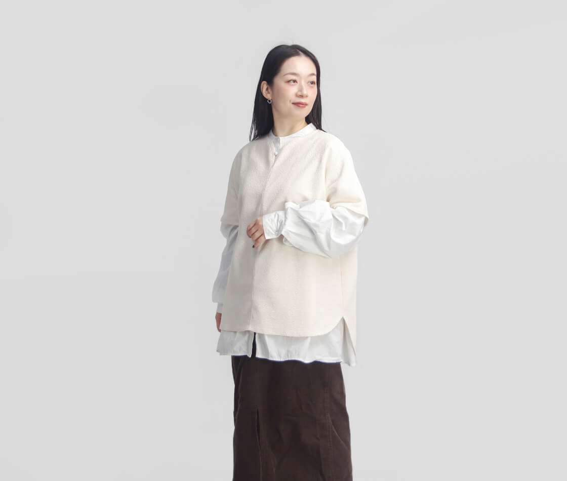 インナーやアウターとの組み合わせ次第で季節をまたいで活躍し、ロングシーズン着回しやすい一着です。