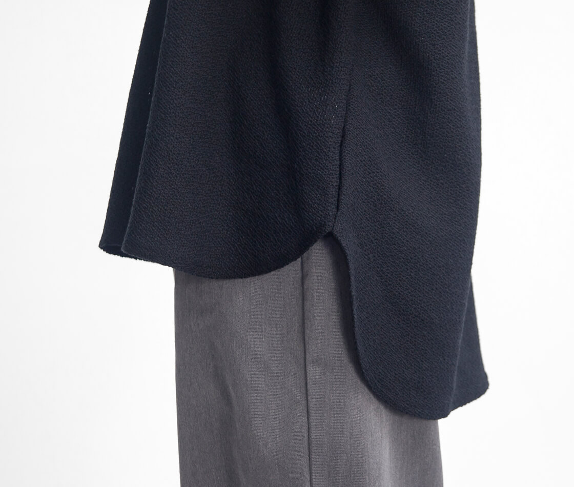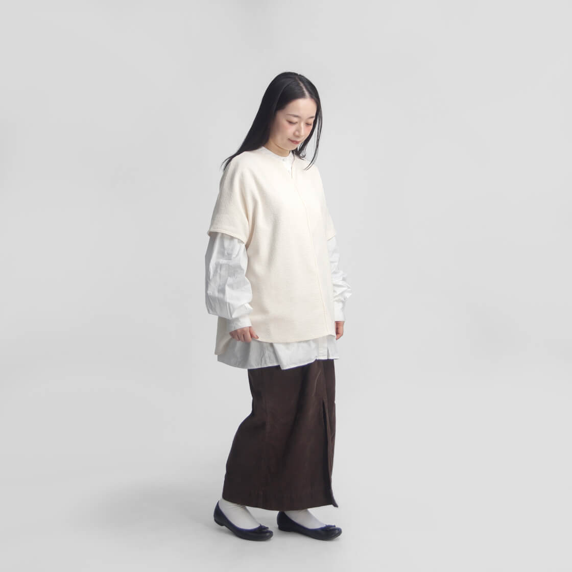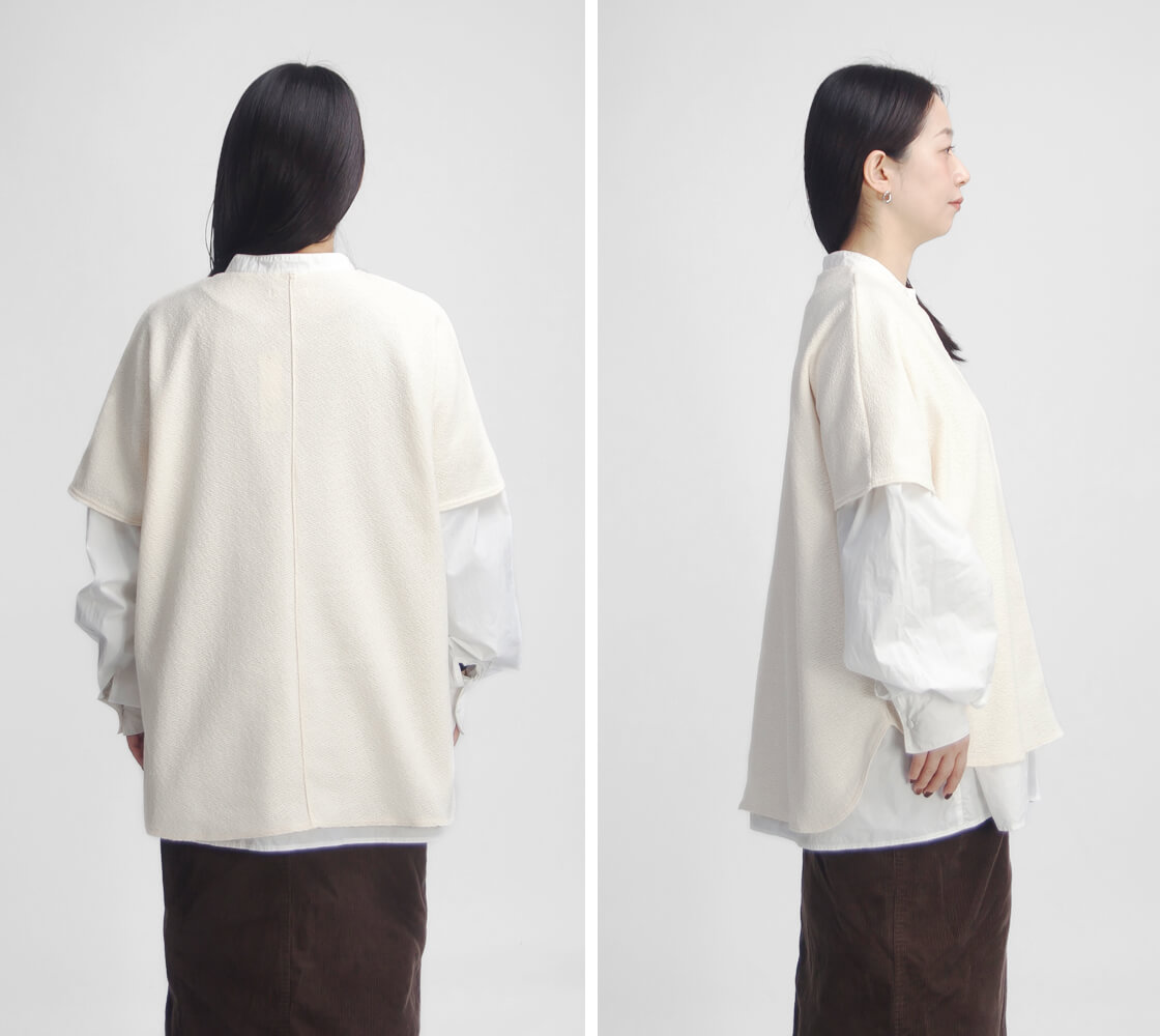 肩先からなだらかに落ちるフレンチスリーブですが半袖ほどの袖丈があり、ベスト感覚で着用できながらも、気になりがちな腕まわりを自然に包み込み、上品な印象に。ヒップまでしっかりと届く長めの着丈は安心感があり、前後で長さに差をつけることで、動きのある立体的なシルエットに。