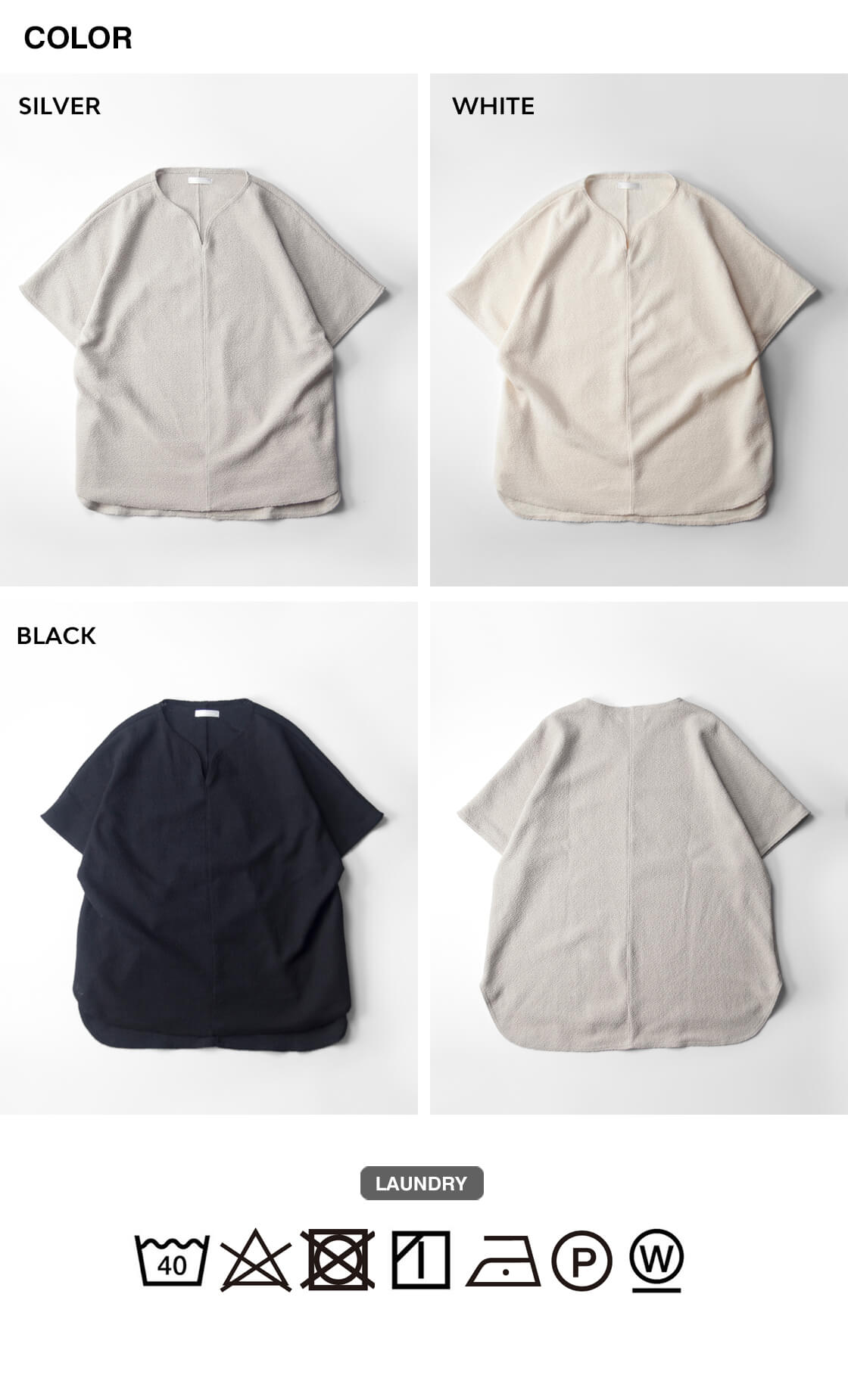 ゆったりとしたシルエットと、首回りも大きく開いているのでレイヤードのしやすいデザイン。シャツやカットソーとの重ね着はもちろん、1枚でトップスとして着用してもサマになるのが魅力。 肩先からなだらかに落ちるフレンチスリーブですが半袖ほどの袖丈があり、ベスト感覚で着用できながらも、気になりがちな腕まわりを自然に包み込み、上品な印象に。ヒップまでしっかりと届く長めの着丈は安心感があり、前後で長さに差をつけることで、動きのある立体的なシルエットに。 表面にほどよい凹凸を持つ梨地編み素材を使用。汗をかいても肌に張りつきにくく、長時間さらりとした着心地が続きます。素肌に触れても心地よく、インナーにタンクトップなど薄手のものを合わせれば、トップスとして1枚でも快適に過ごせます。軽量でストレッチ性があり、動きやすさも抜群。ドライタッチで快適ながら、しなやかな風合いで上品な印象を与えます。洗濯後もしわになりにくく、お手入れが簡単。速乾性に優れているため、お洗濯後すぐに乾くのも嬉しいポイントです。 インナーやアウターとの組み合わせ次第で季節をまたいで活躍し、ロングシーズン着回しやすい一着です。