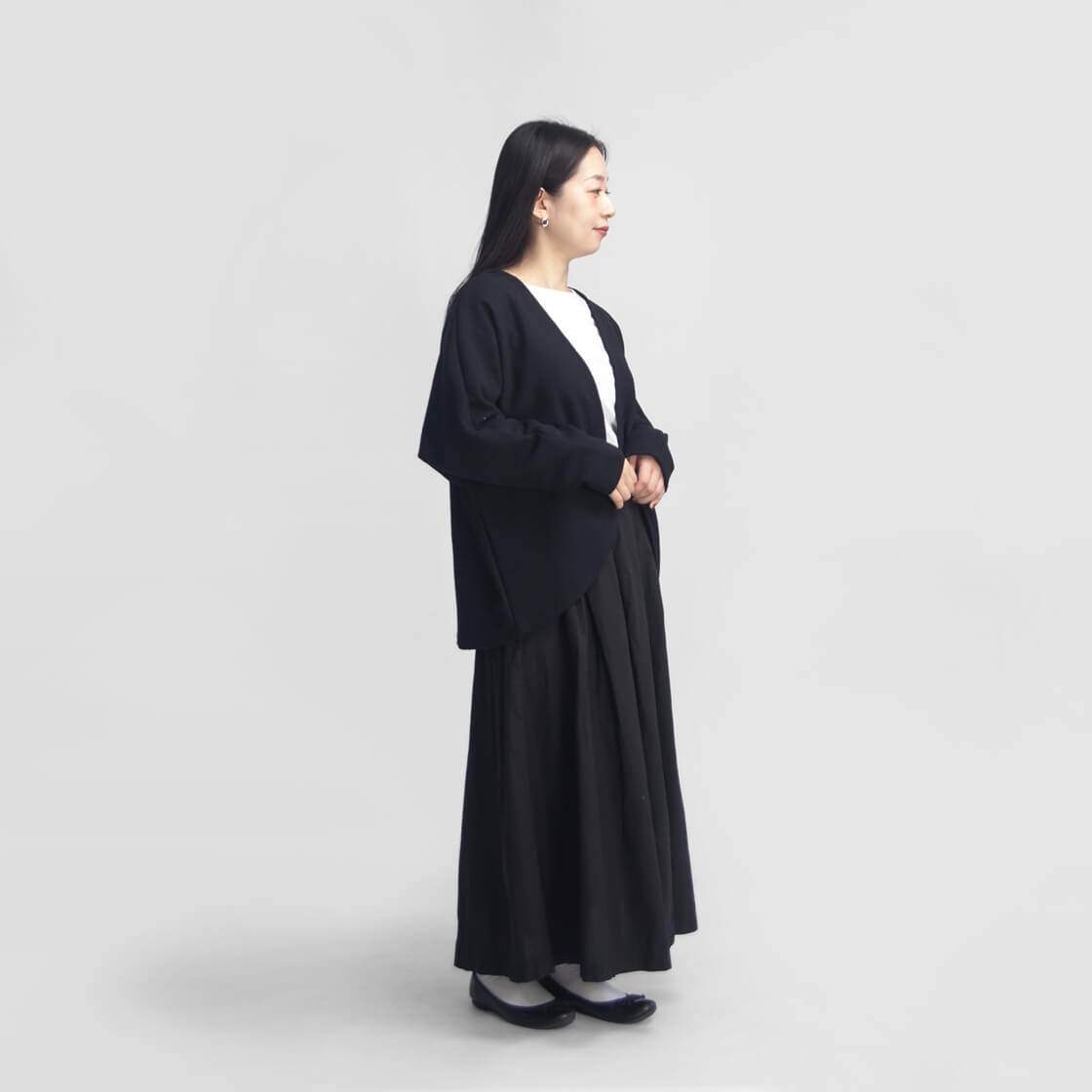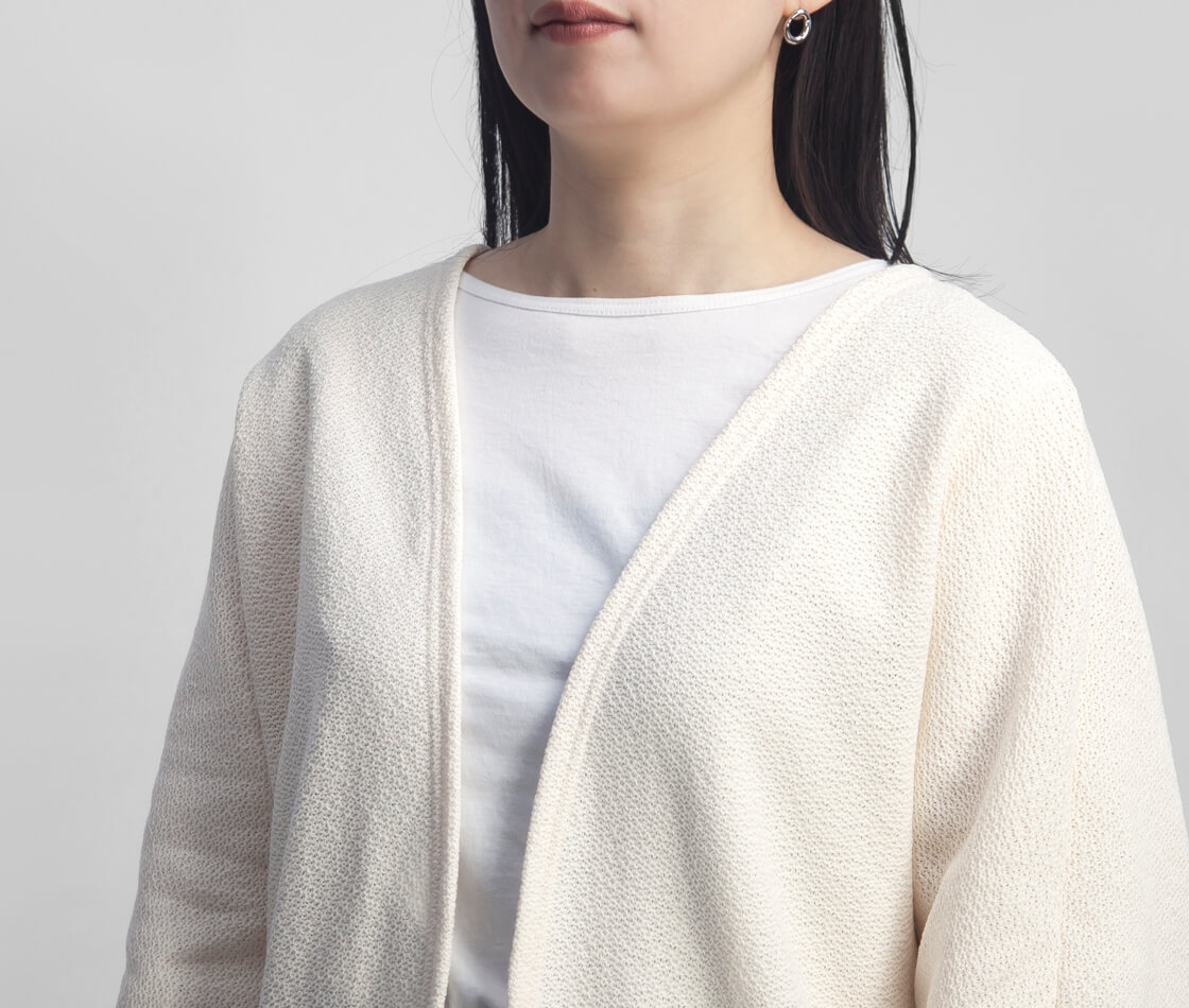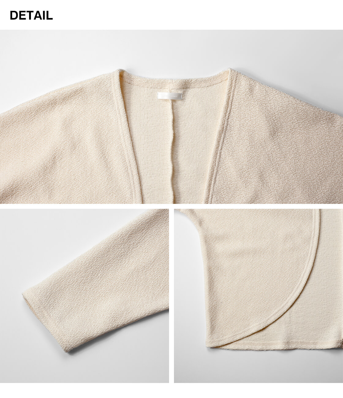 軽やかで快適な梨地編み素材のカーディガン。前身頃はボタンやファスナーを省いたオープン仕様で着脱がしやすく、忙しい朝や外出先でも気負わずさっと羽織れるデザインです。無駄をそぎ落としたミニマルなルックスながら、素材感とシルエットにこだわることで、上品で洗練された印象に。